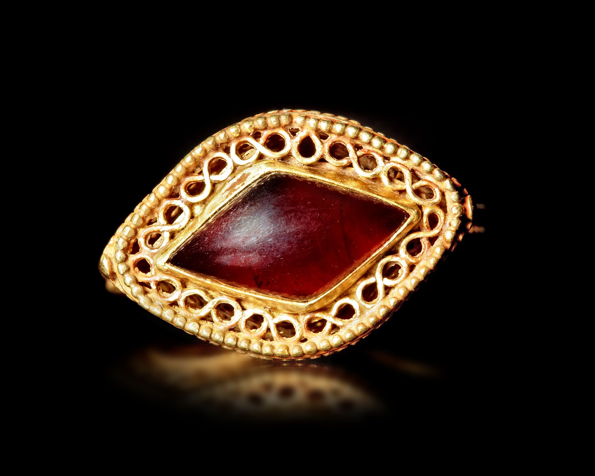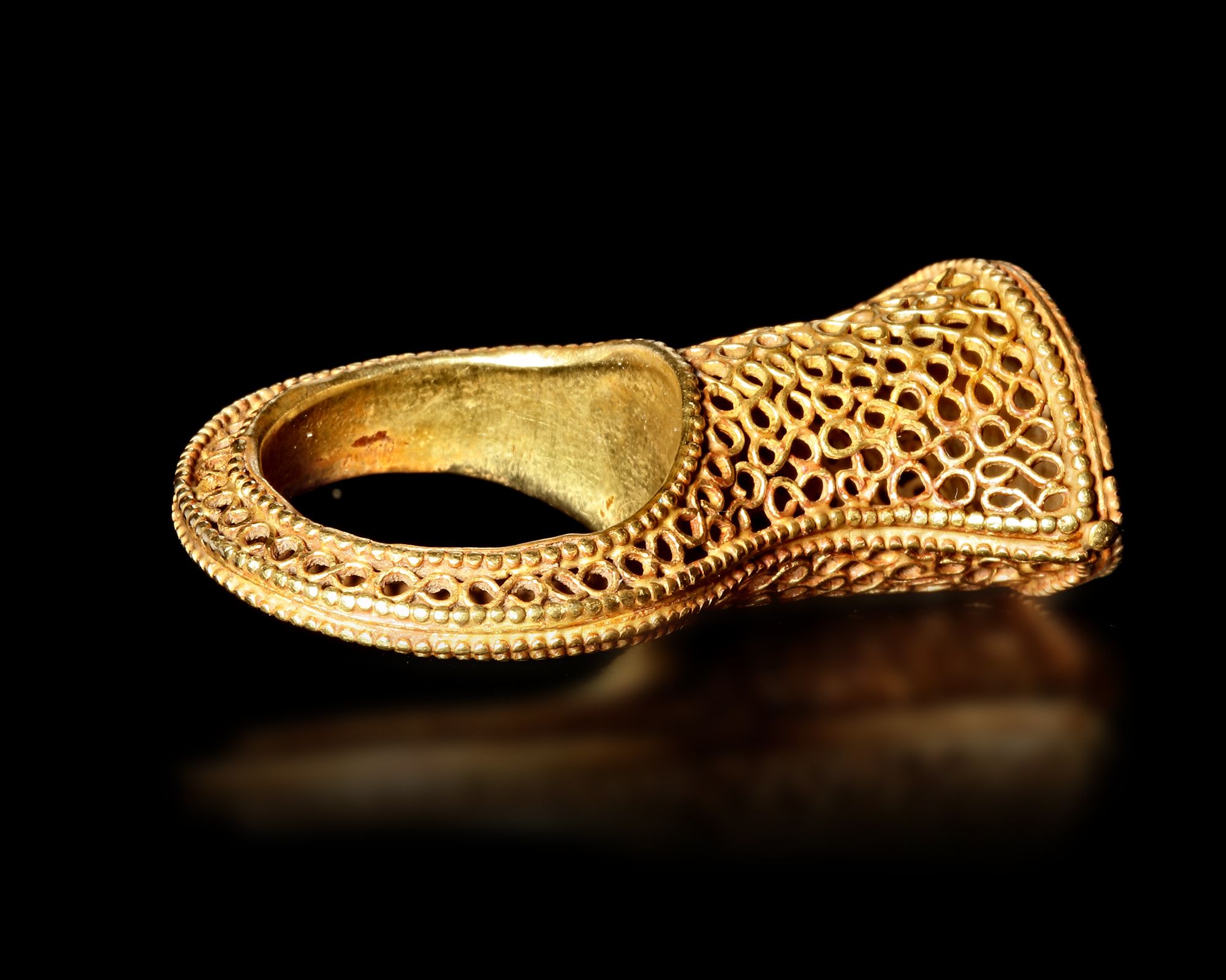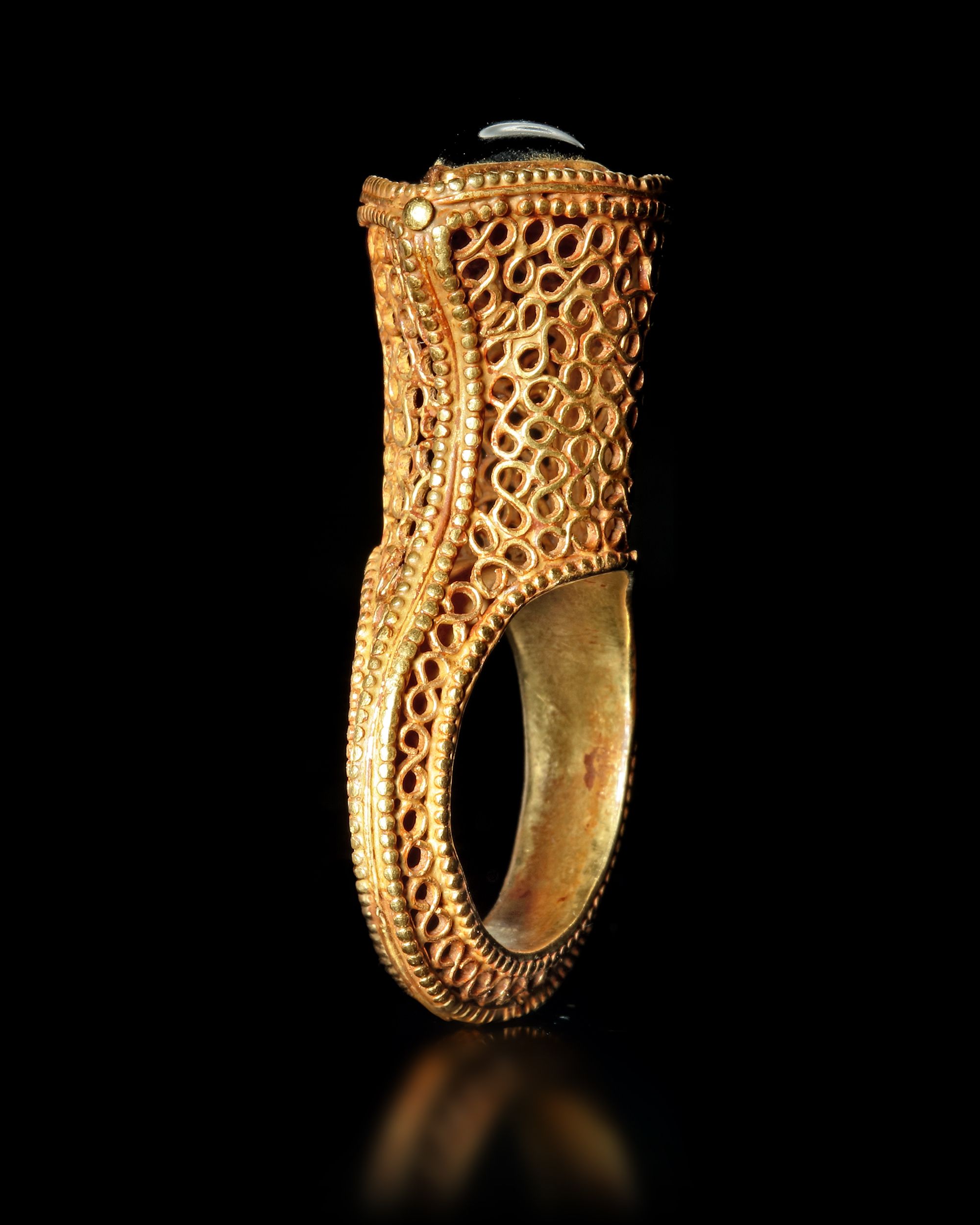 A large and elaborate gold ring from the 10/11th.c.AD. This exceptional ring shows off the extraordinary skill and virtuosity of the jewelers of the early islamic period. The ring is built up of '8' shaped elements made of flattened wire which are then filigreed to each other to form a sheet which is then fashioned into the required shape. The shank is lined from the inside by a plain gold sheet while all the other edges are formed by a beaded wire running along the joins.The bezel is in the form of a lozenge, and a cabochon garnet is set into the centre, held on a mount surrounded by a plain wire. The technique produced what in effect is a 'cage' of strength yet great lightness, a truly remarkable achievement. It is for this factor that the technique was never used again in later times.