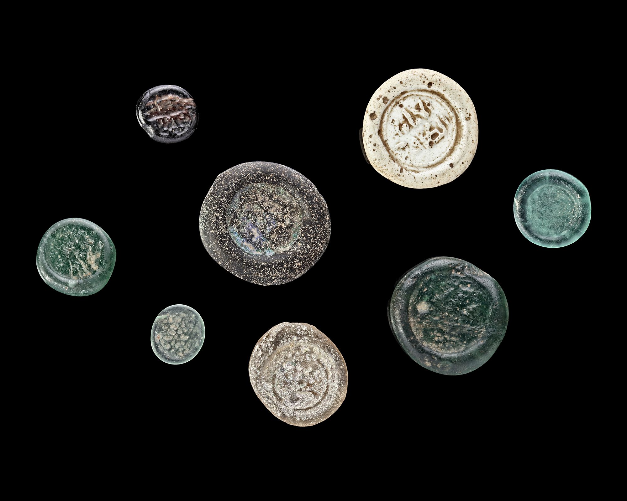 A Glass weight, moulded and stamped, transparent pale-green in colour, citing in the centre with the name Al-Imam Ma'ad (427-487 AH/1036-1094 AD), 1.298 g., 15 mm. coin weight: half dirham. B 298, N 102-104.