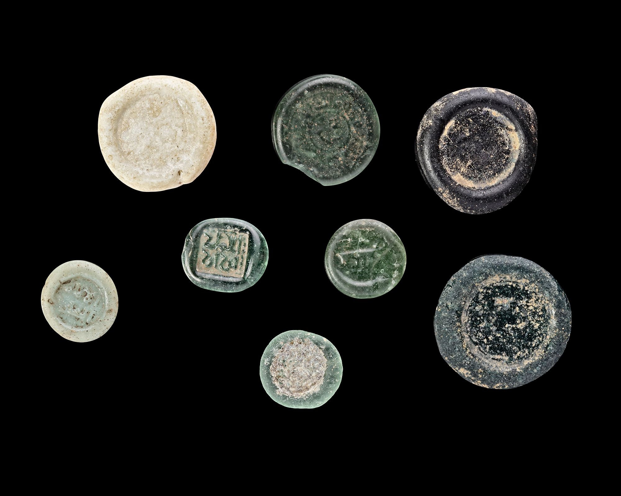 A Glass weight, moulded and stamped, transparent pale-green in colour, citing in the centre with the name Al-Hakim bi-Amr Allah (386-411 AH/996-1021 AD), 1.337 g., 27.6 mm. coin weight: half dirham.