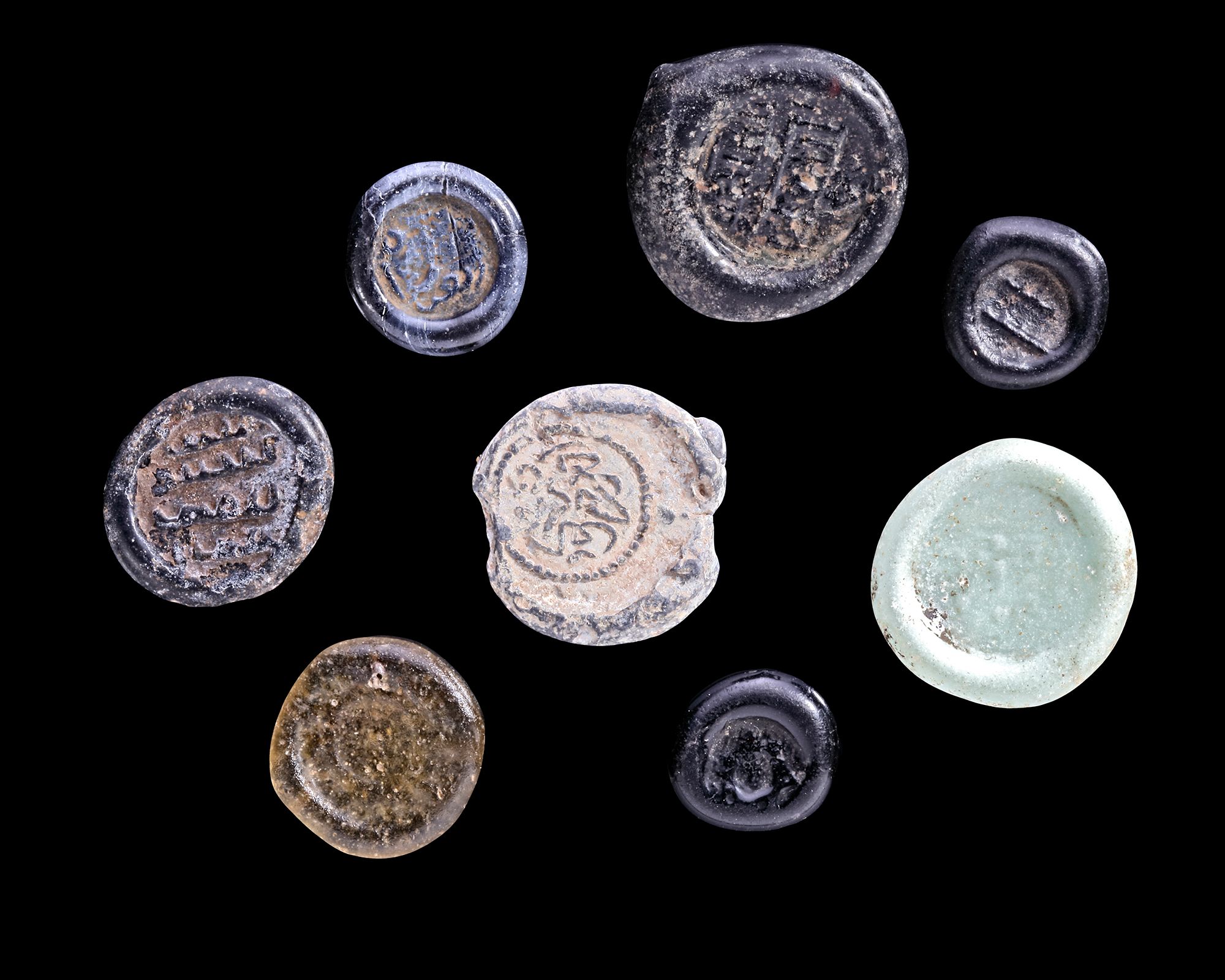 A Glass weight, moulded and stamped, opaque dark-black in colour, citing in the centre with 2 lines of undeciphered Arabic text, 1.506 g, 14 mm, coin weight: half dirham.