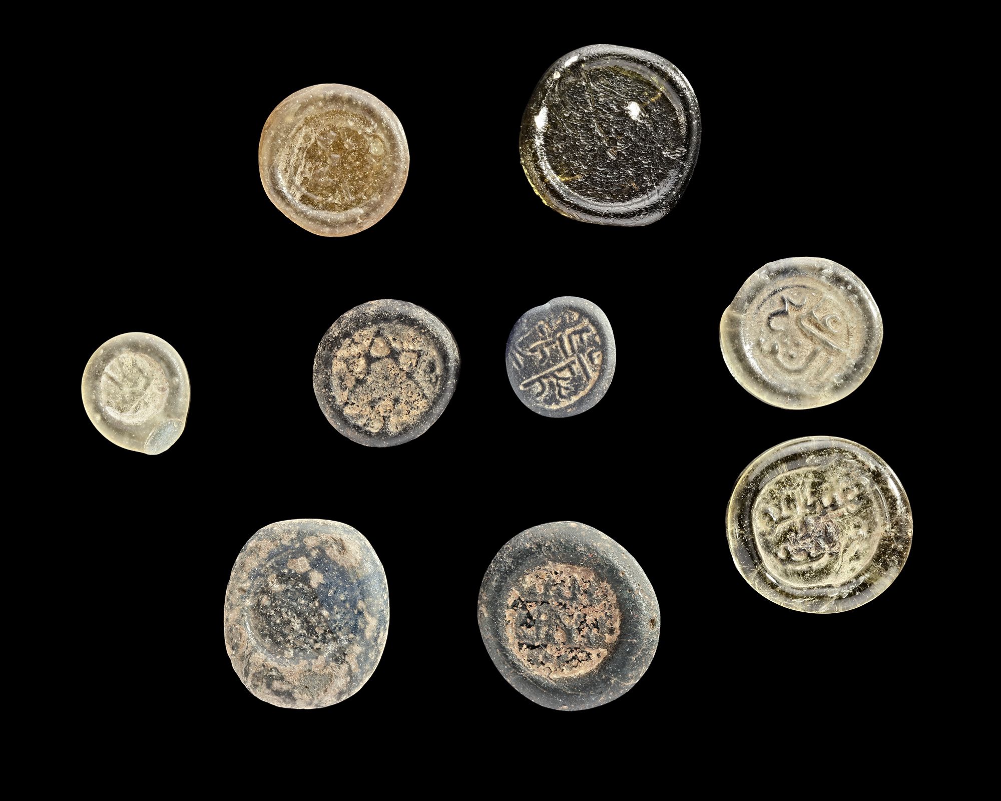 A Glass weight, moulded and stamped, opaque dark-blue in colour, citing in the centre with " Adad Alid".1.313g, 15 mm, coin weight: half dirham.
