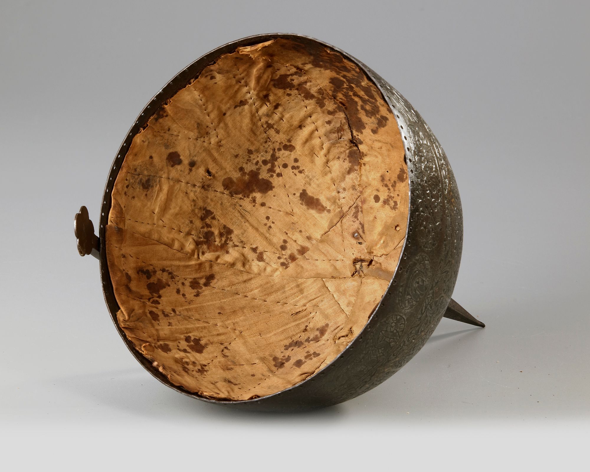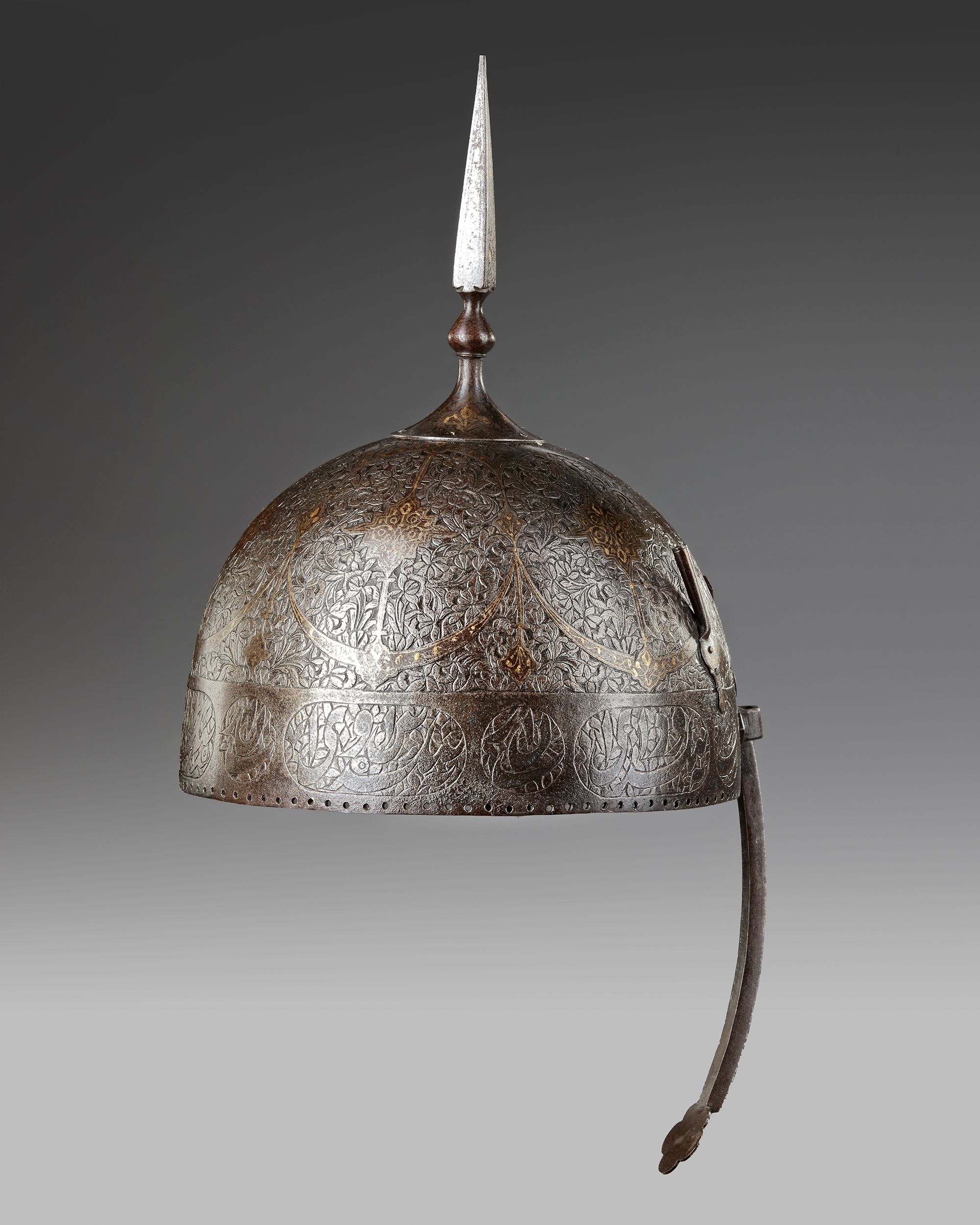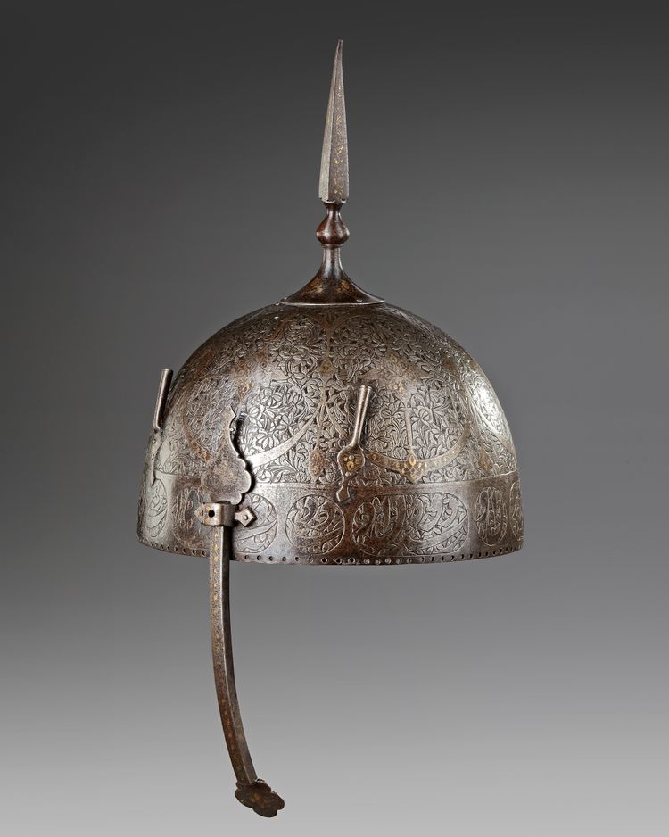 The hemispherical helmet is formed of one hand-forged steel plate, with a stout mounted long spike at the top, a movable nose guard flanked by two plume holders, engraved with roundels enclosing floral scrolls with gold decoration, the rim with calligraphic cartouches of inscriptions in natasli'q script.