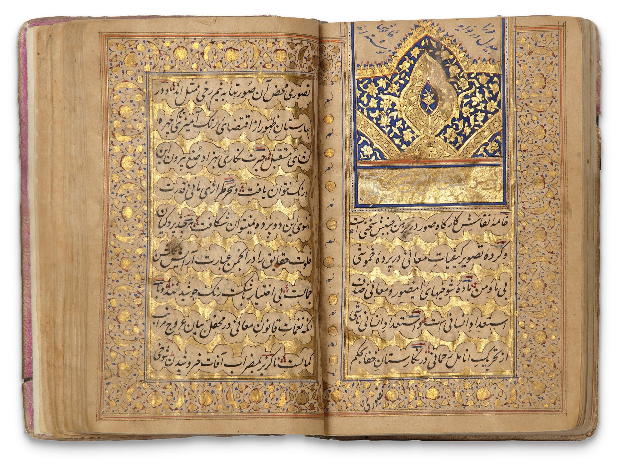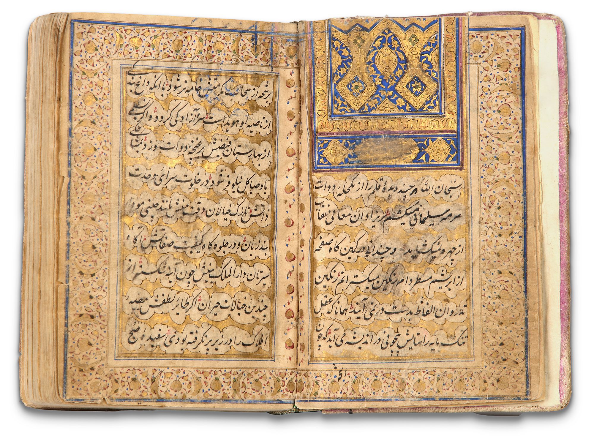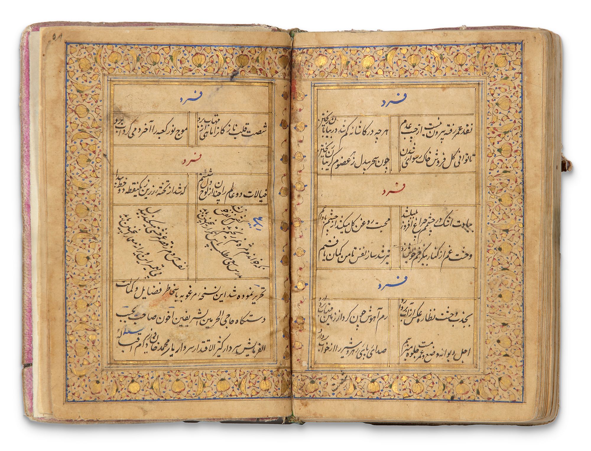 Poetry, Persian manuscript on paper, each folio with 9ll. of elegant black nasta'liq script arranged in two columns and divided by a gold double borders, the text ruled in blue and gold borders, headings in red and blue ink, two opening folios with elegant illuminated headpiece, the text reserved in clouds on a gold ground, other four pages throughout the book similarly decorated, final folio with illuminated margins and signed " written by the order of Sardar Yar Mohammad Khan".