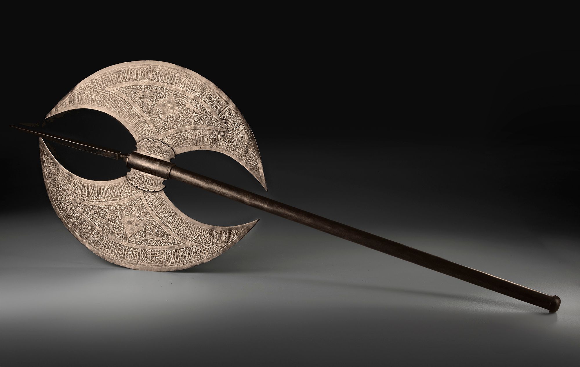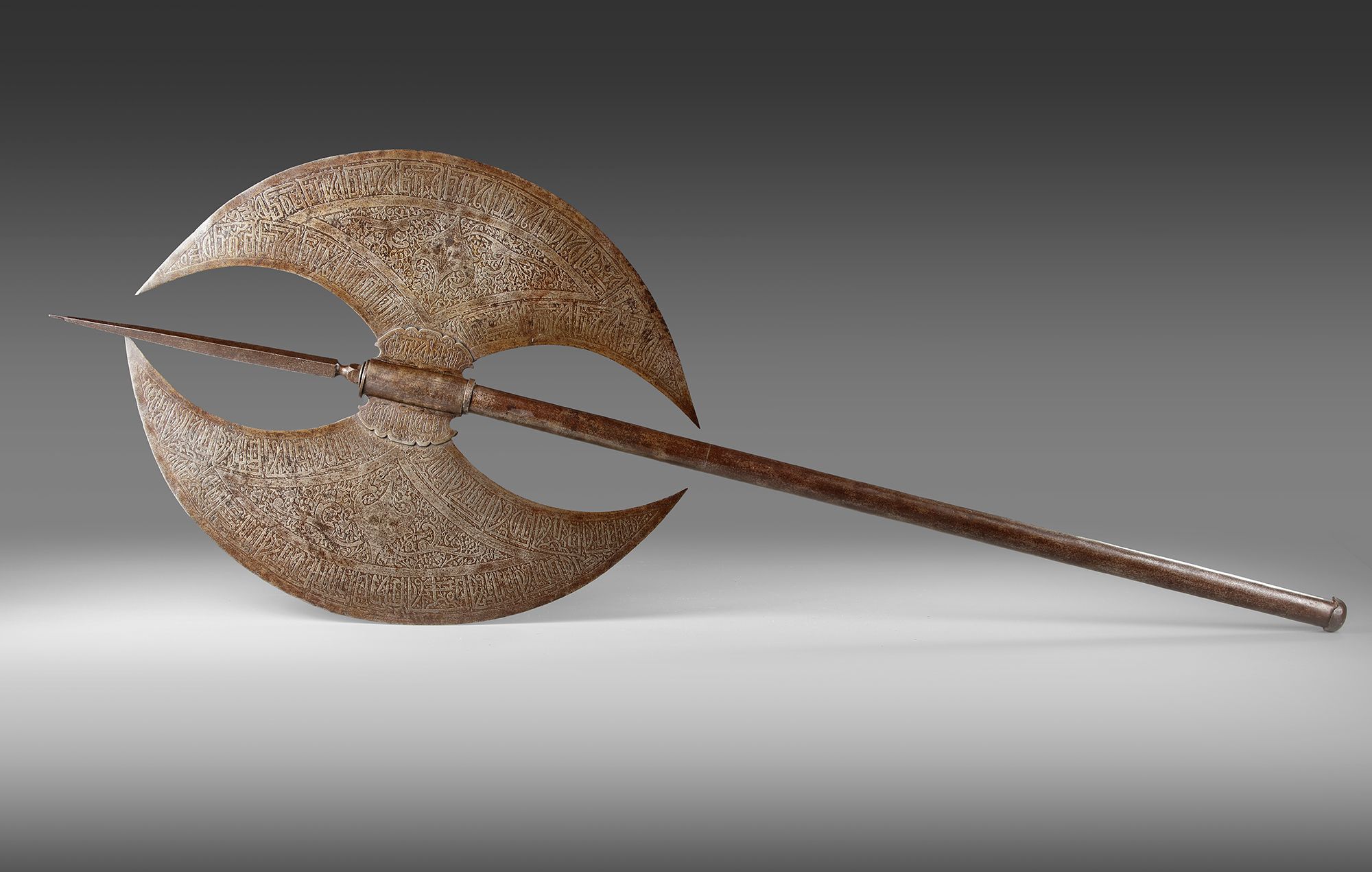 A Persian axe two crescent shaped blades etched with scrolling foliage surrounded by a calligraphic band of angular kufic script. 110 by 39 cm.