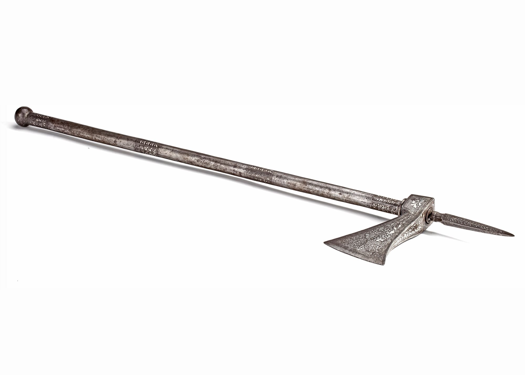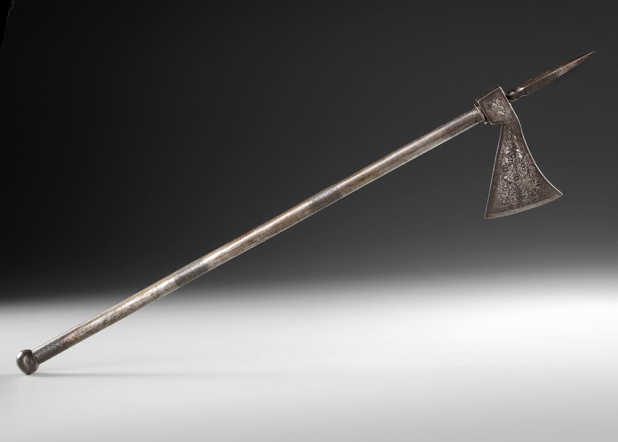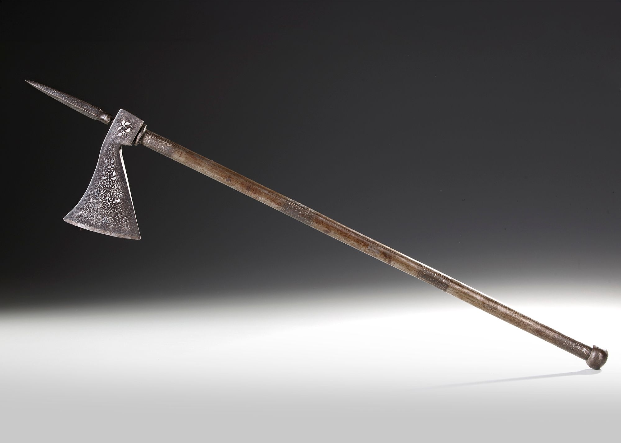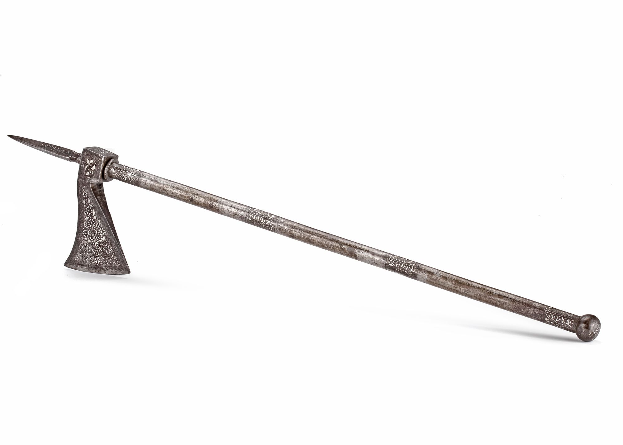 With iron head with crescentic cutting-edge and squared pean, the upper and lower flats each finely decorated with gold-damascened foliage.