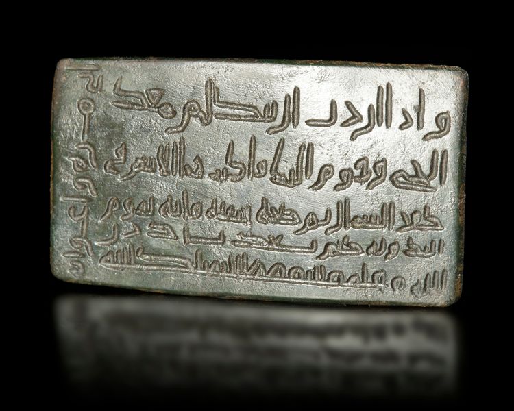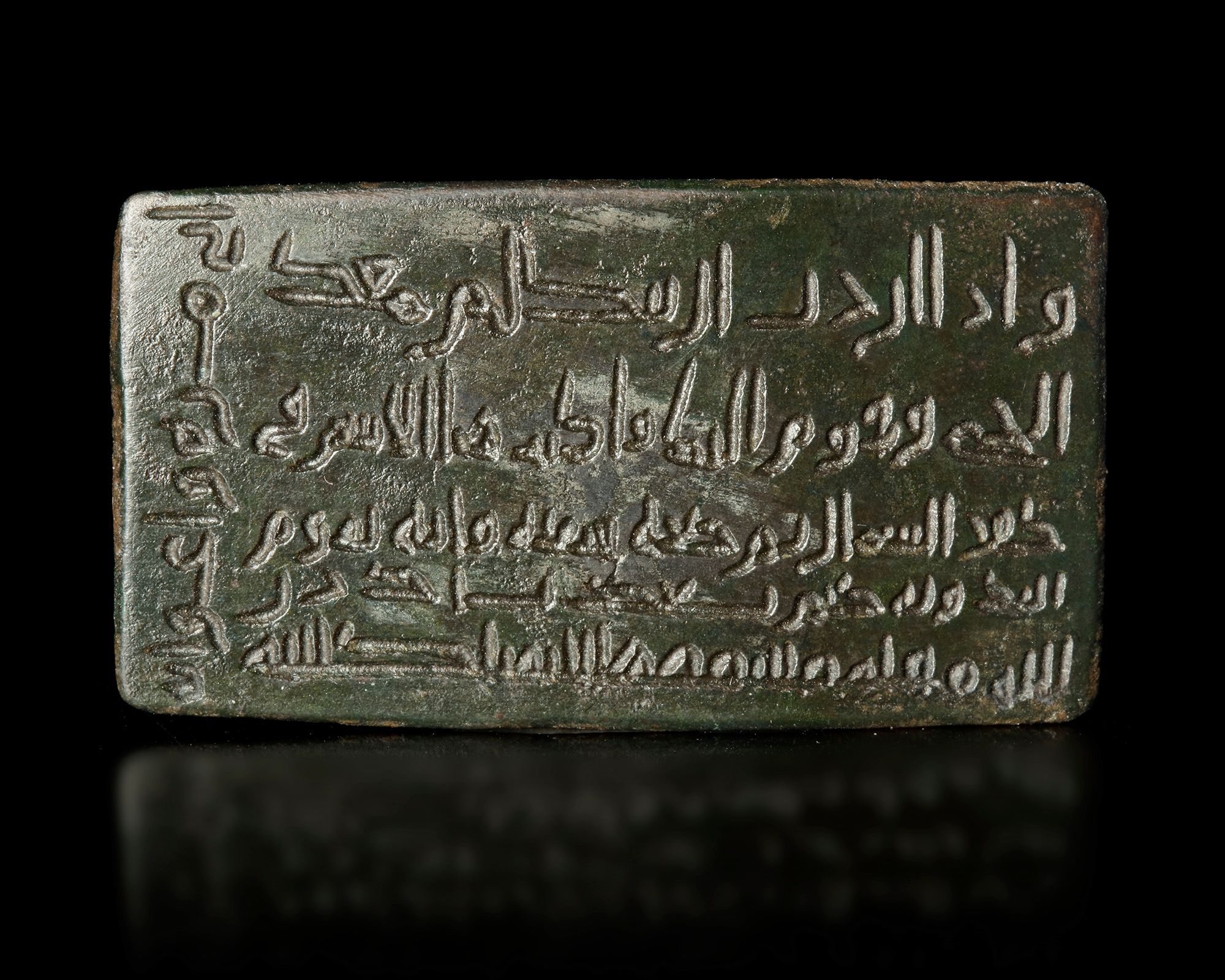 A small bronze plaque engraved with five lines in kufic script. 2.3 by 4.3 cm