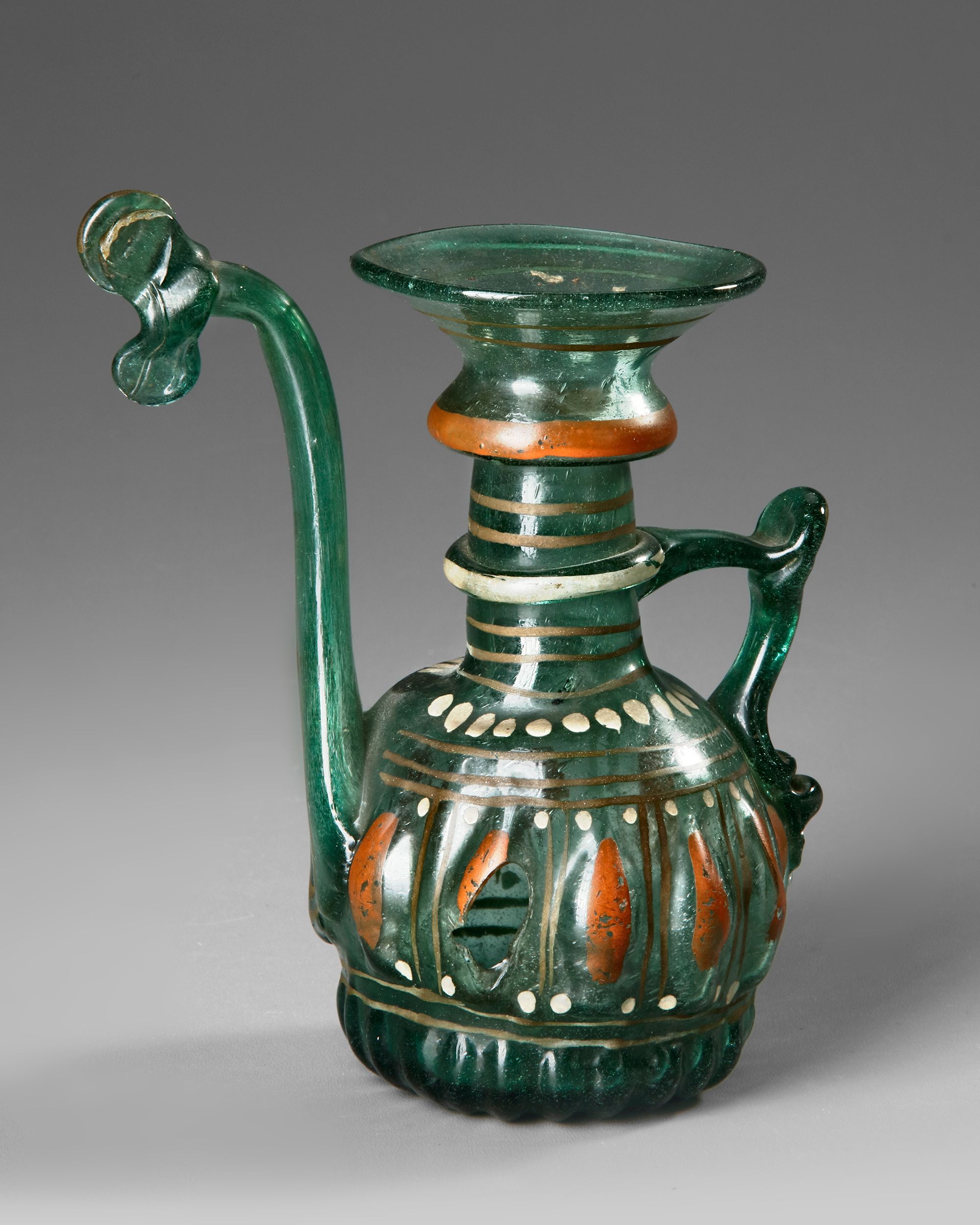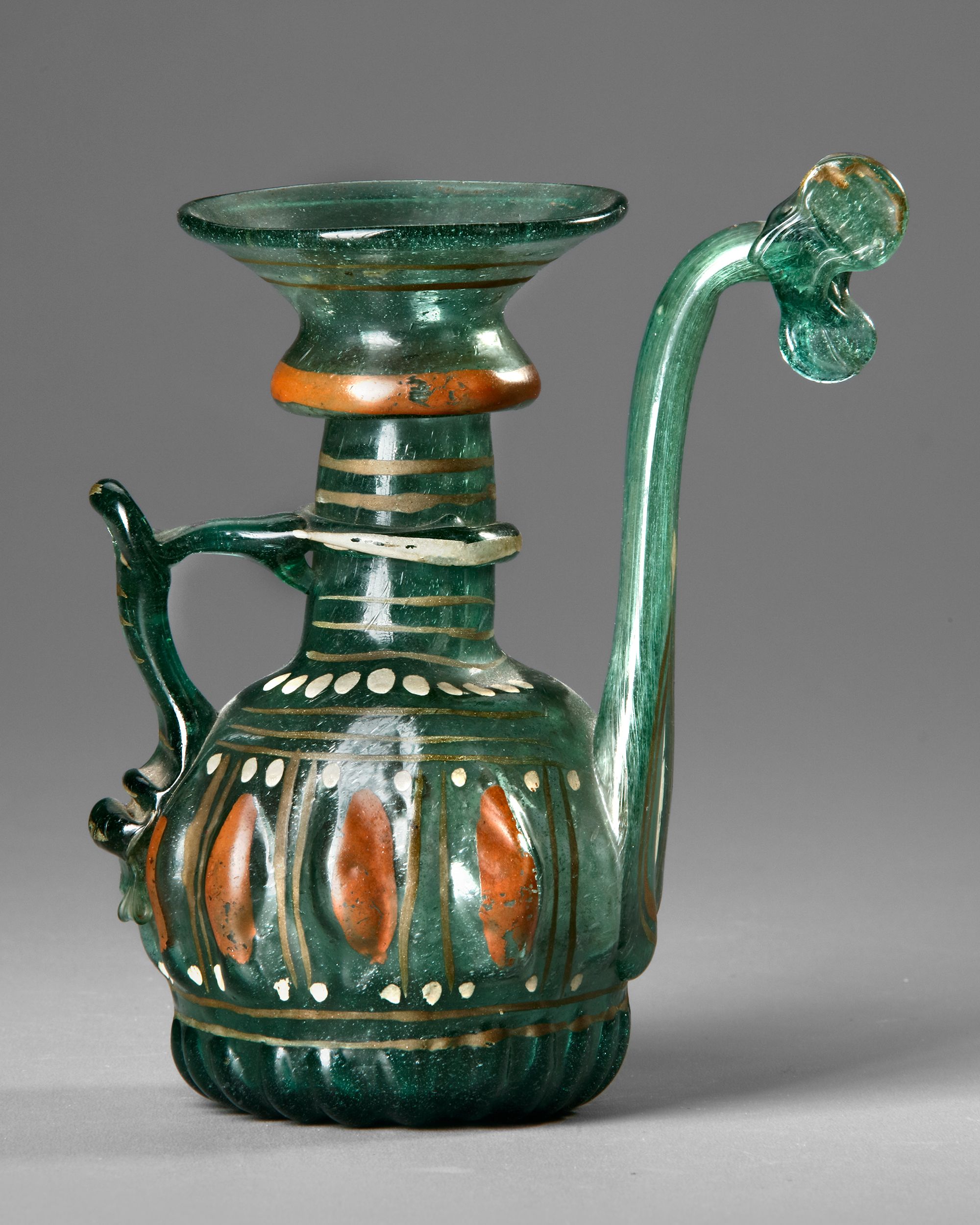 These types of wares–with a flared mouth and bulbous body– were produced in vivid blues and greens, illustrating the range of colors employed by glassmakers in the 18th and 19th centuries. These vessels were admired for their graceful shapes and often decoratively displayed within niches of private and public buildings in Tehran, Isfahan, and Shiraz. The end of the spout is decorated with an applied 'butterfly' in the same color of green, suggests the object may have been more decorative than functional.