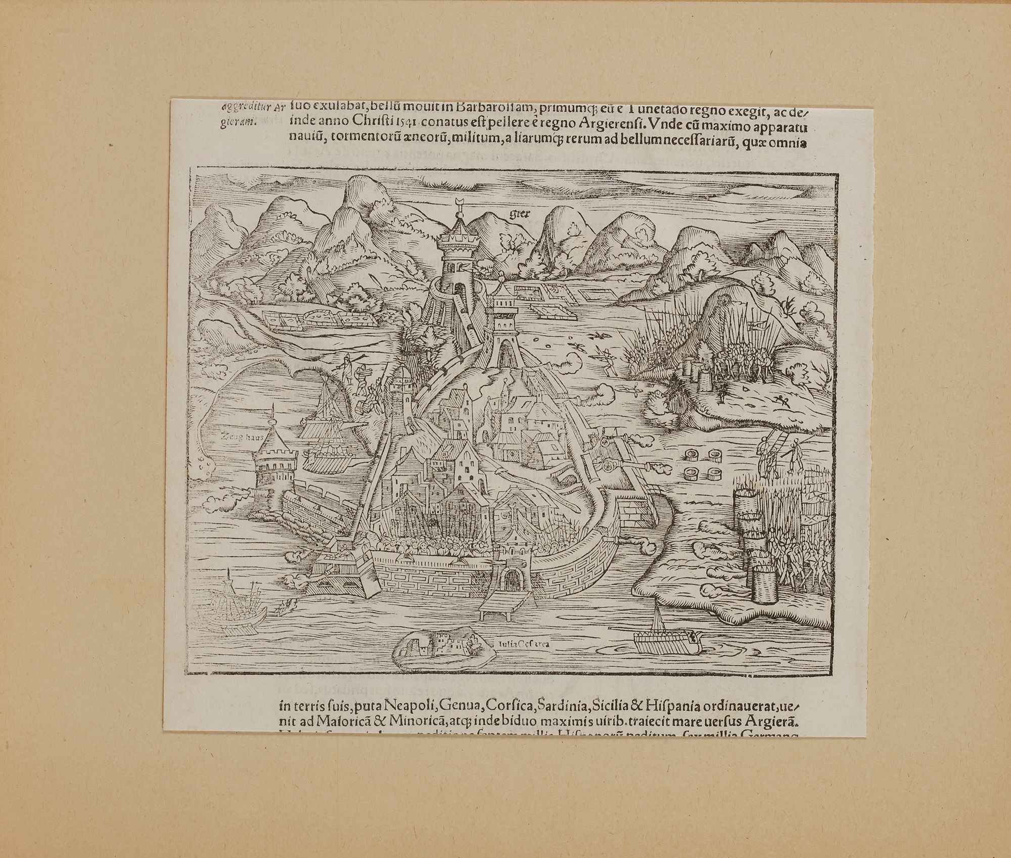 An Early view of Algiers ca 1580, from the Cosmographia " with text in Latin", woodcut, by Sebastian Munster ( 1488-1552), 14 by 18 cm.
