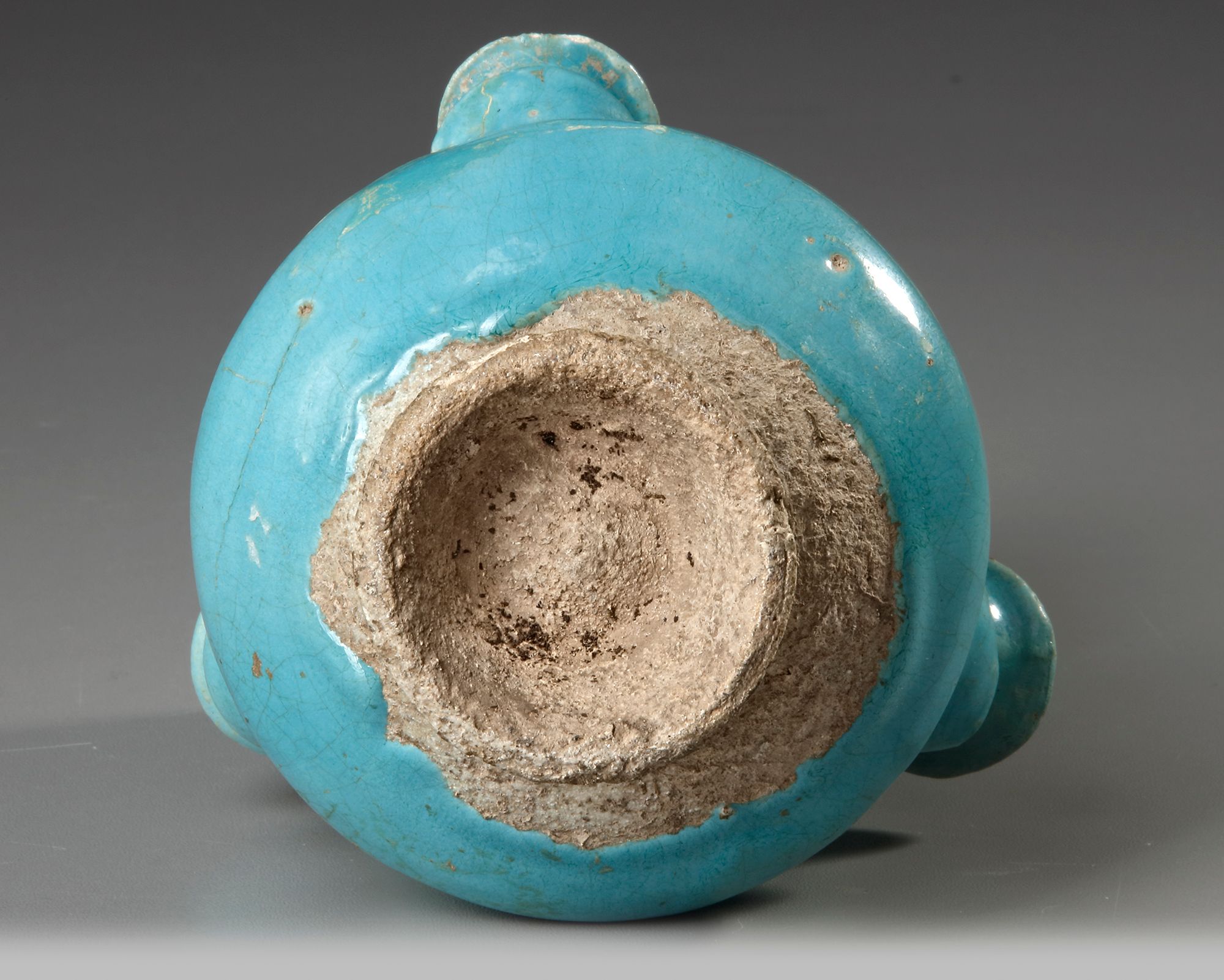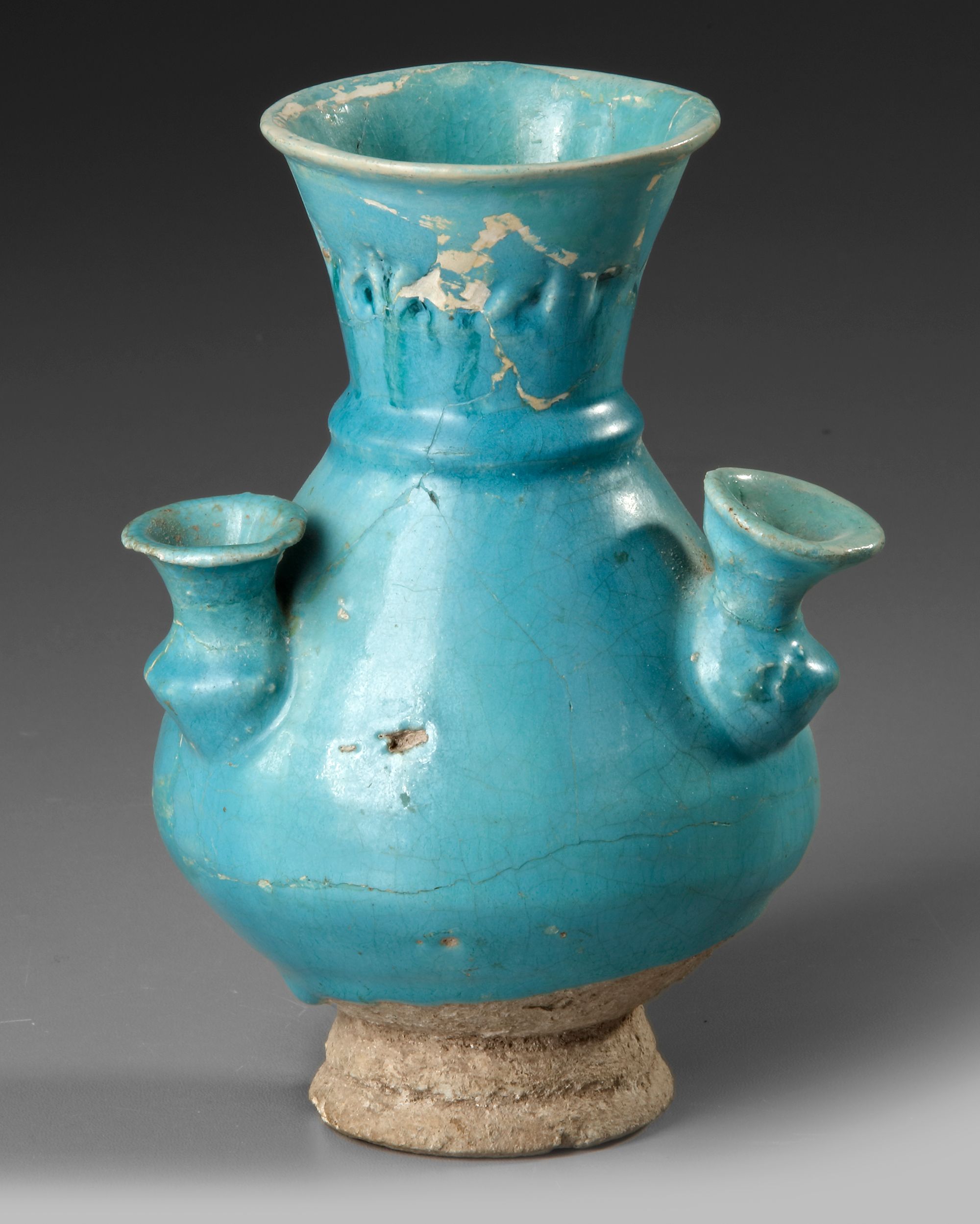 A Persian pottery vase resting on a short spreading foot, the globular body with three receptacles for flowers, tapering towards neck and flaring at mouth, the mouth with slightly everted rim and ringed at the base, cover with a turquoise glaze stopping the base exposing the buff ware.
