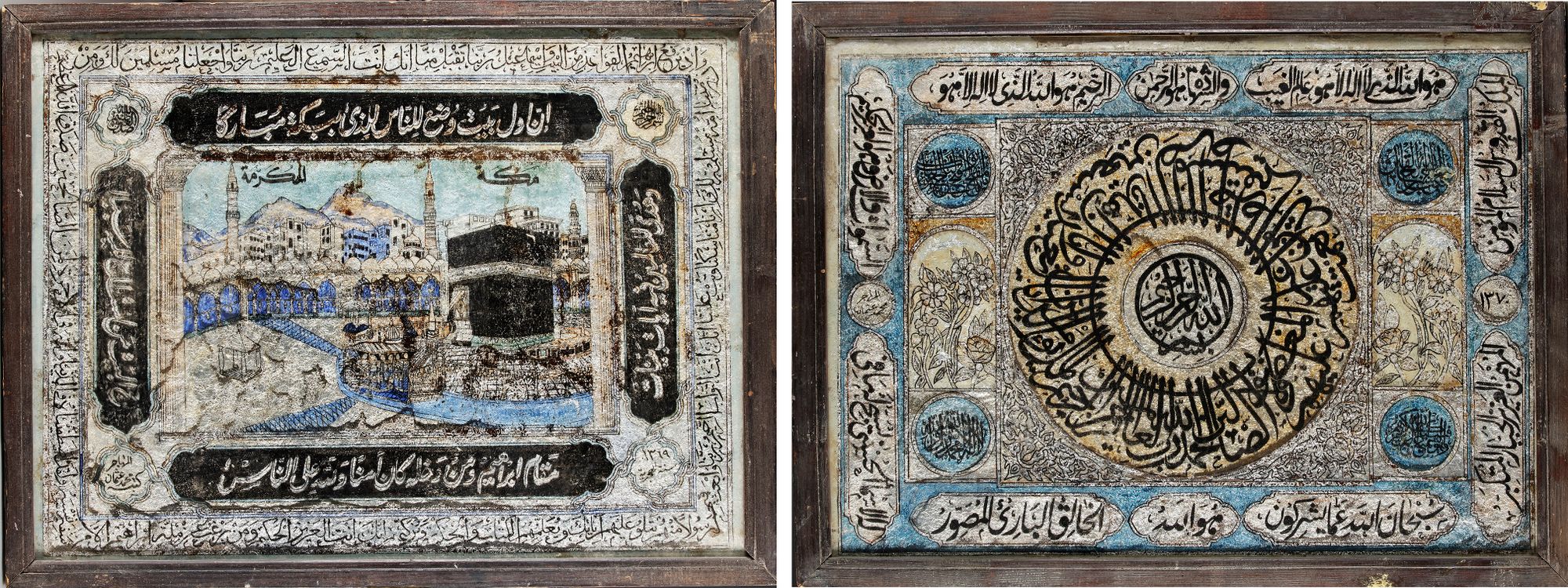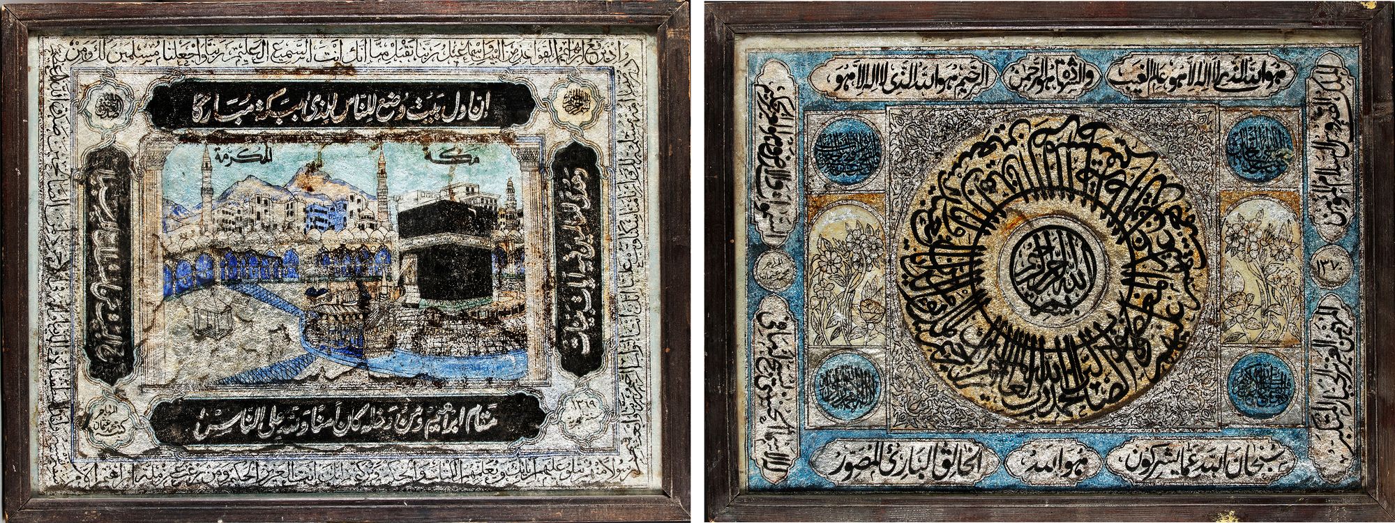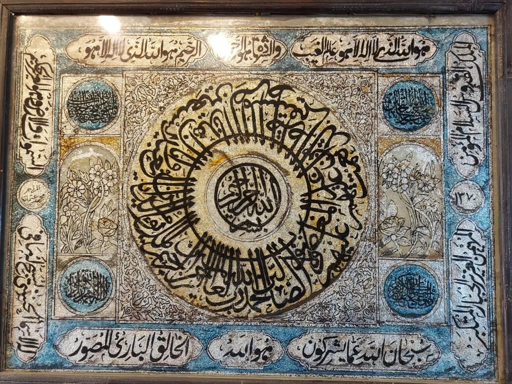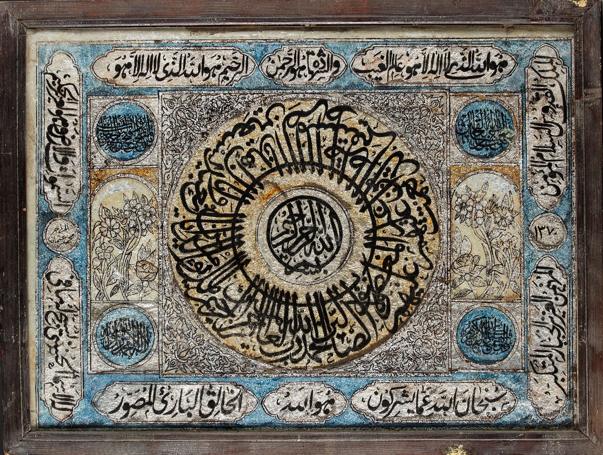 Condition: the glass painting depicting a roundel of surah al Fatiha is partly broken.(1)