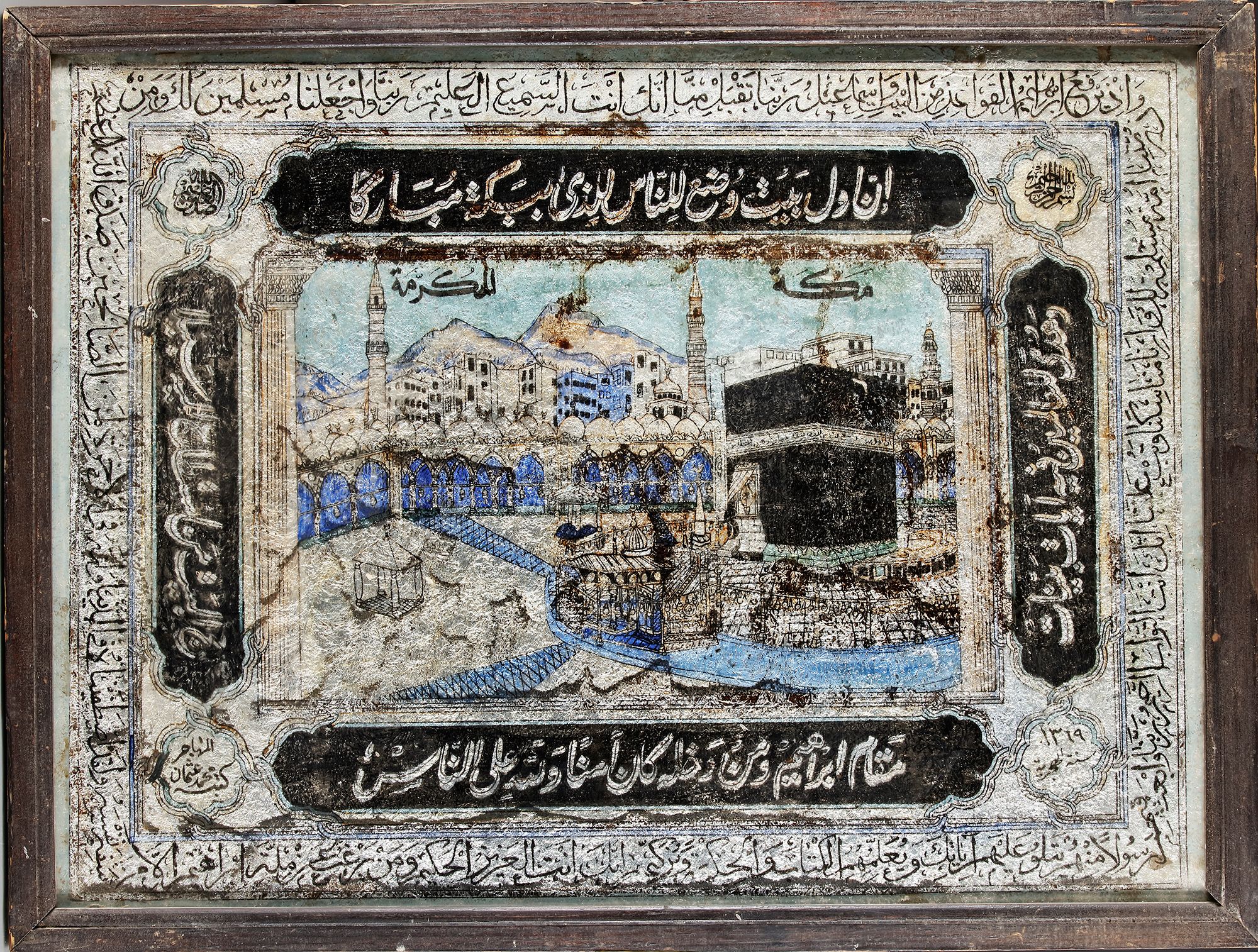 A reverse- glass painting depicting al-Masjid al-Haram in Mecca and dated 1319 AH/1901 AD.