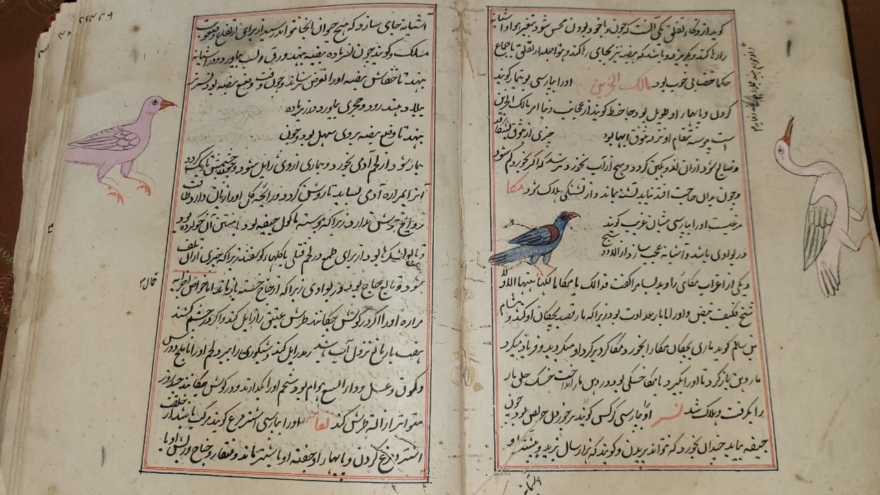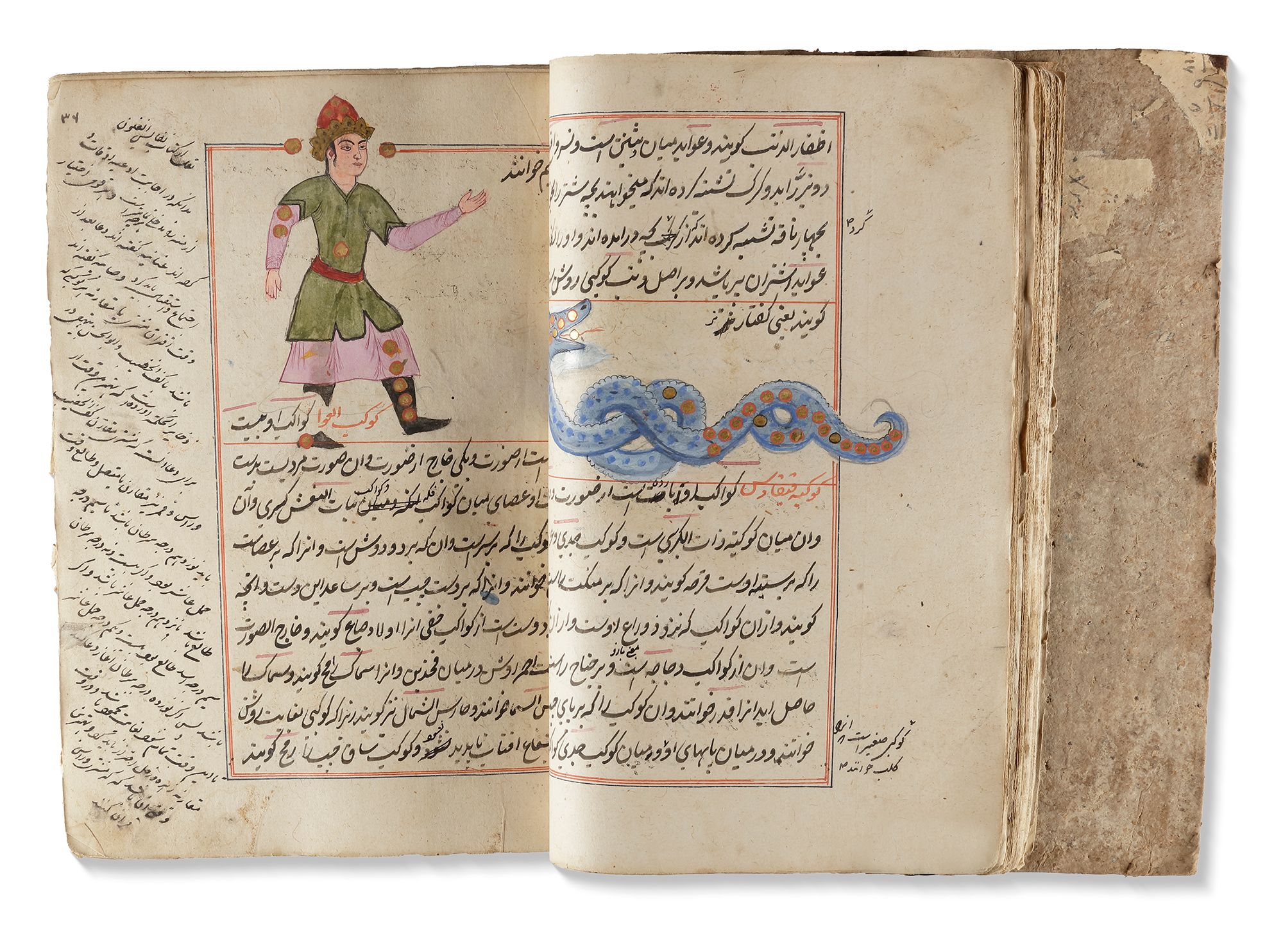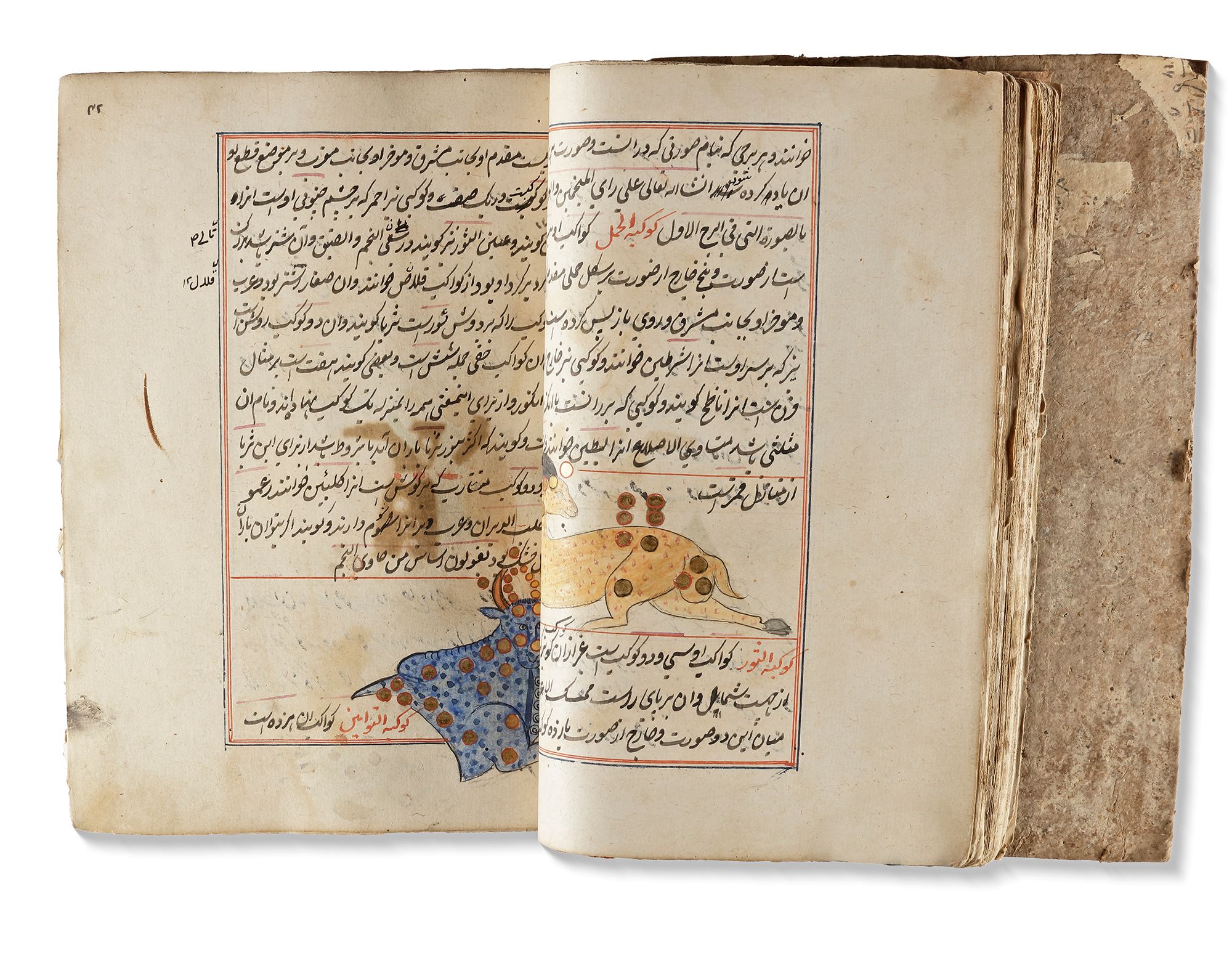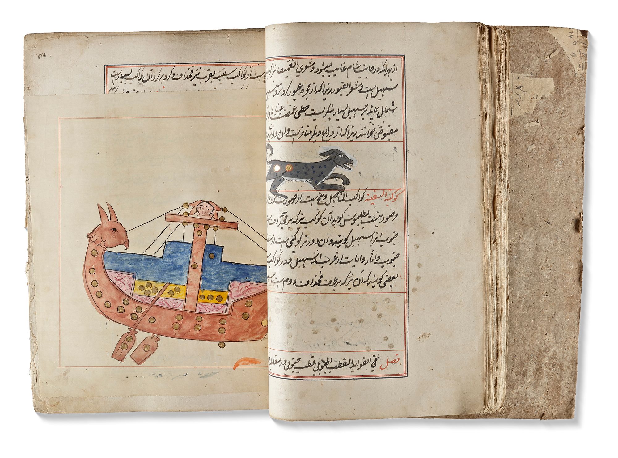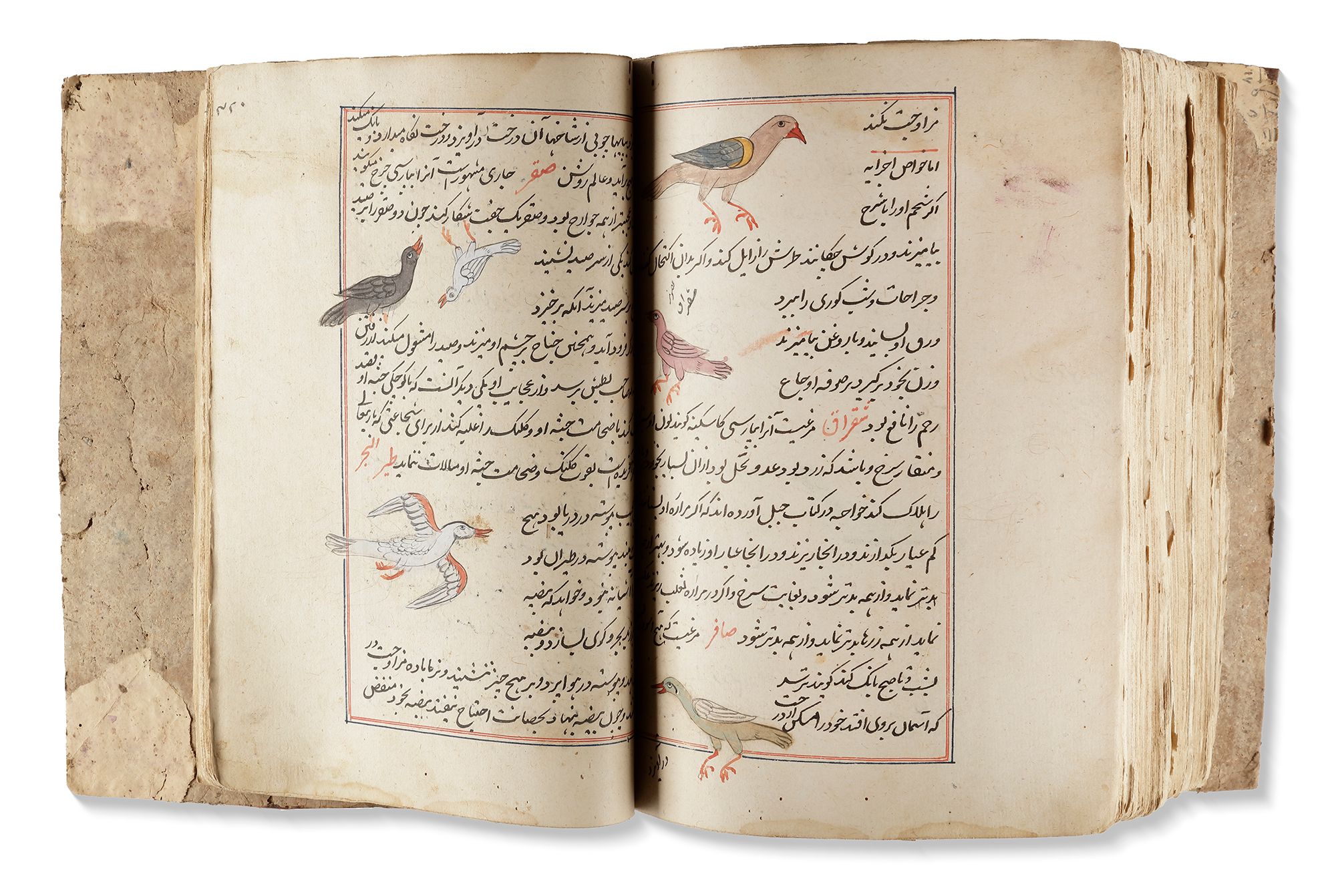 Persian manuscript on paper, 454 ff. with 15ll. to each page written in black ink, titles and catchwords in red ink, throughout the book many illustrations of the discussed creatures in gouache colours heightened with gilt, the text ruled in red and blue ink. In deep red leather binding.