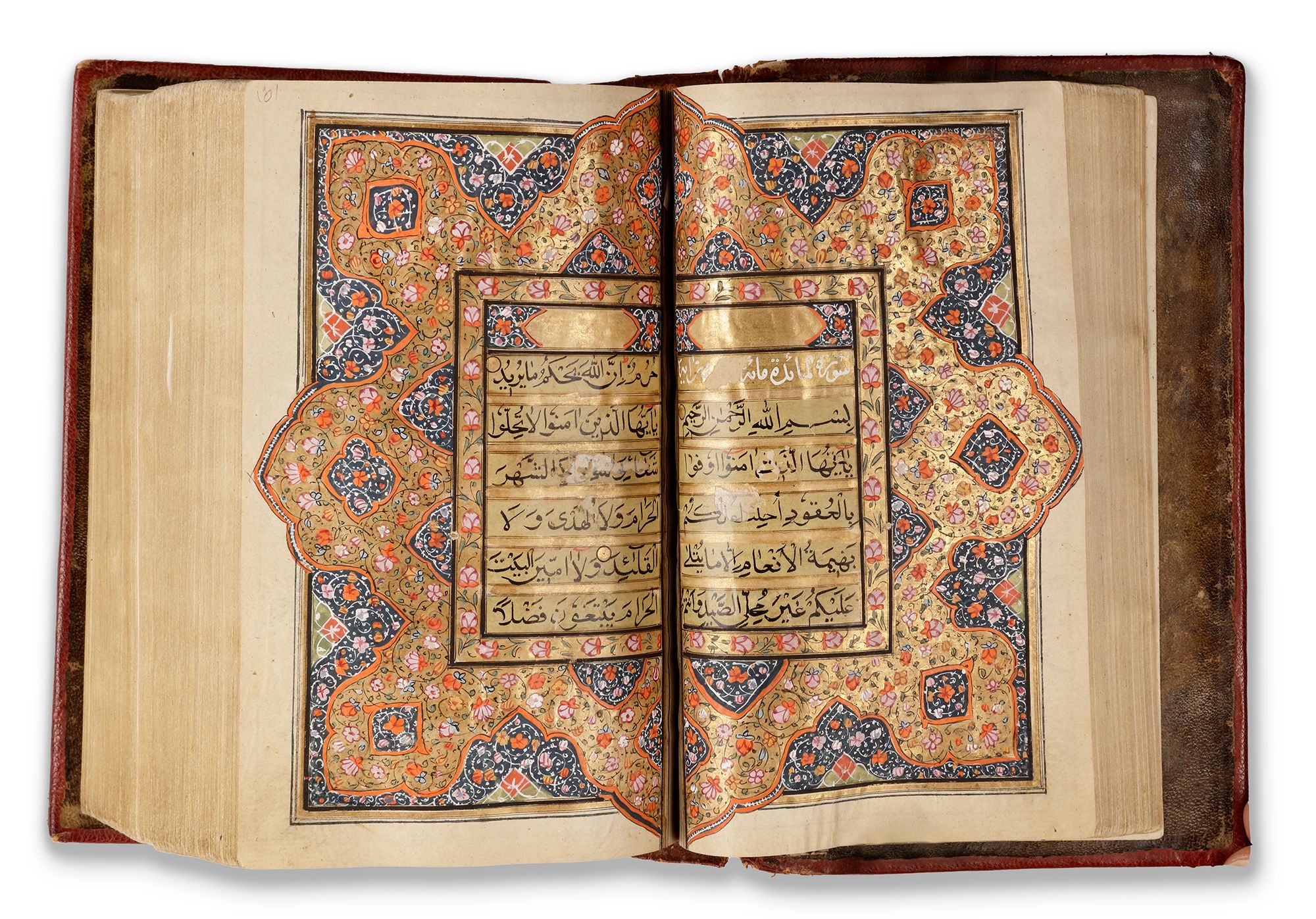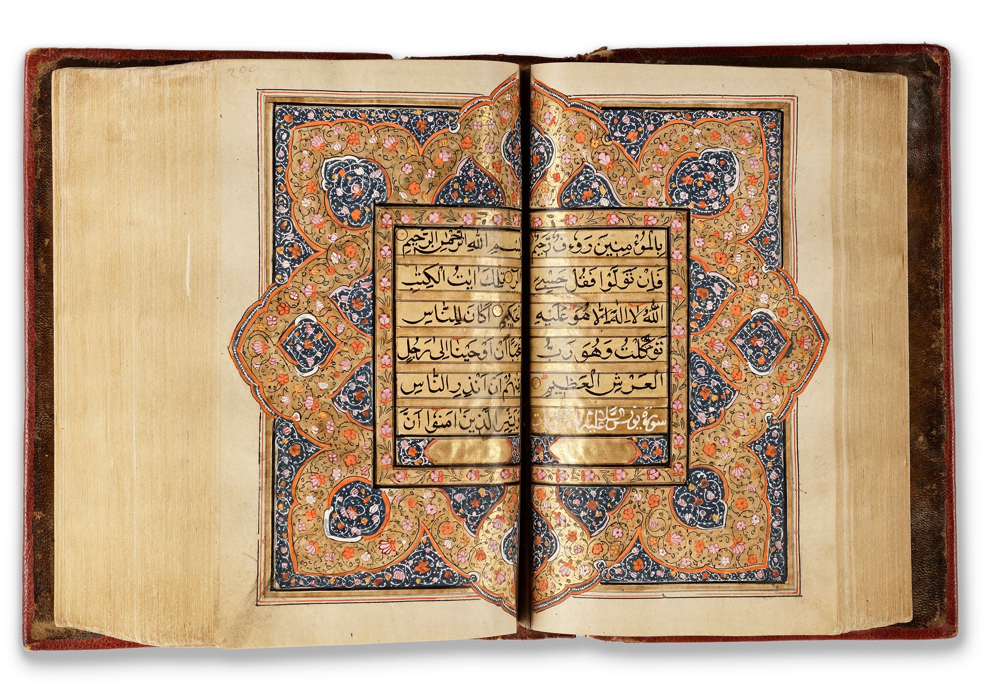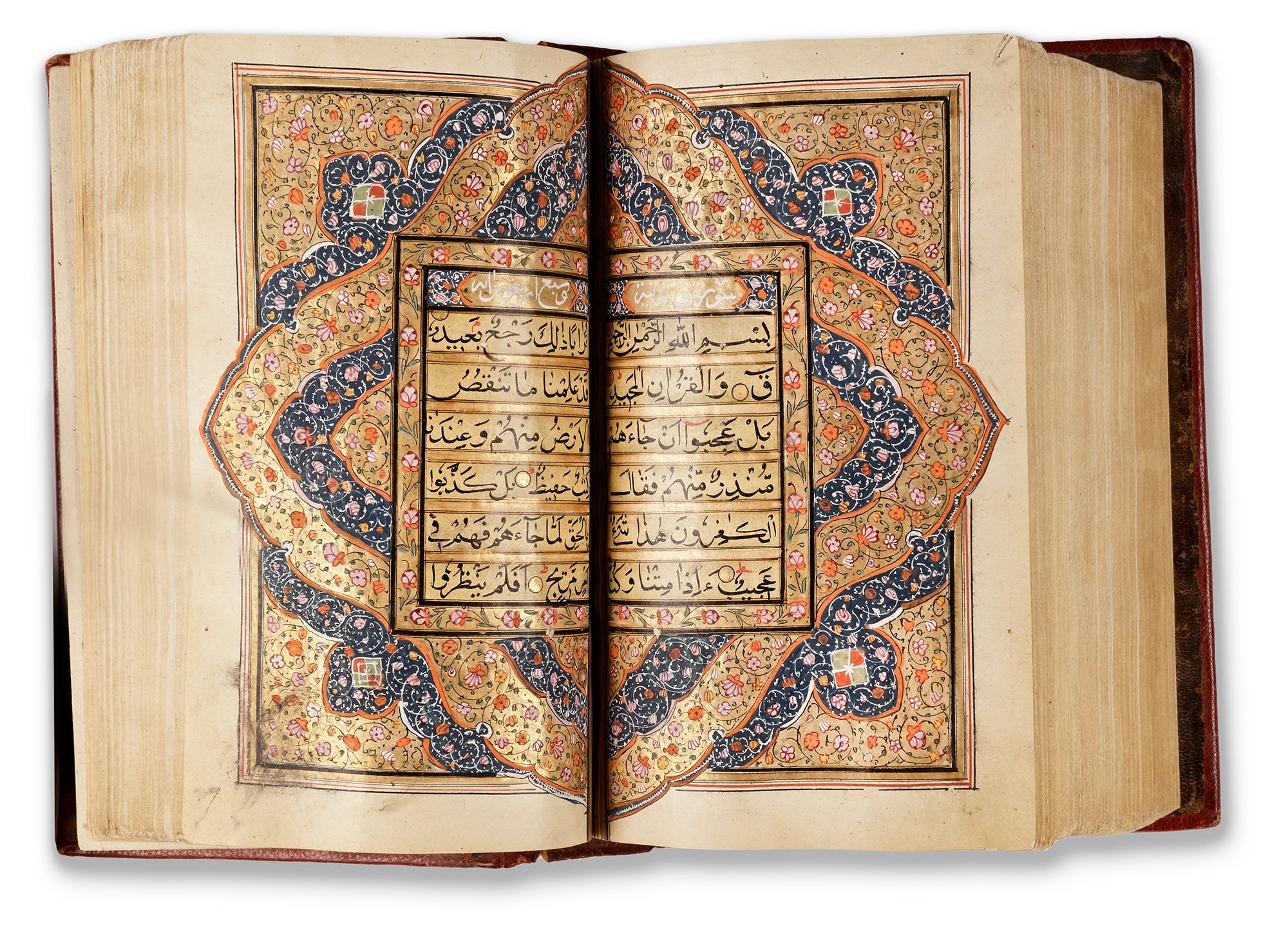 Arabic manuscript on paper, 592 leaves, each folio with 11 lines of black naskh script written on a cream coloured ground, each line within double black-ruled gold division, gold roundel verse markers outlined in black ink, titles in white thuluth script on gold ground within cartouche, text within polychrome and gold rules and stylized with flower scrolls, gold roundel marginal markers indicating "nisf, juz",