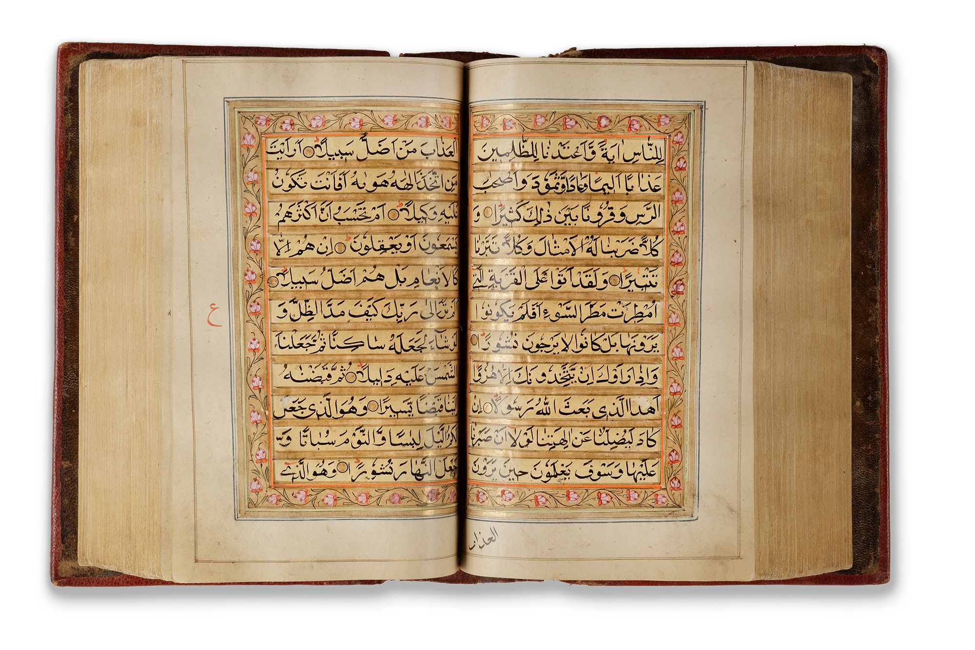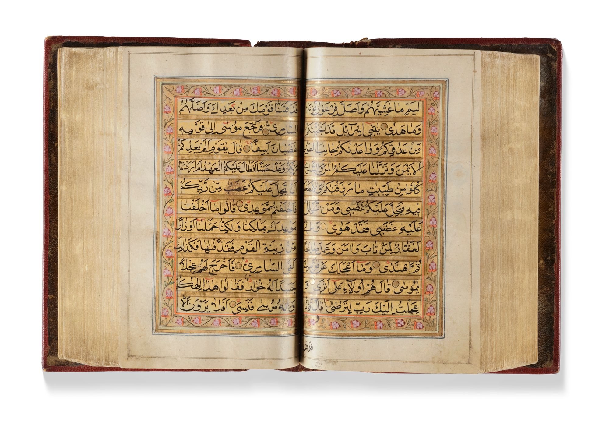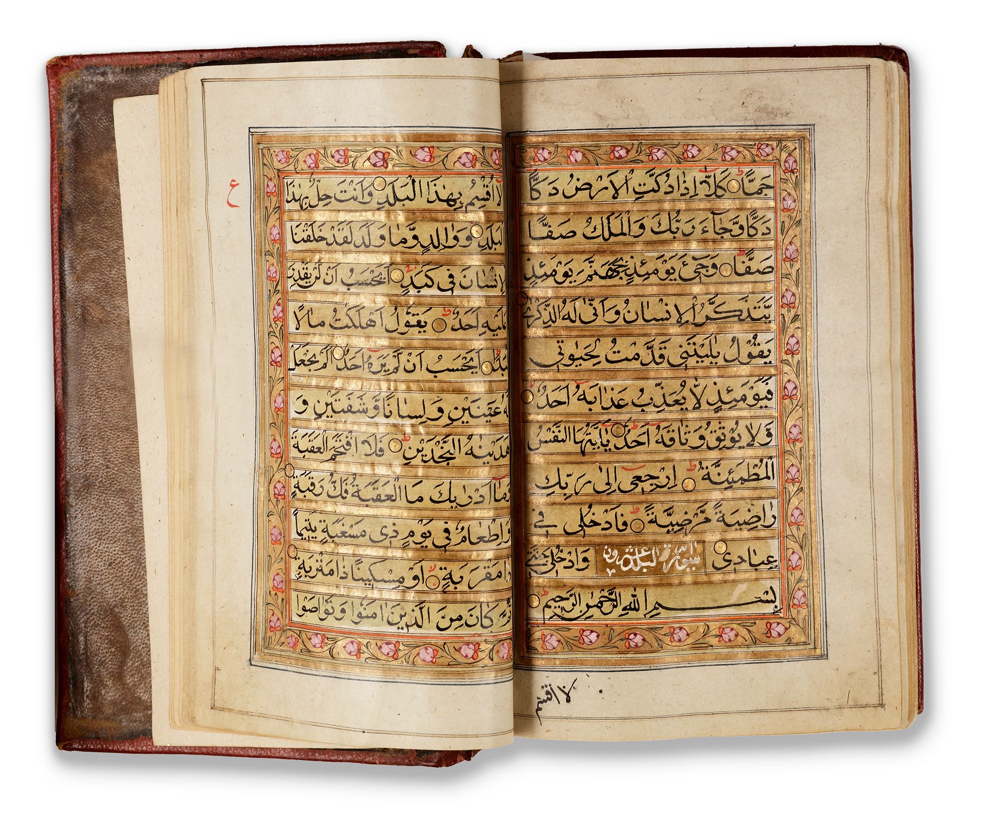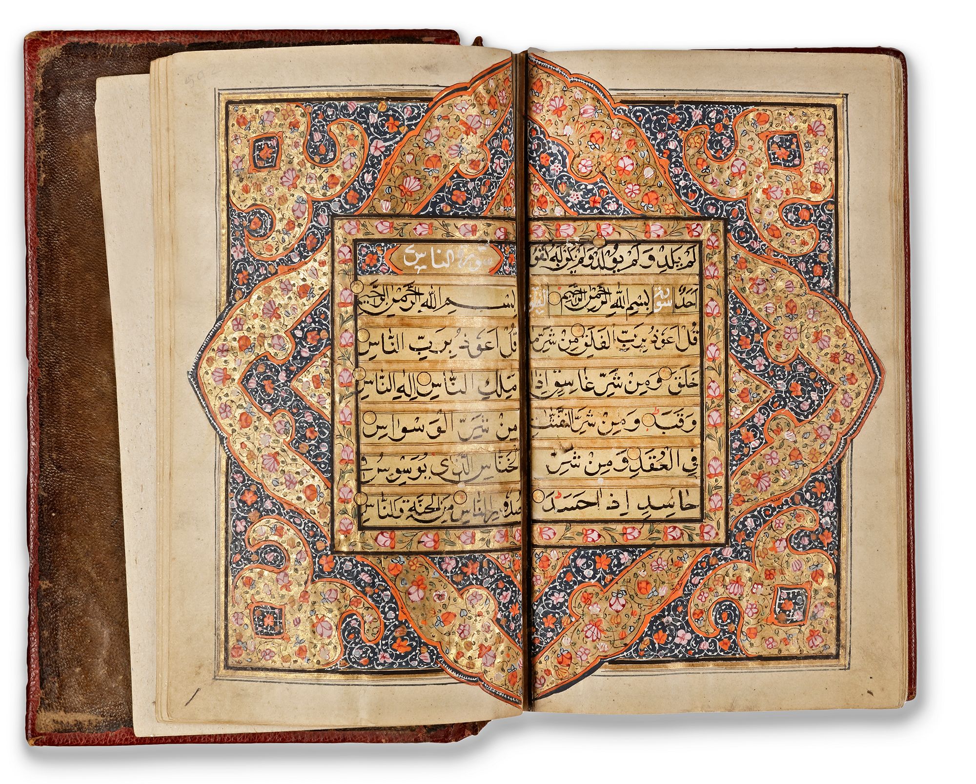 Arabic manuscript on paper, 592 leaves, each folio with 11 lines of black naskh script written on a cream coloured ground, each line within double black-ruled gold division, gold roundel verse markers outlined in black ink, titles in white thuluth script on gold ground within cartouche, text within polychrome and gold rules and stylized with flower scrolls, gold roundel marginal markers indicating "nisf, juz",