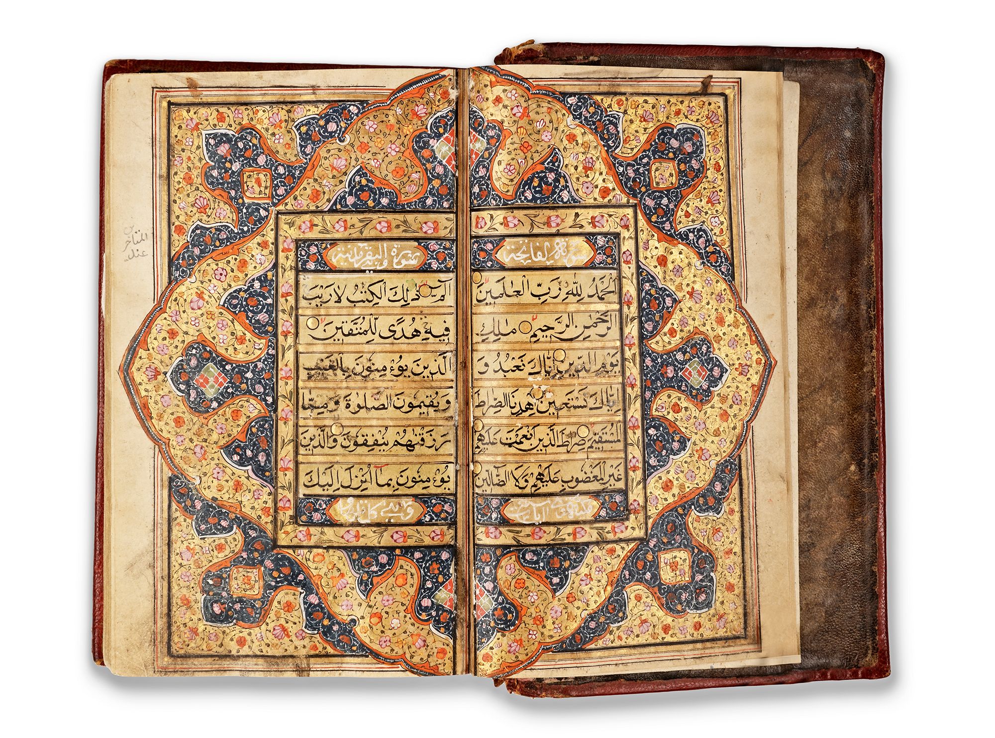 two opening bifolia with gold and polychrome illuminated margins, multiple other pages throughout the Quran are similarly illuminated.