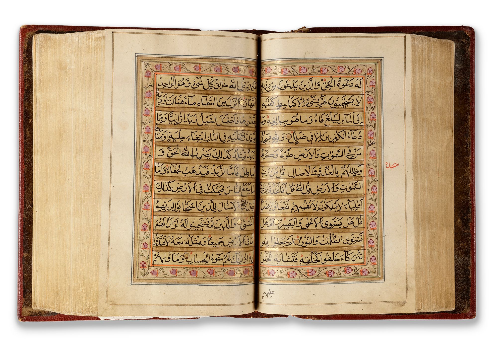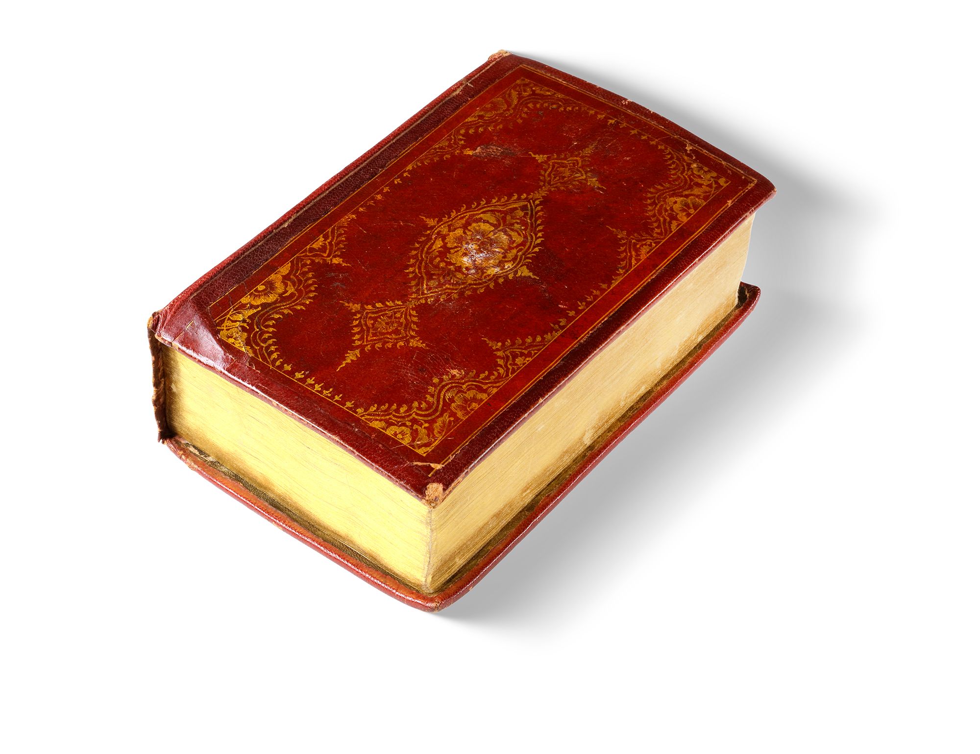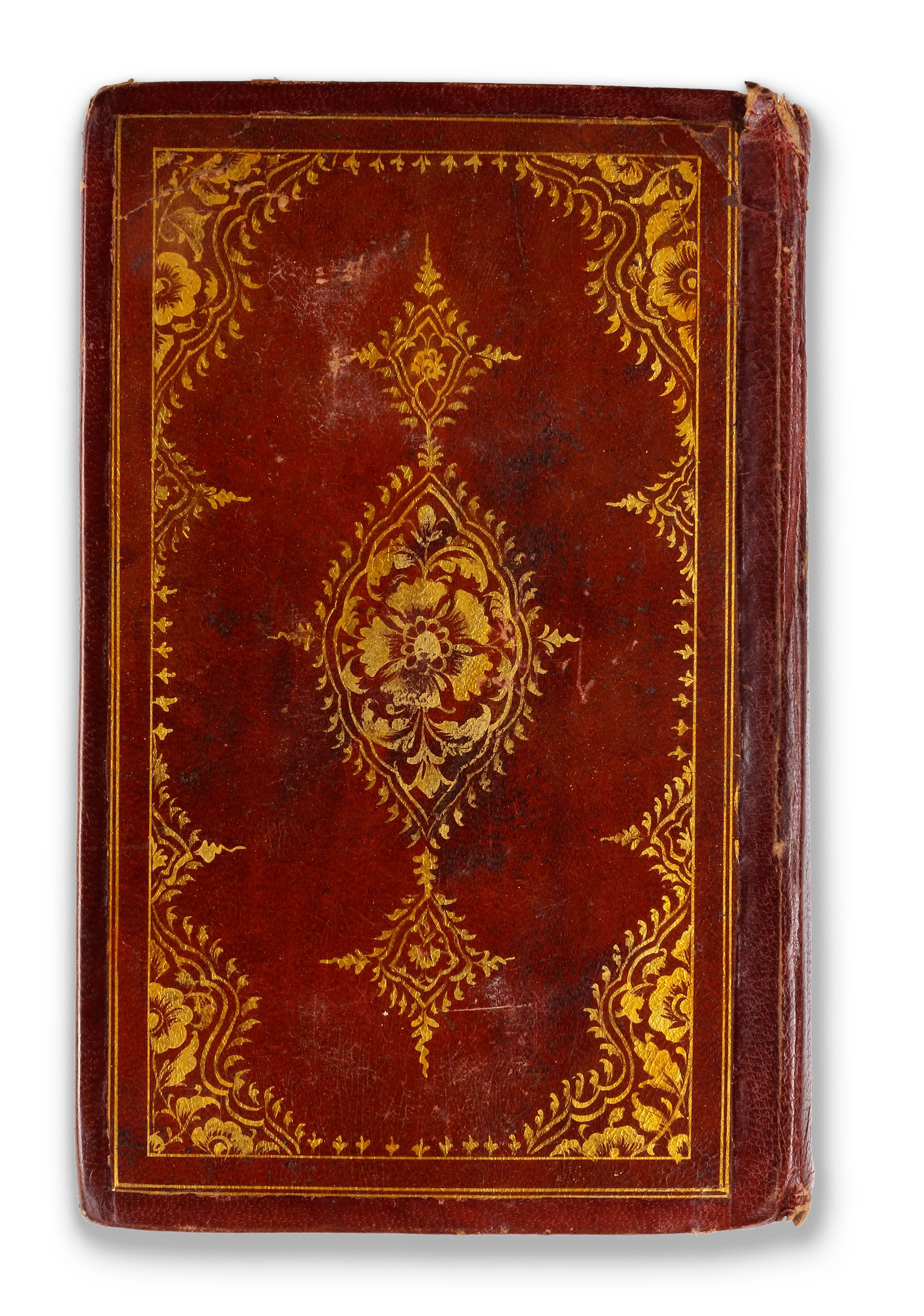 In deep red morocco leather bidding with gilt floral decoration.