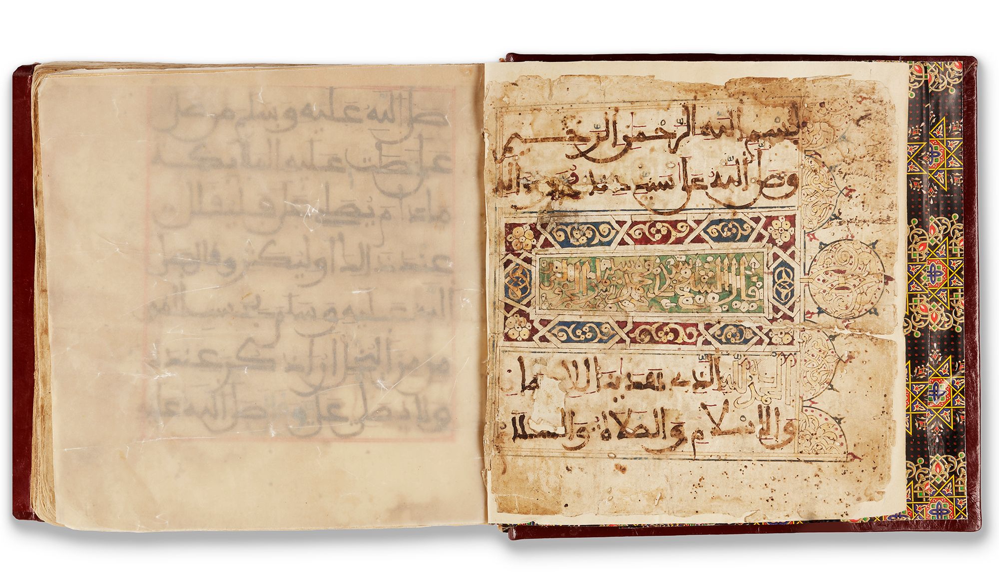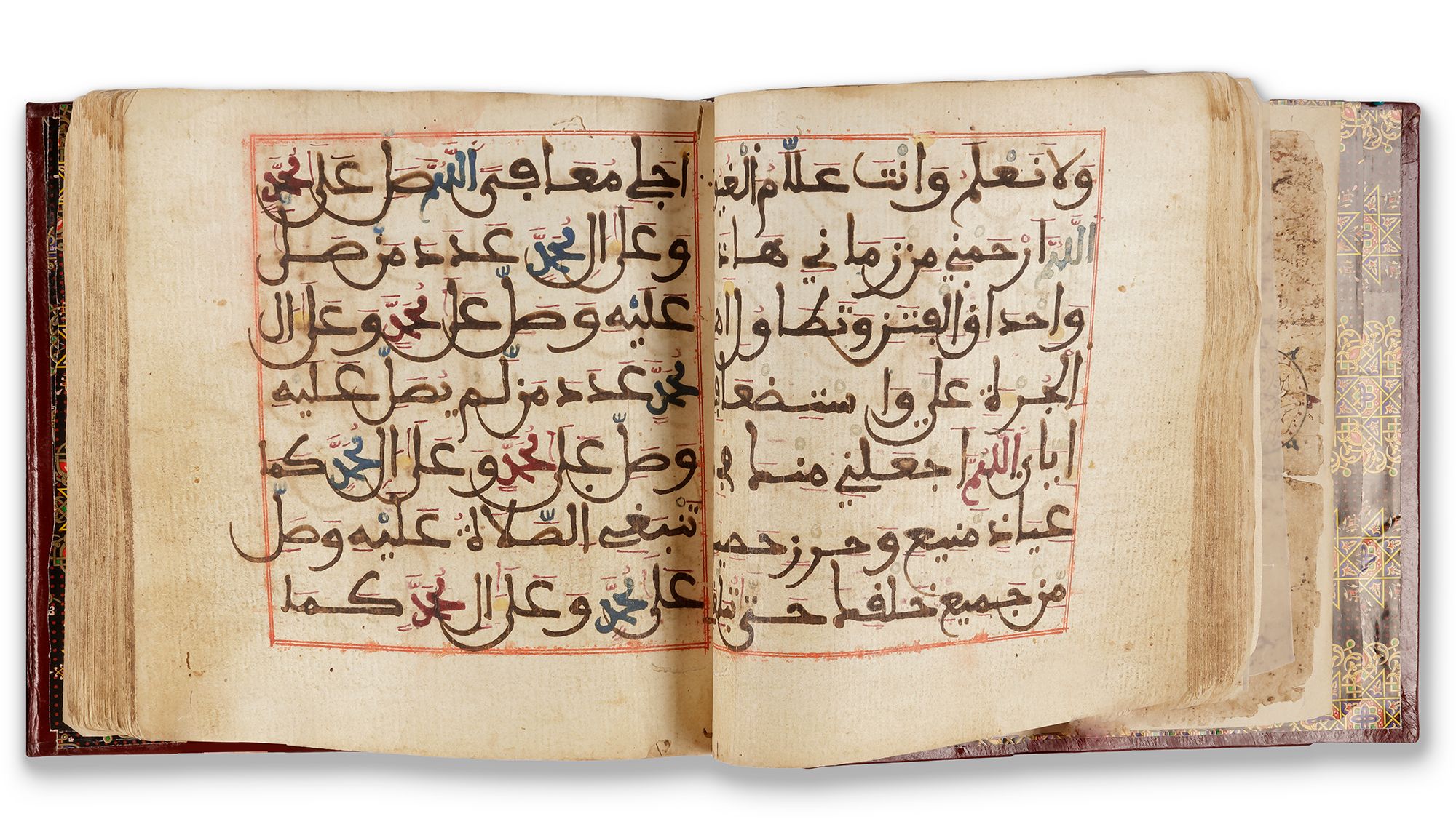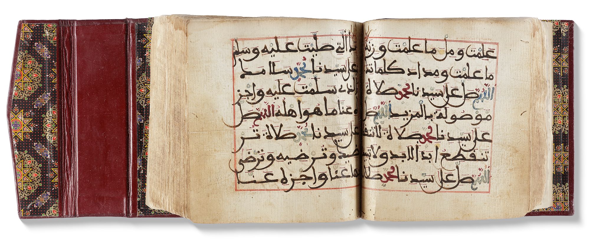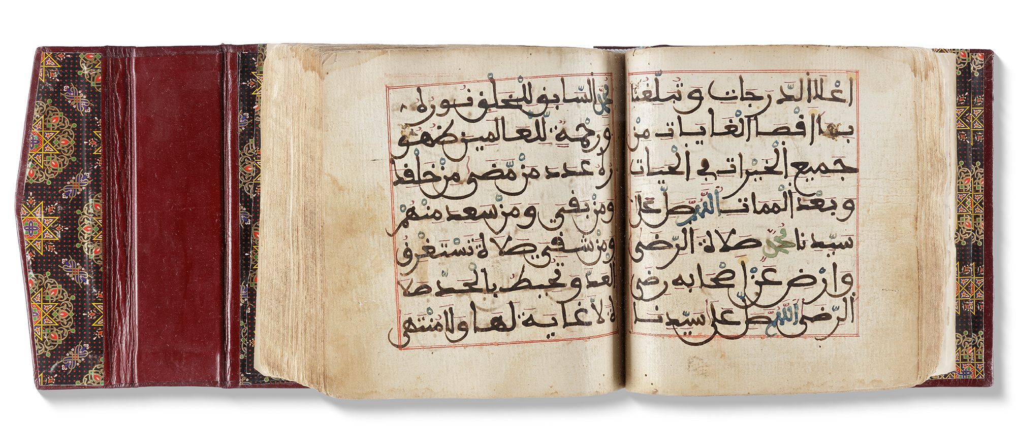 Arabic manuscript on cream-coloured paper, 7 lines to the page written in clear large maghribi script, significant words picked out in red and green, margins ruled in red ink, headings in black angular kufic script within a decorated panel, diactries in red ink. First and last page with polychrome decoration.