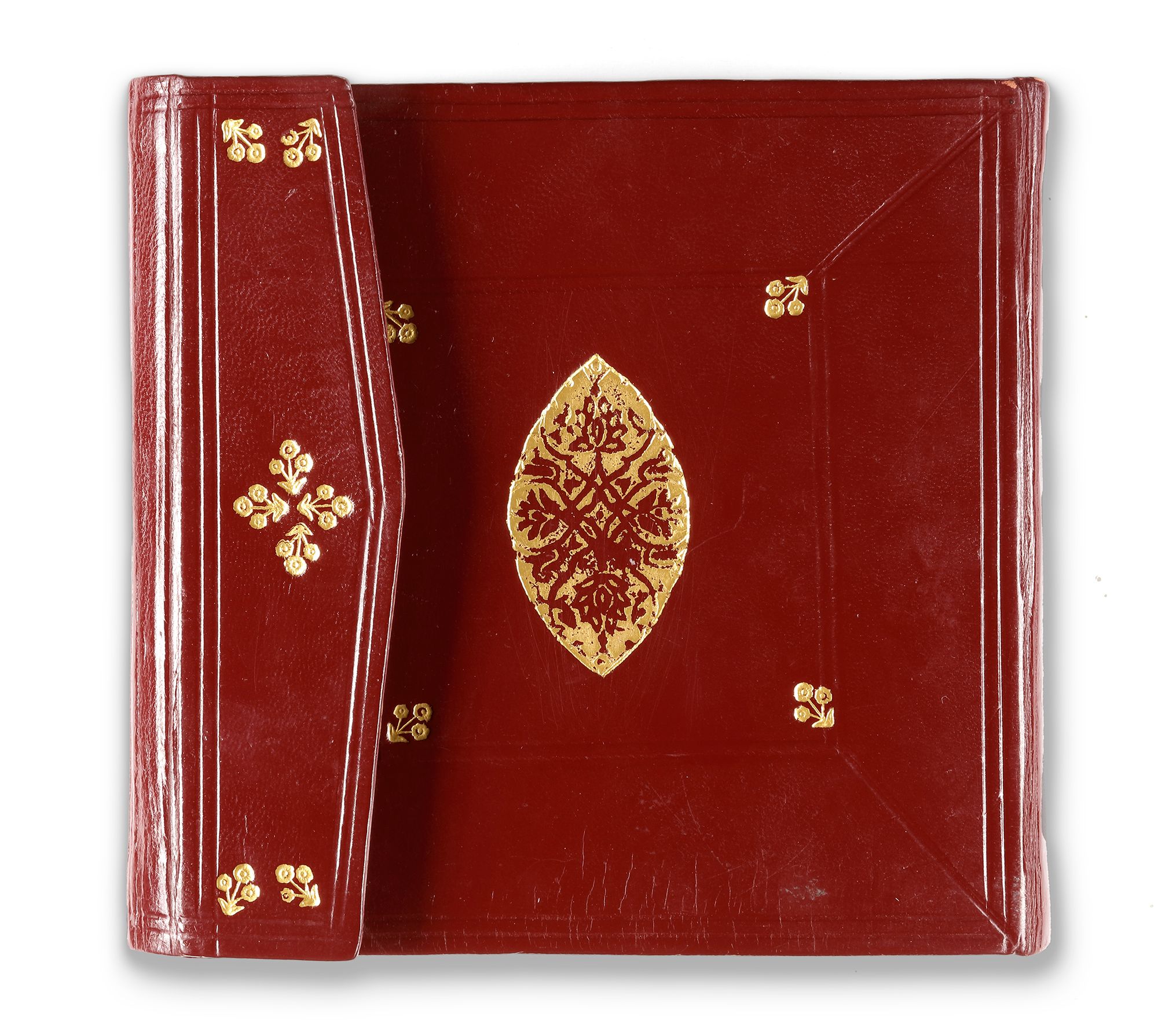 In deep red leather with stamped a central medallion and cornerpieces of gilt leather onlay with flap.