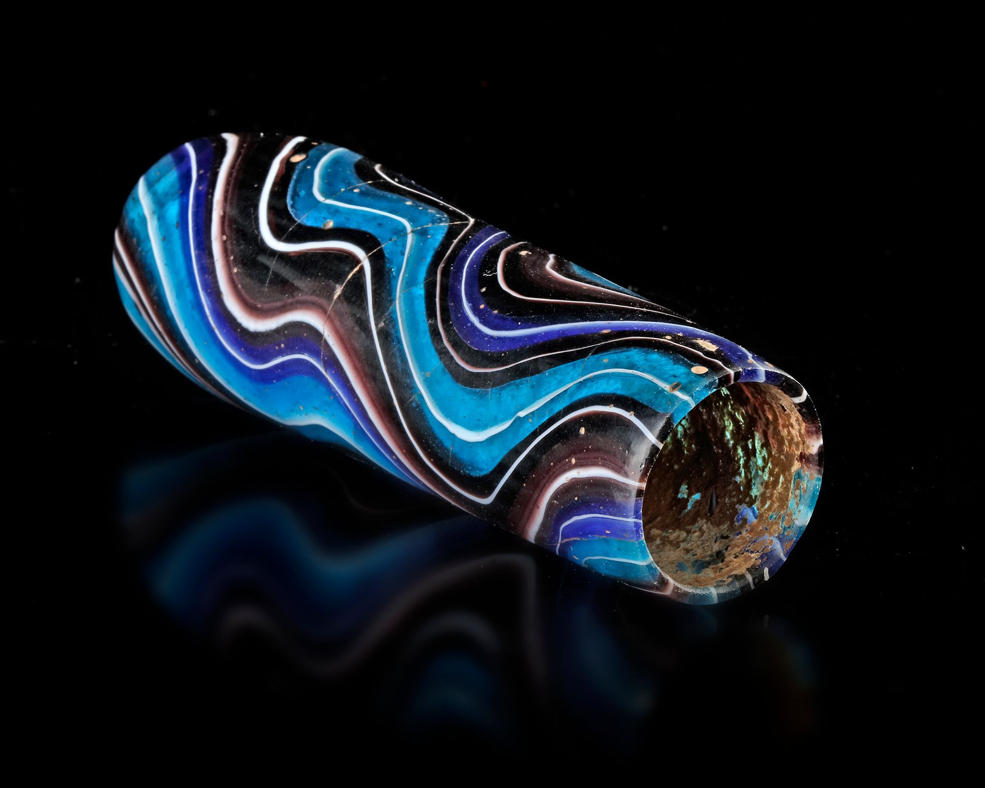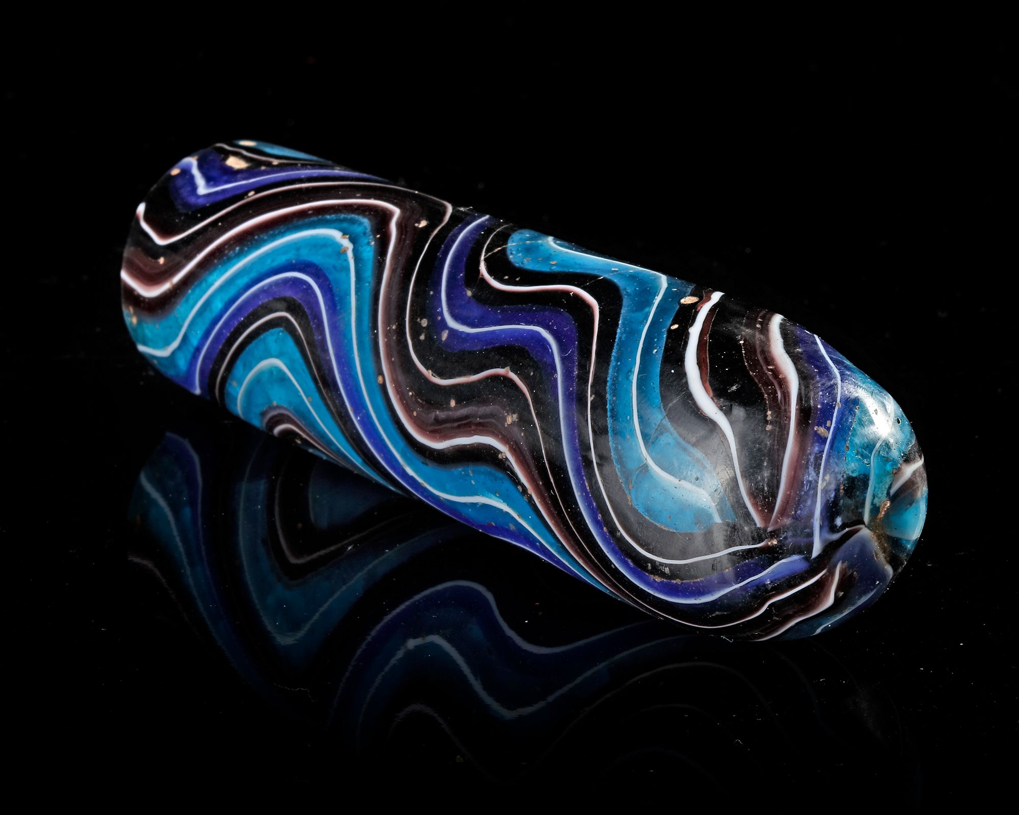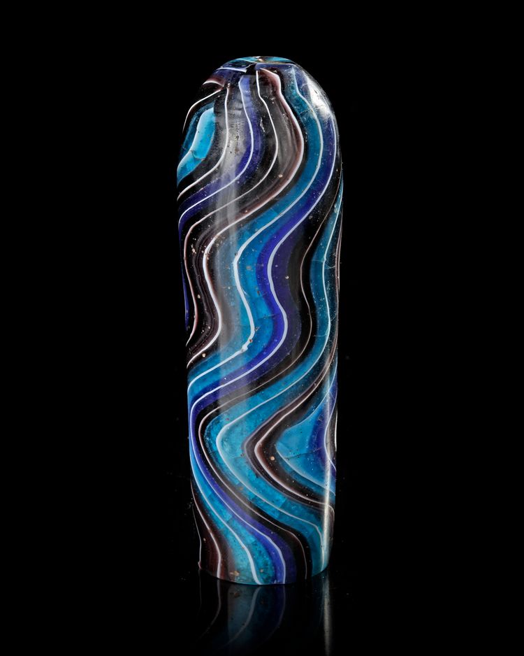 Glass alabastron (perfume bottle), translucent cobalt blue with trails in opaque black, opaque white, and opaque turquoise blue. Length 10.5 cm.