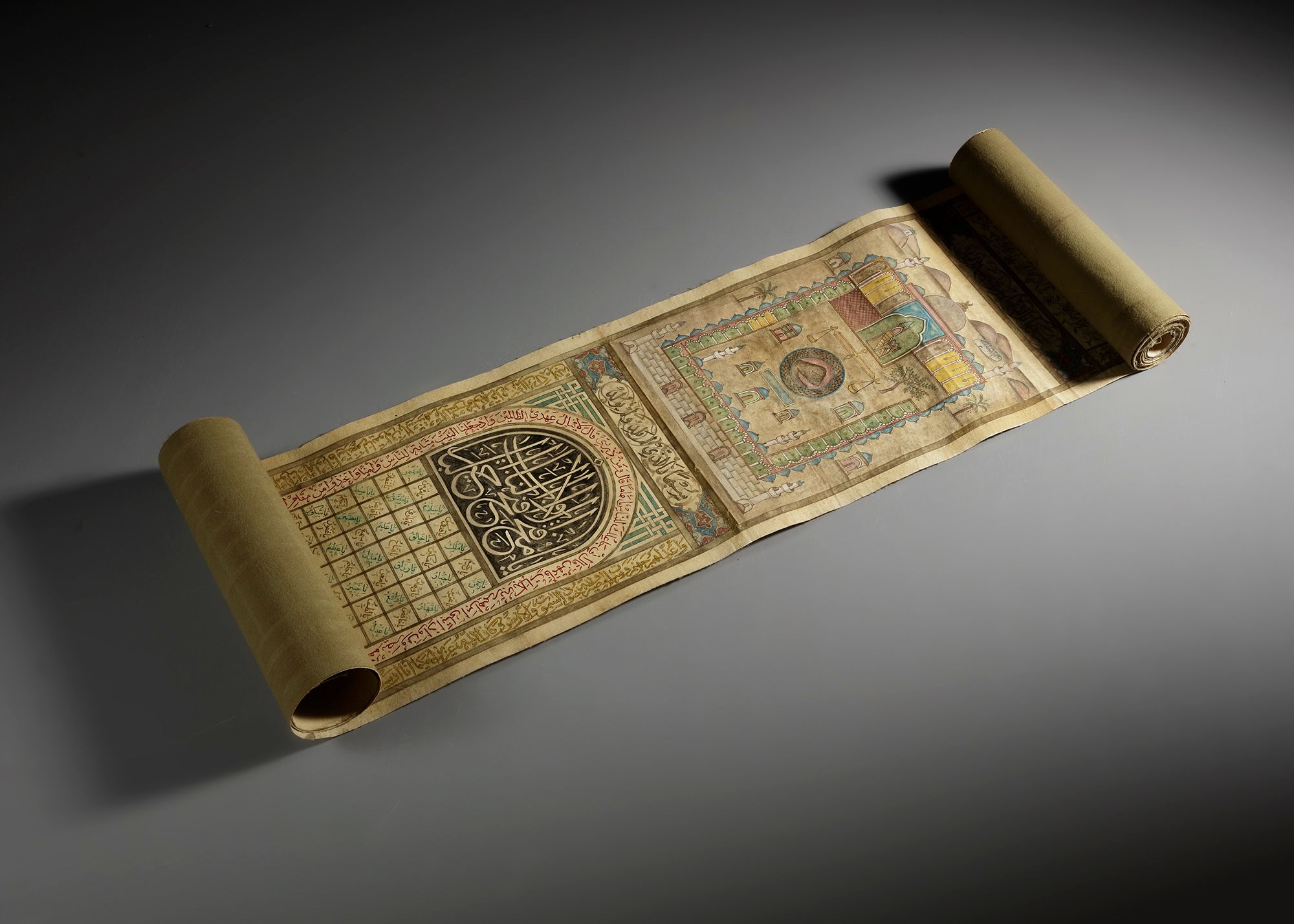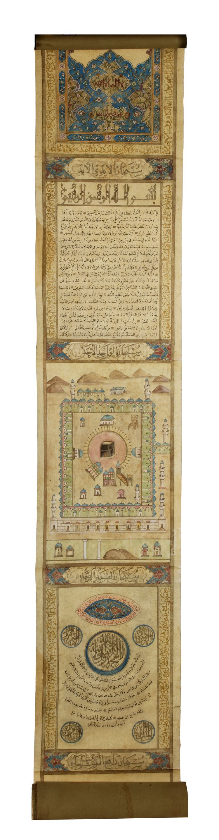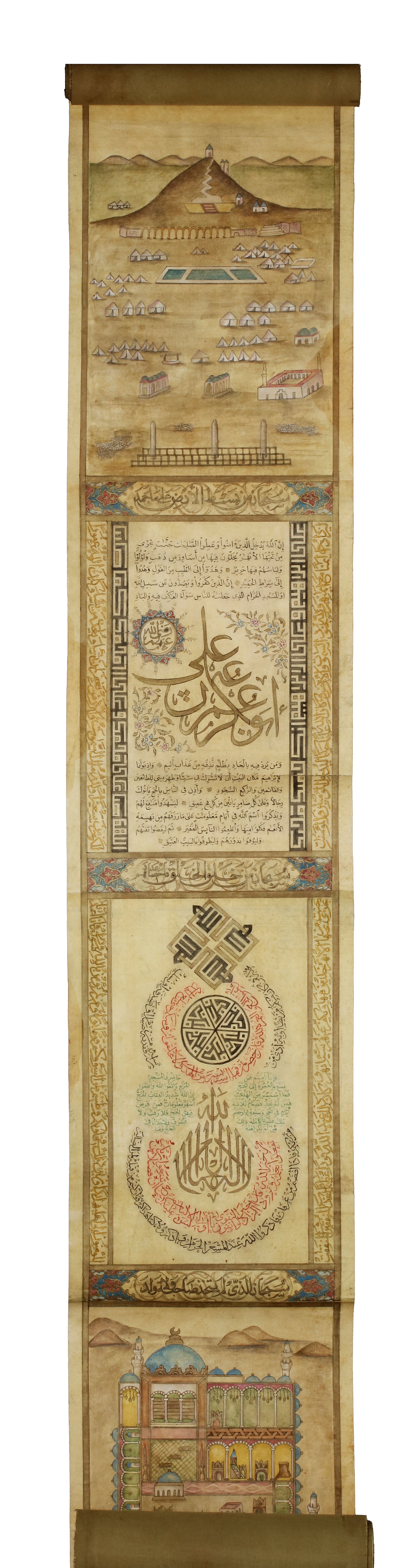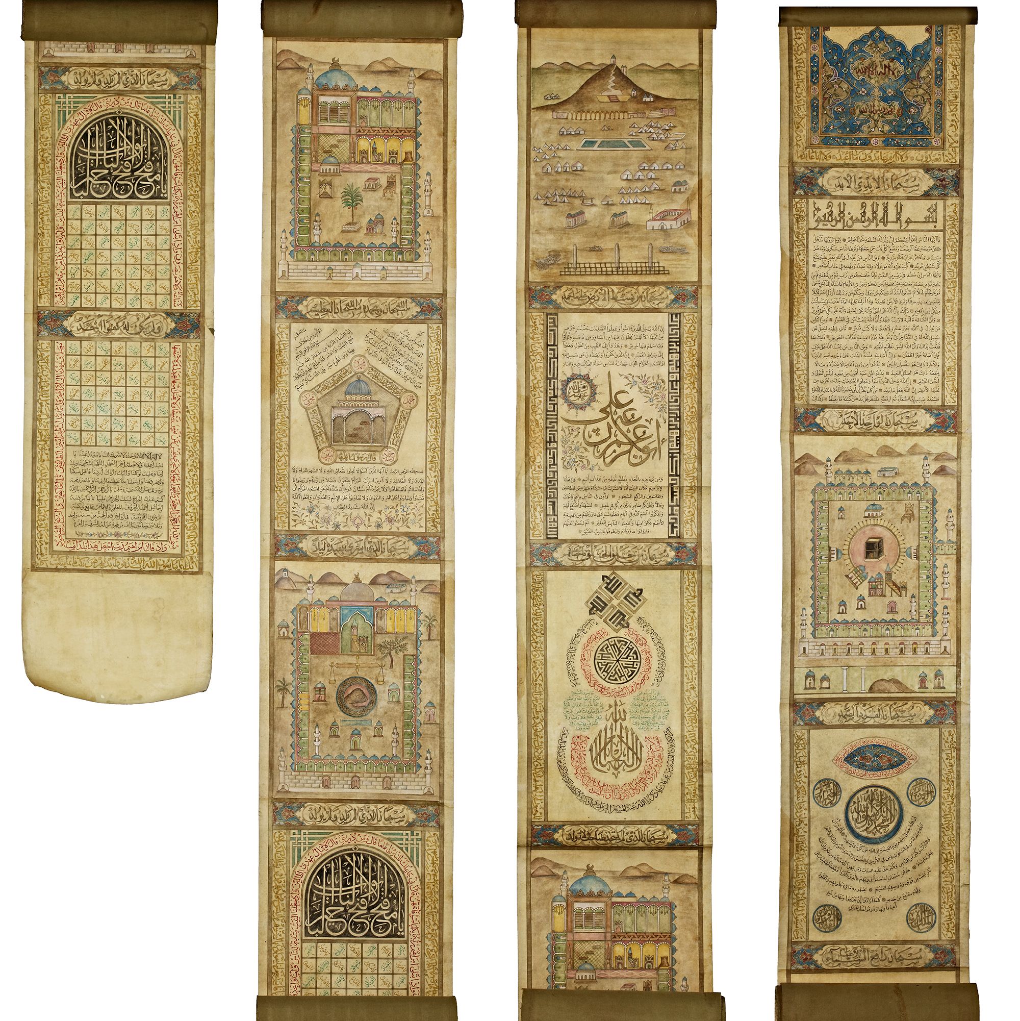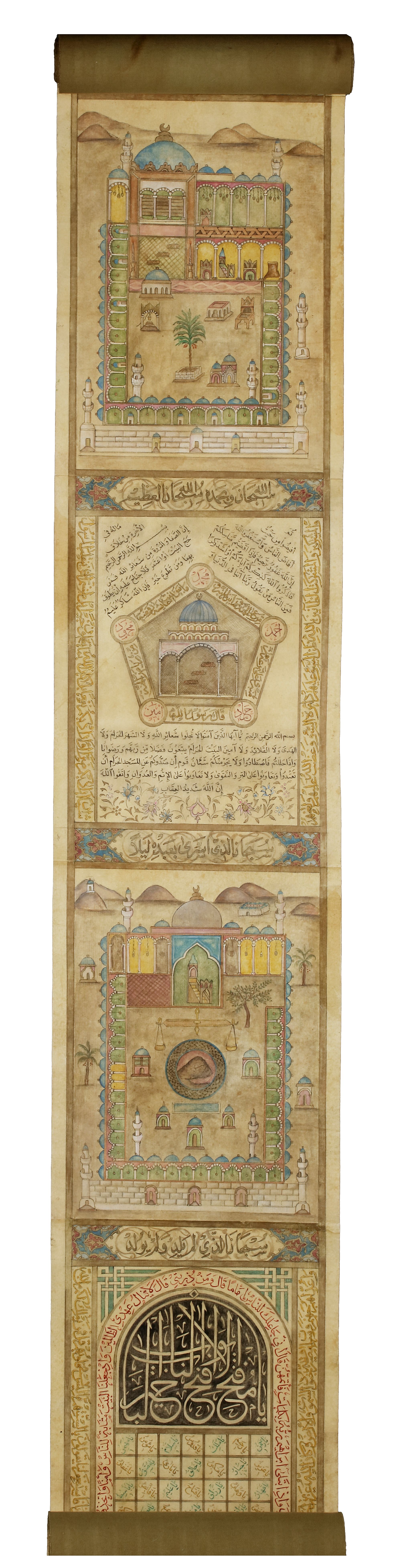 Arabic manuscript on paper, with Mecca and Medina drawings, prayers and Quran verses. Single scroll divided into different main divisions with thuluth, naskh and Kufic script in black, blue green, red and gilt colours, rebacked.