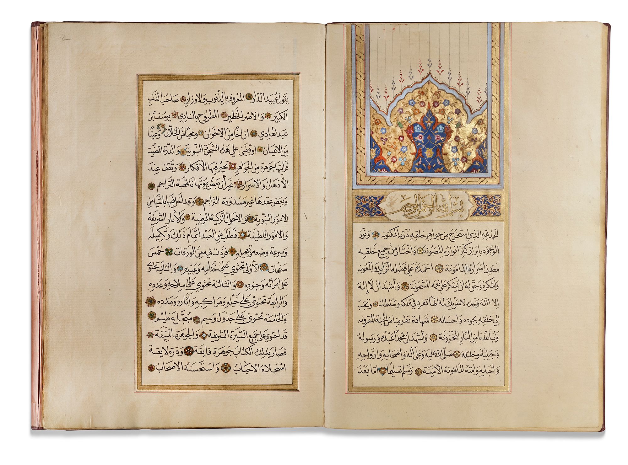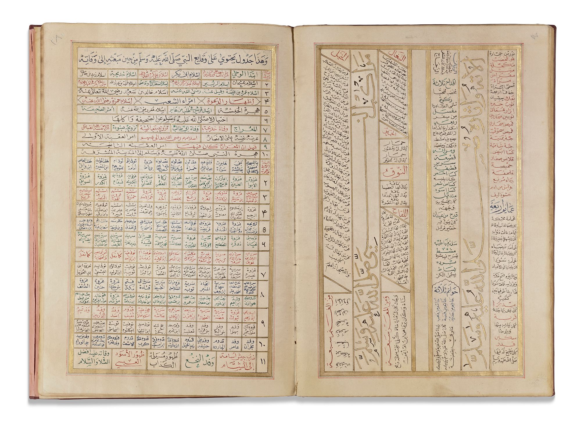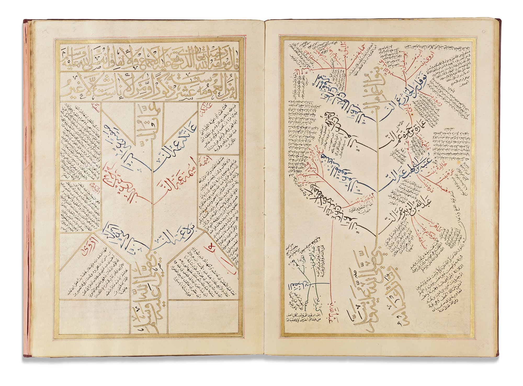 Arabic manuscript on paper, 10 leaves with 2 fly-leaves, written in 17 lines in elegant naskh and thuluth script, each page written horizontally, vertically and diagonally, titles in large thuluth gilt script outlined in black, catch and important words in red and blue ink, comments in black naskh script, ruled in wide gilt border outlined in black, f1-b with headpiece decorated in gilt and royal blue, gold verse markers pointed by polychrome dots. The first page with the title " This is the honorable family tree of the Prophet Muhammad, Peace be upon Him", written in gilt thuluth script outlined in black within an illuminated roundel, ownership statements in black ink.