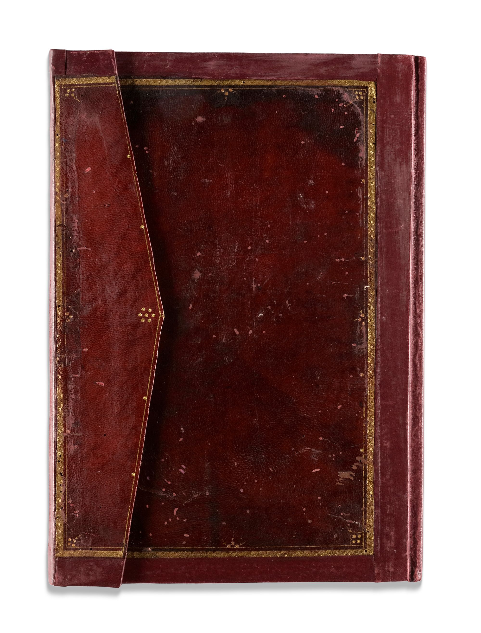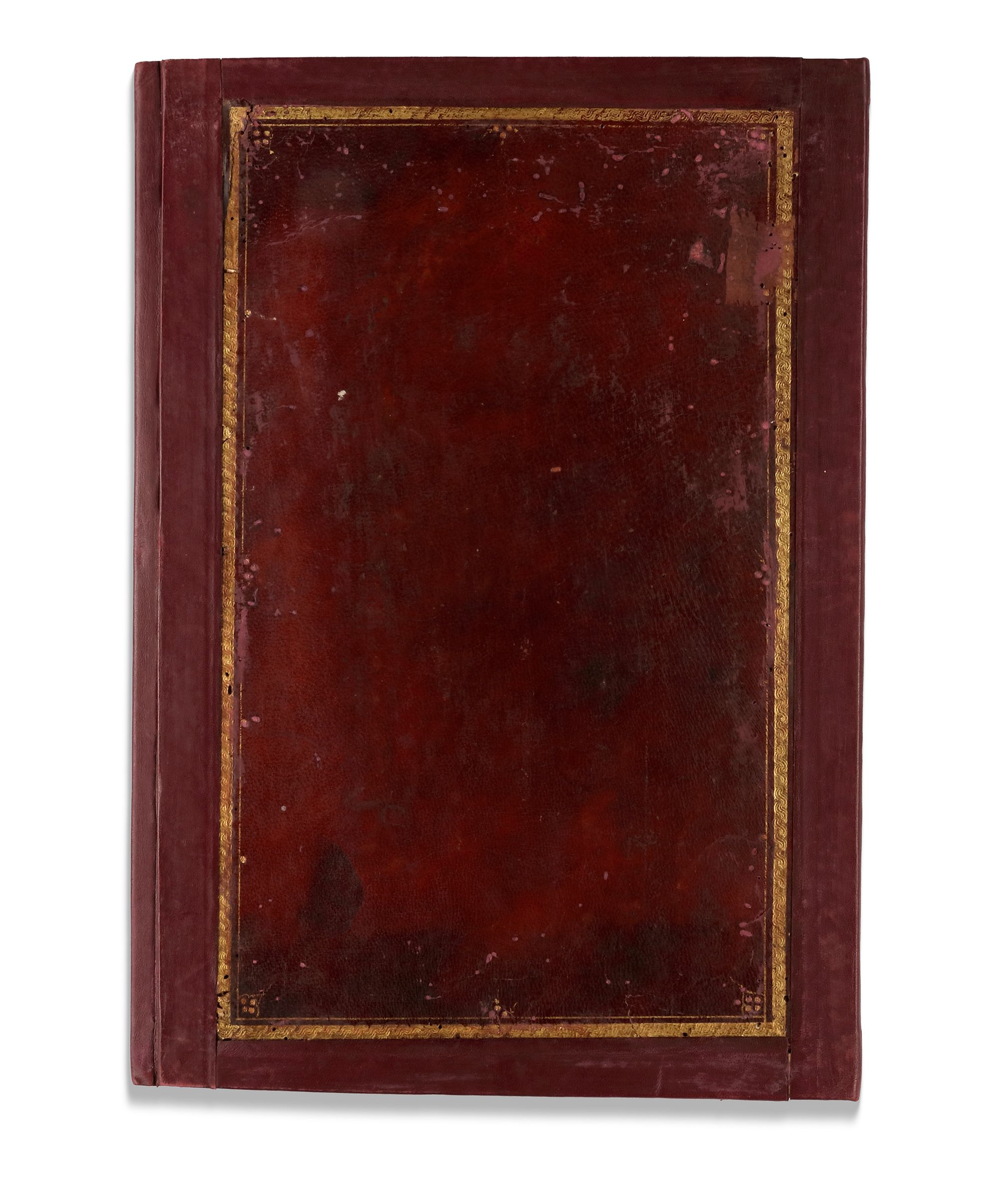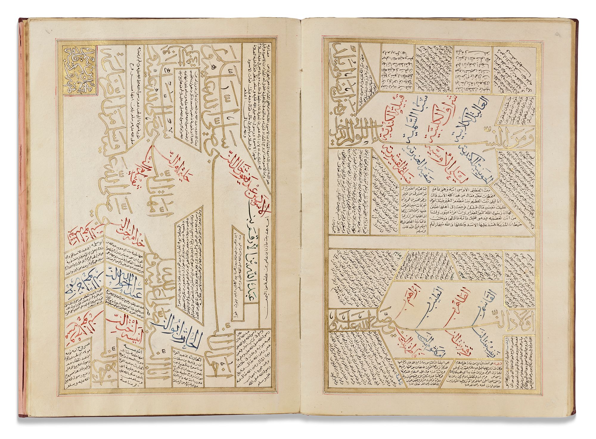 Arabic manuscript on paper, 10 leaves with 2 fly-leaves, written in 17 lines in elegant naskh and thuluth script, each page written horizontally, vertically and diagonally, titles in large thuluth gilt script outlined in black, catch and important words in red and blue ink, comments in black naskh script, ruled in wide gilt border outlined in black, f1-b with headpiece decorated in gilt and royal blue, gold verse markers pointed by polychrome dots. The first page with the title " This is the honorable family tree of the Prophet Muhammad, Peace be upon Him", written in gilt thuluth script outlined in black within an illuminated roundel, ownership statements in black ink.