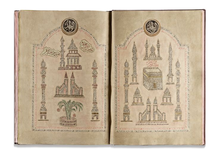Illustrations of al-Masjid al-Haram and al-Masjid al-Nabawi in Mecca and Medina, the Dome of the Rock in Jerusalem, the mosque in Damascus, and the Prophet's mihrab.