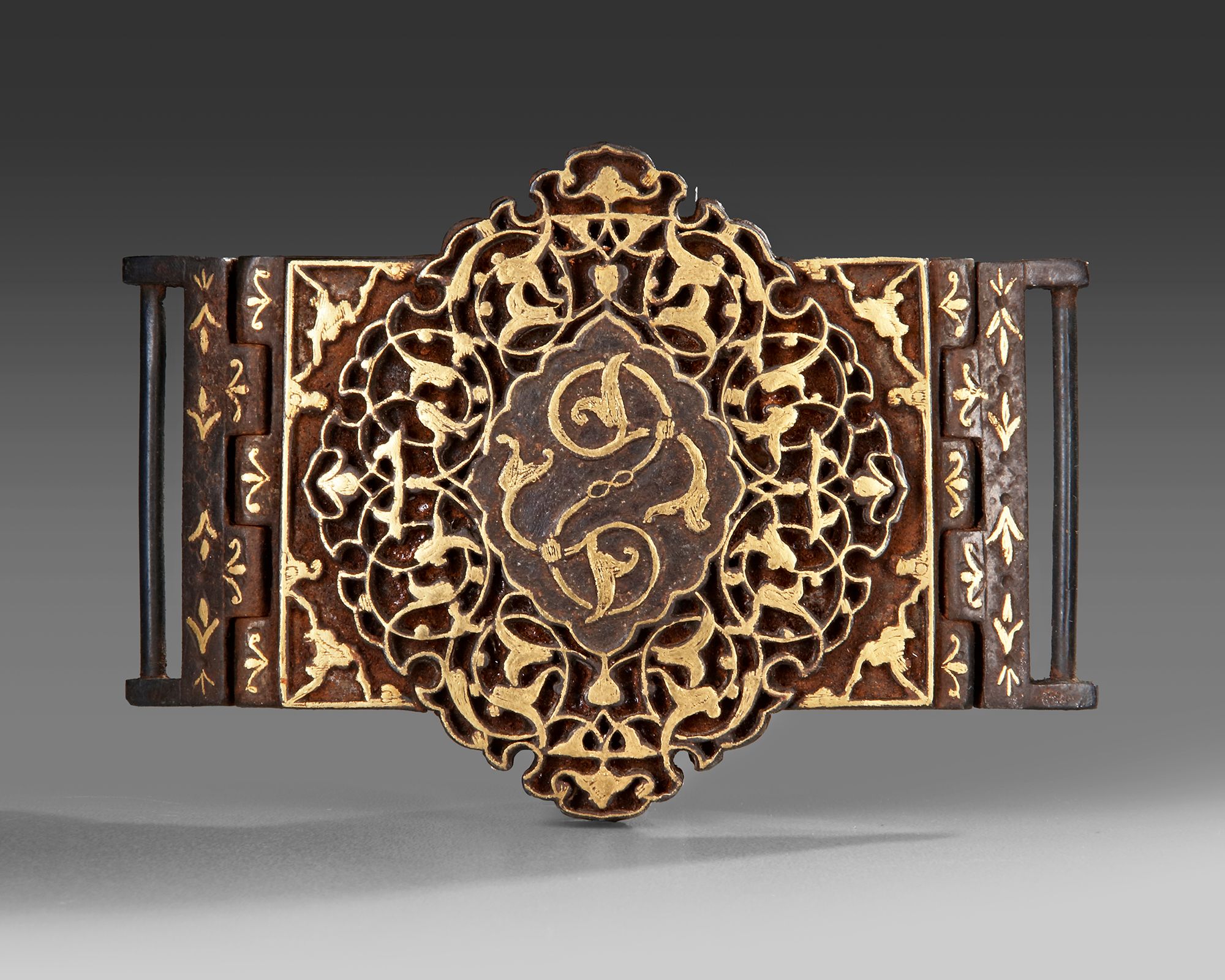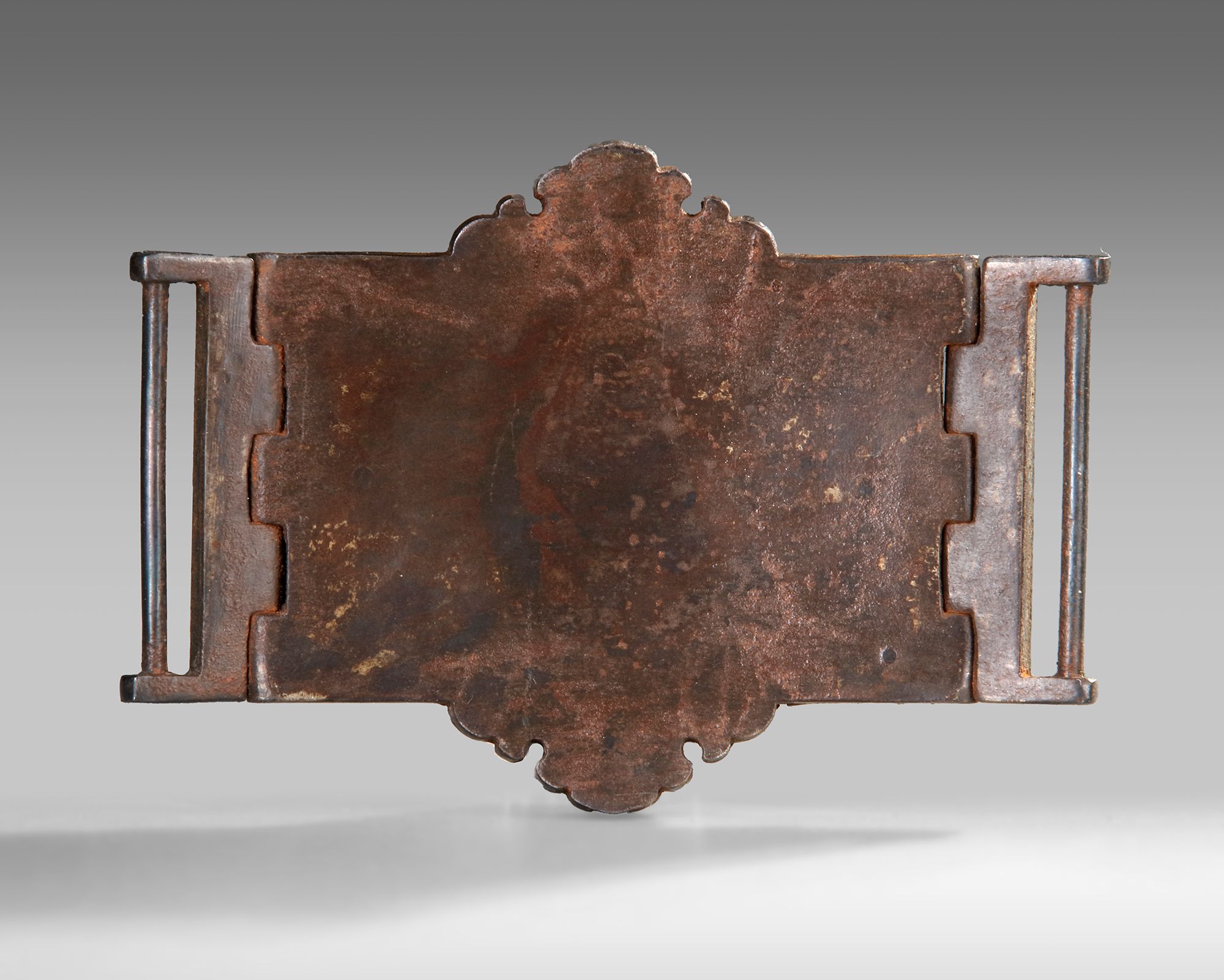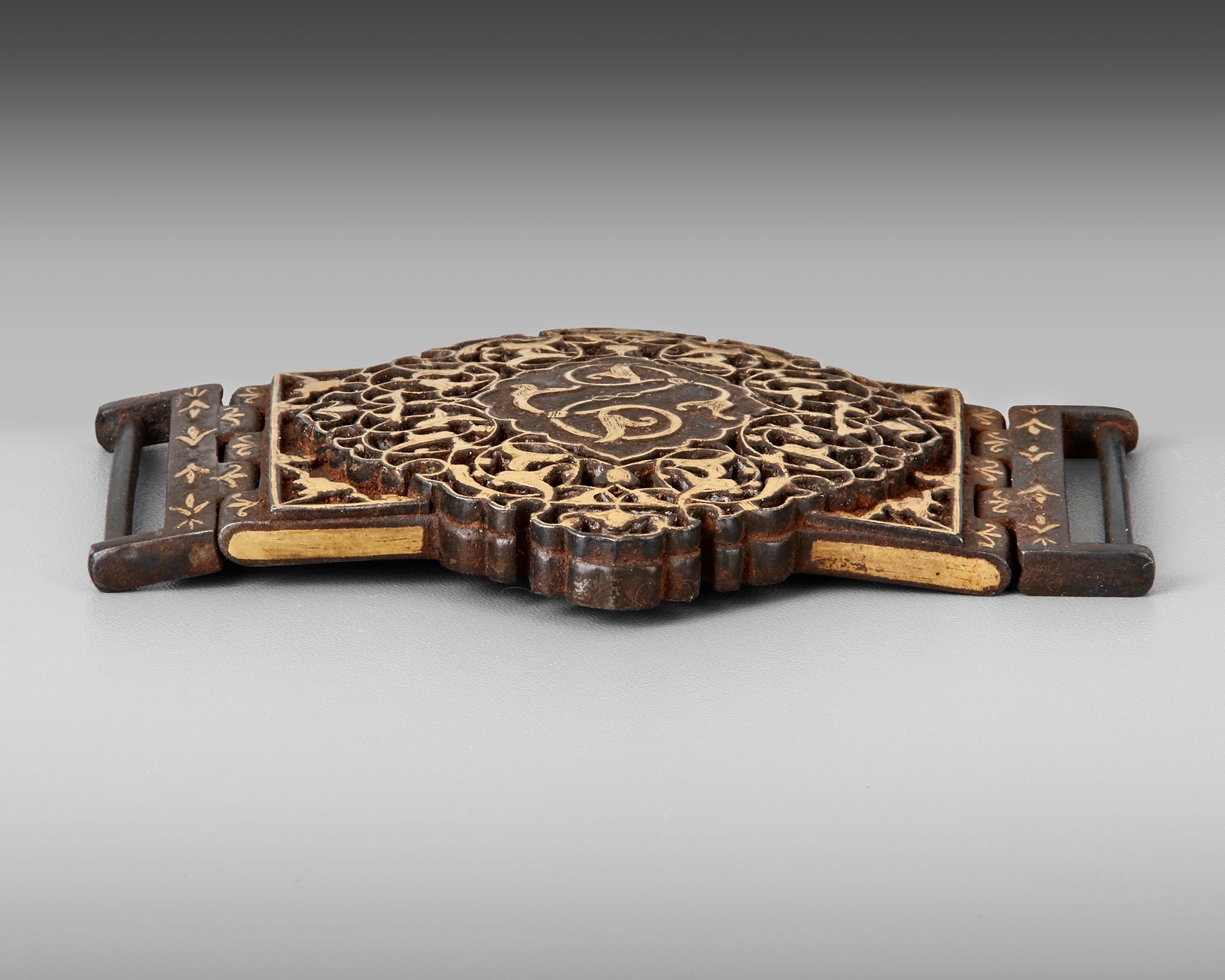 Of rectangular shape, the surface in the form of a lobbed cartouche, finely pierced with gilt interlocking floral scrolls. 11 by 7.3 cm.