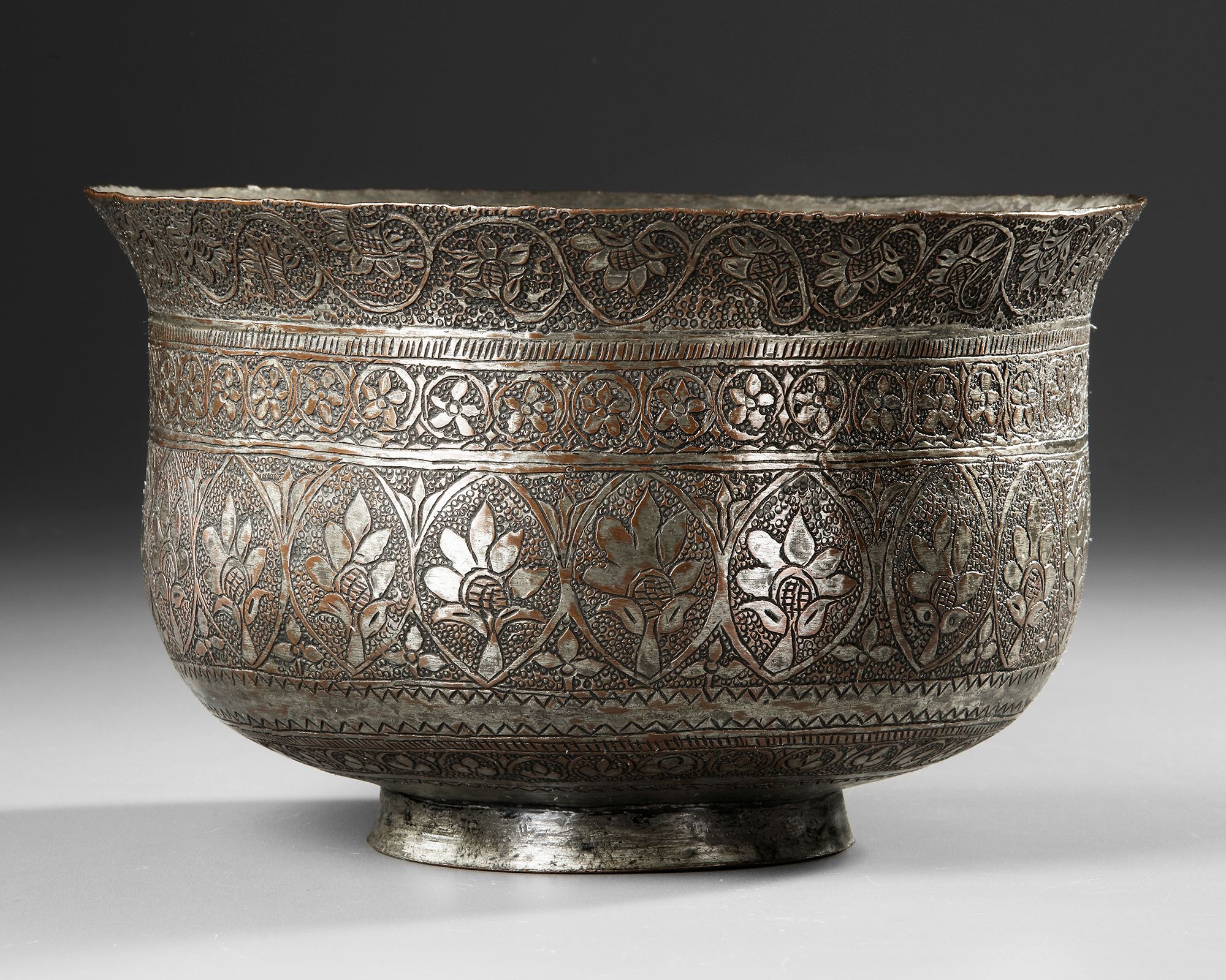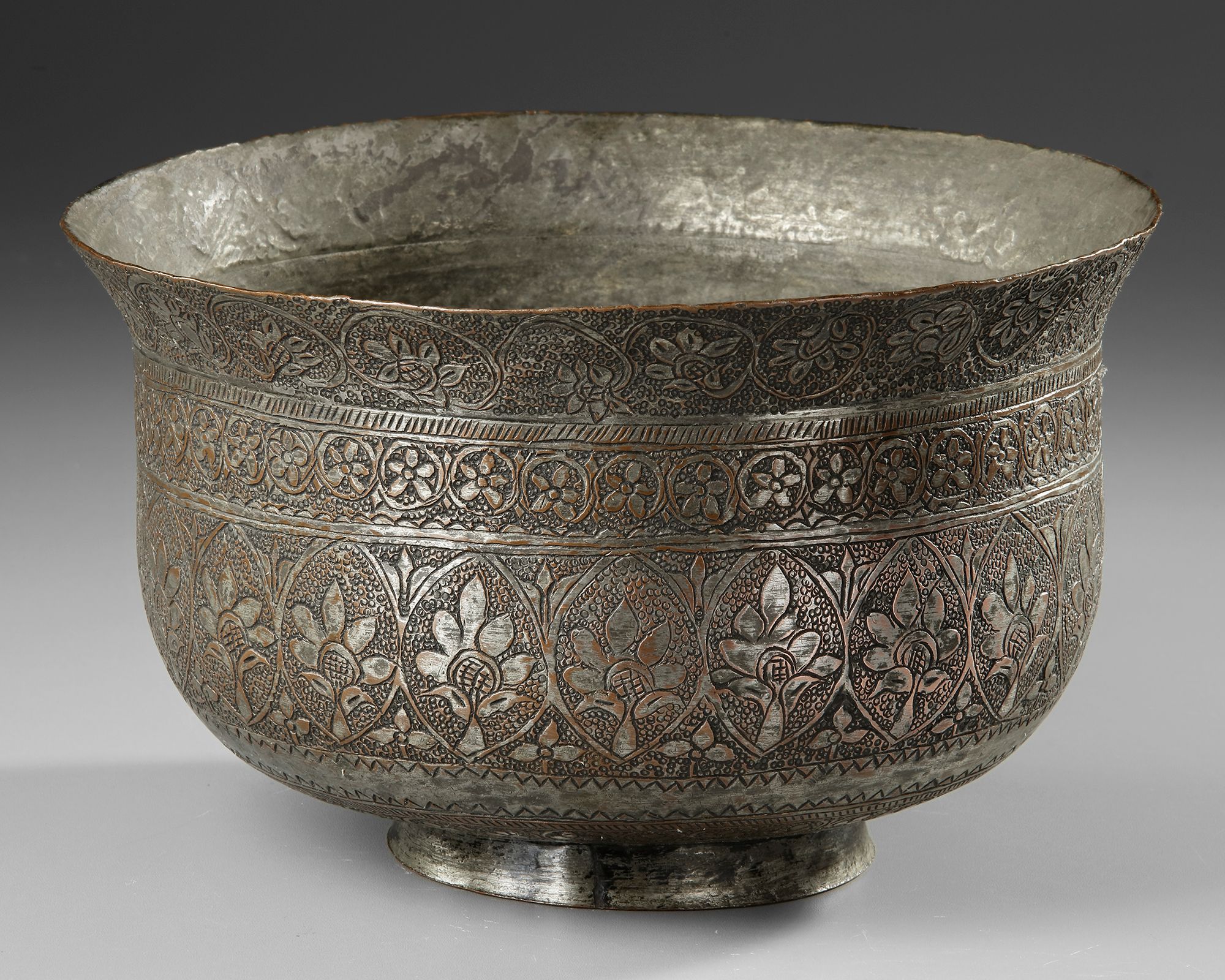 Of deep hemispherical form with everted rim, on a short and splayed foot, engraved around the body with two bands of roundels enclosing flower heads, under a classic band of flower scrolls.