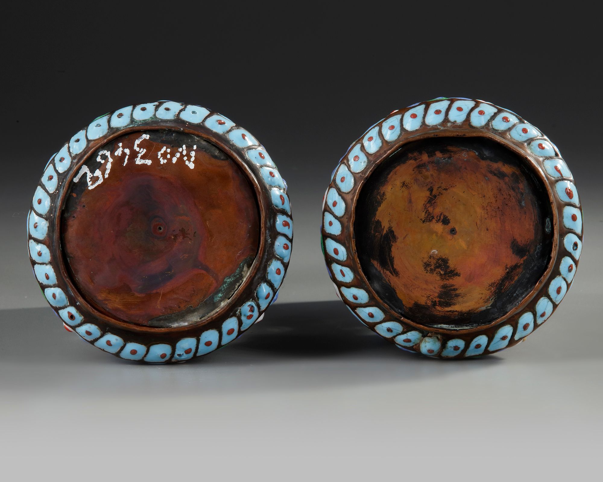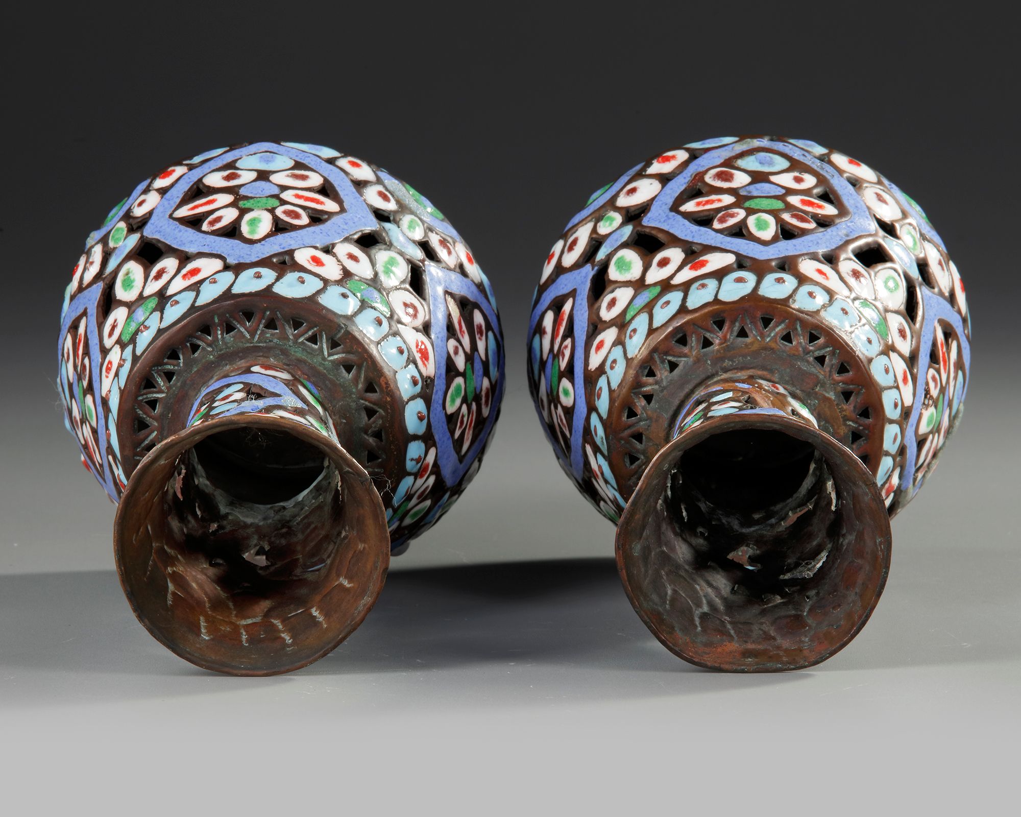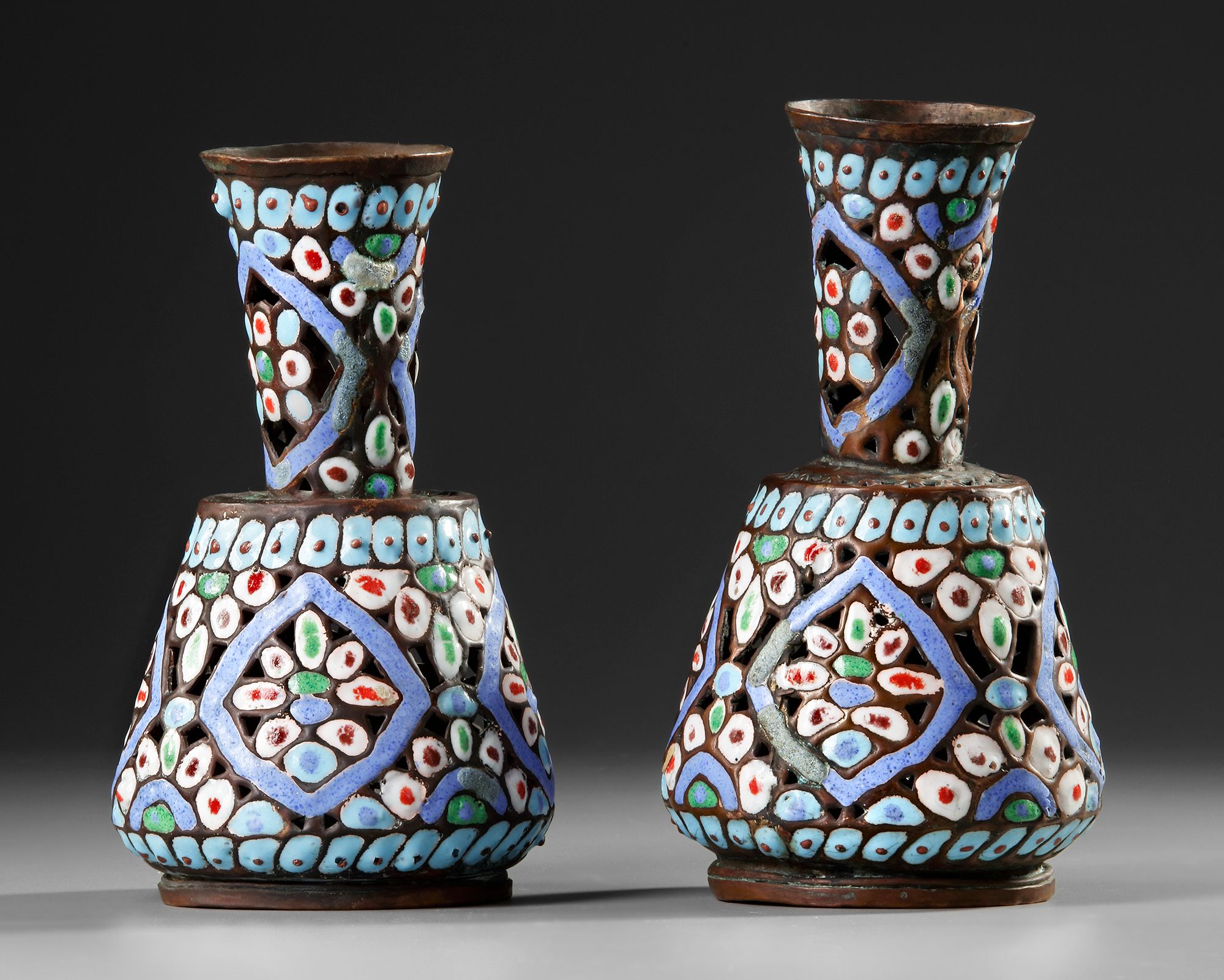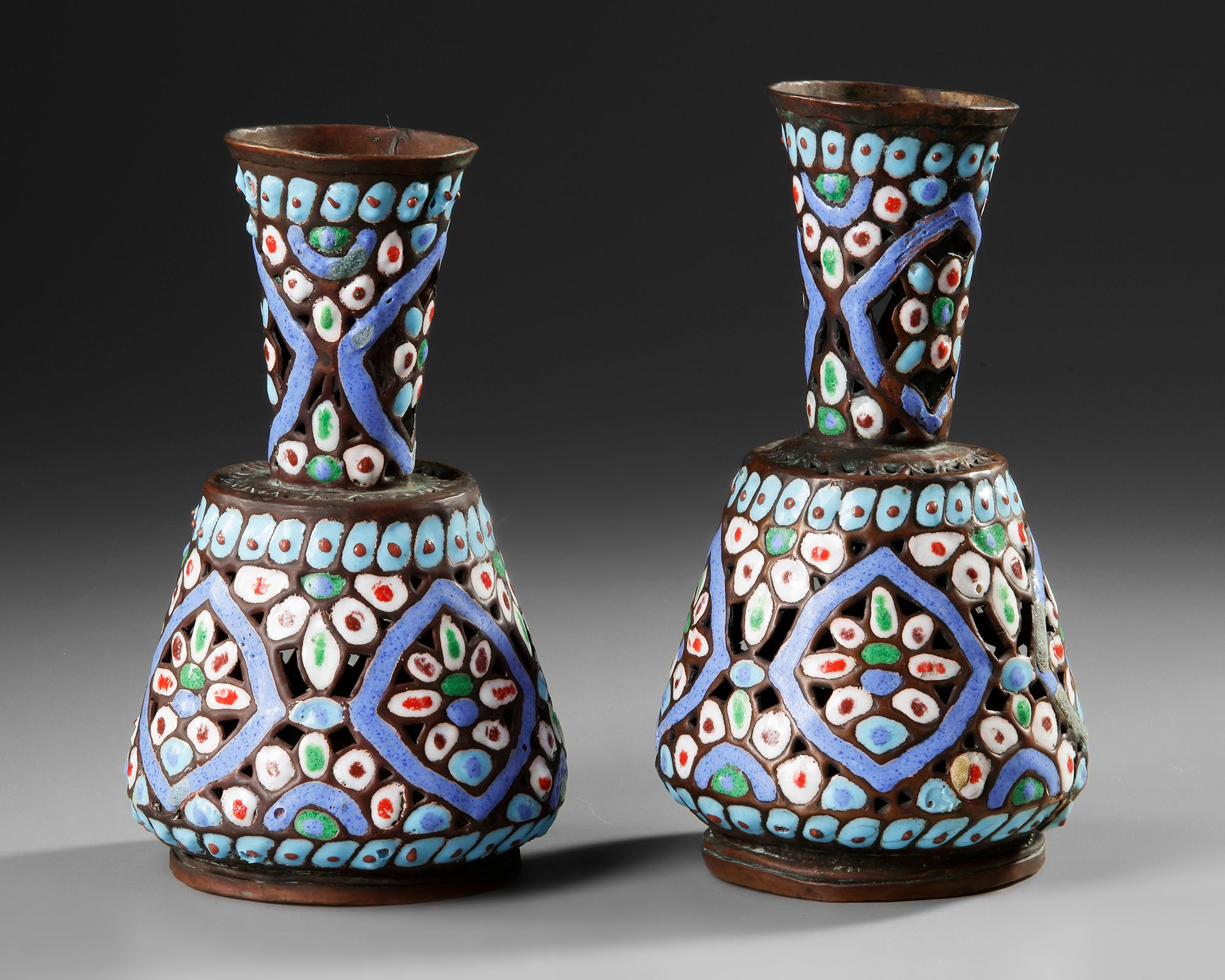 Two copper vases resting on small footring with flaring necks, enamelled with floral motifs. Height: 21 cm.