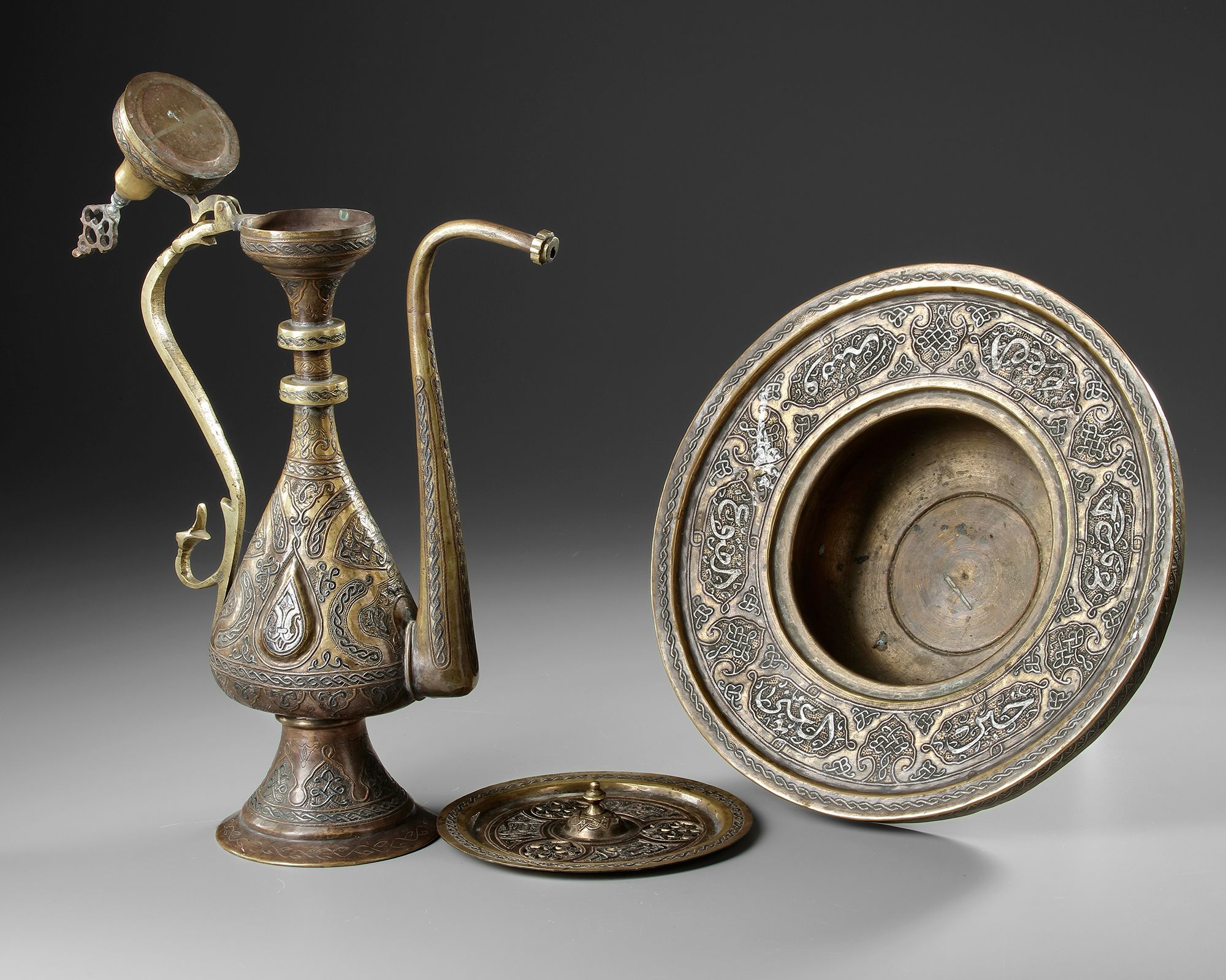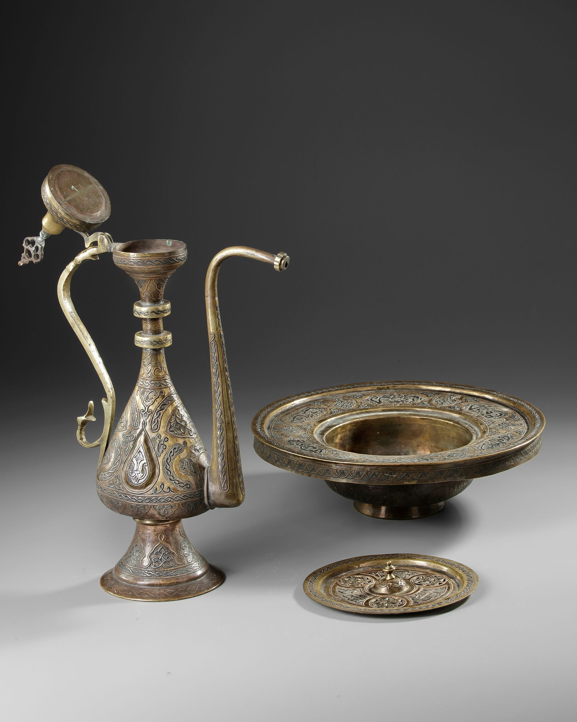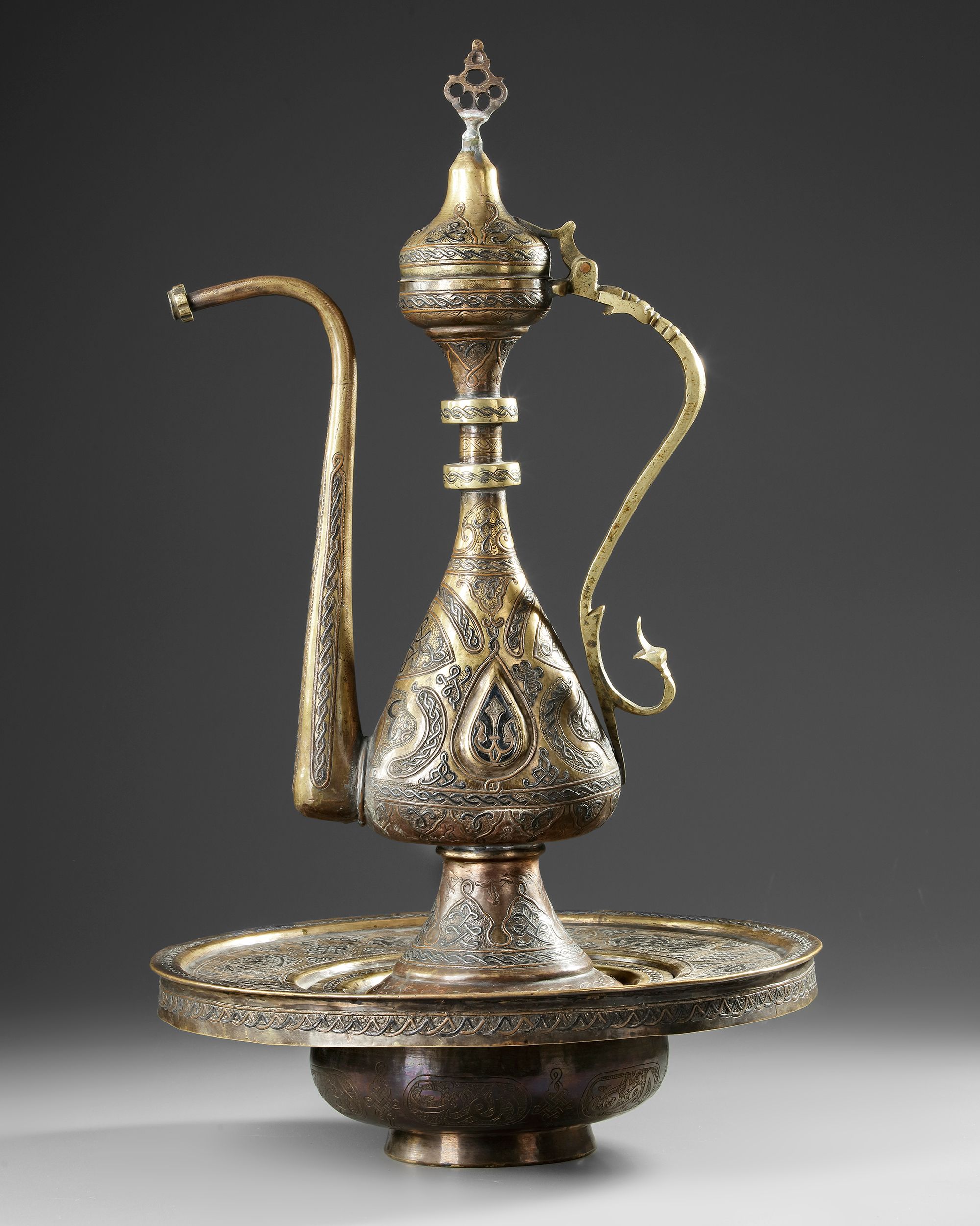 The ewer of conical form with curved gadrooned lower half, the flaring neck with raised ring, the hinged lid of domed form surmounted by pine cone, 's' shaped handle and spout, the basin of typical form with lifting openwork section, engraved with floral spray.