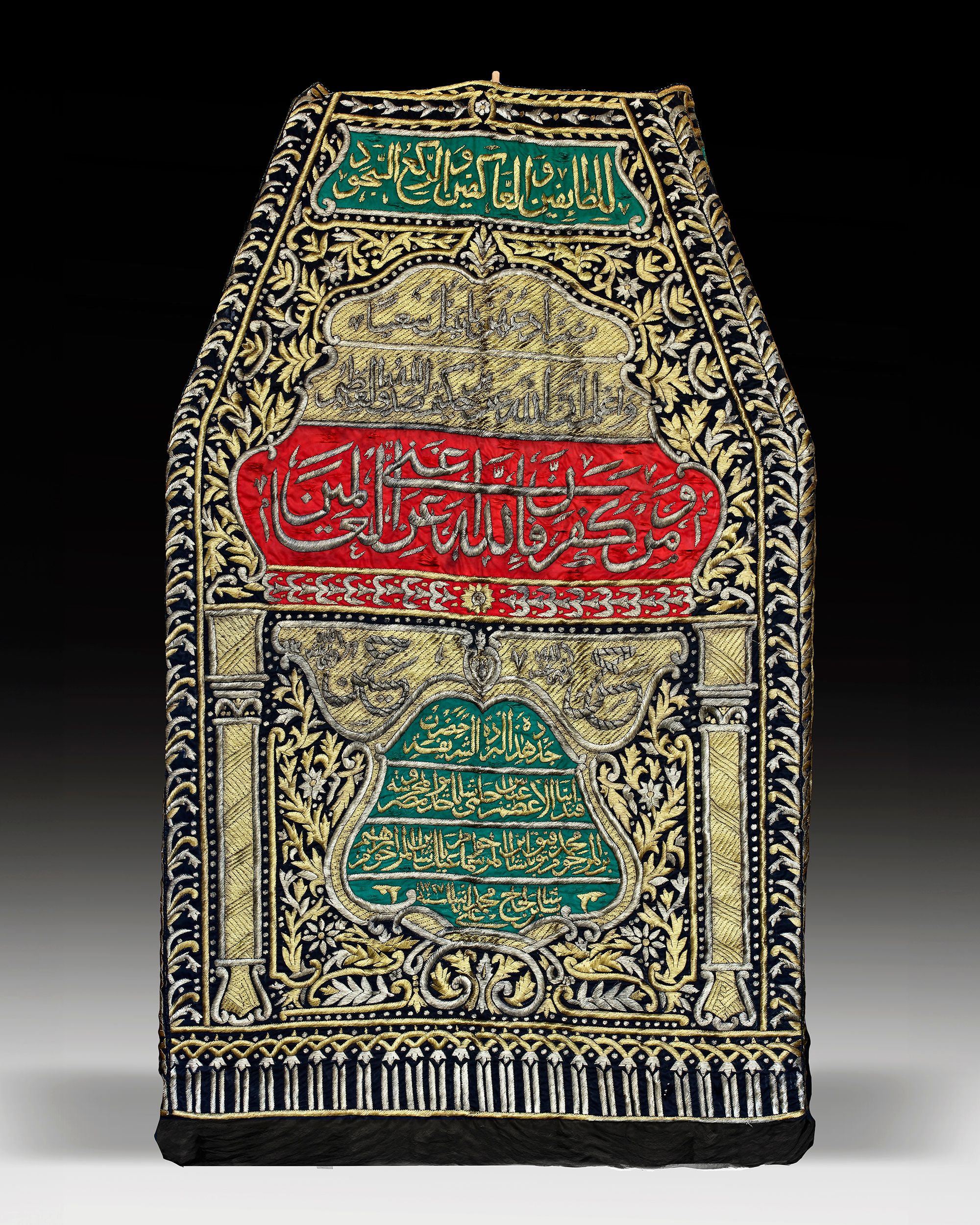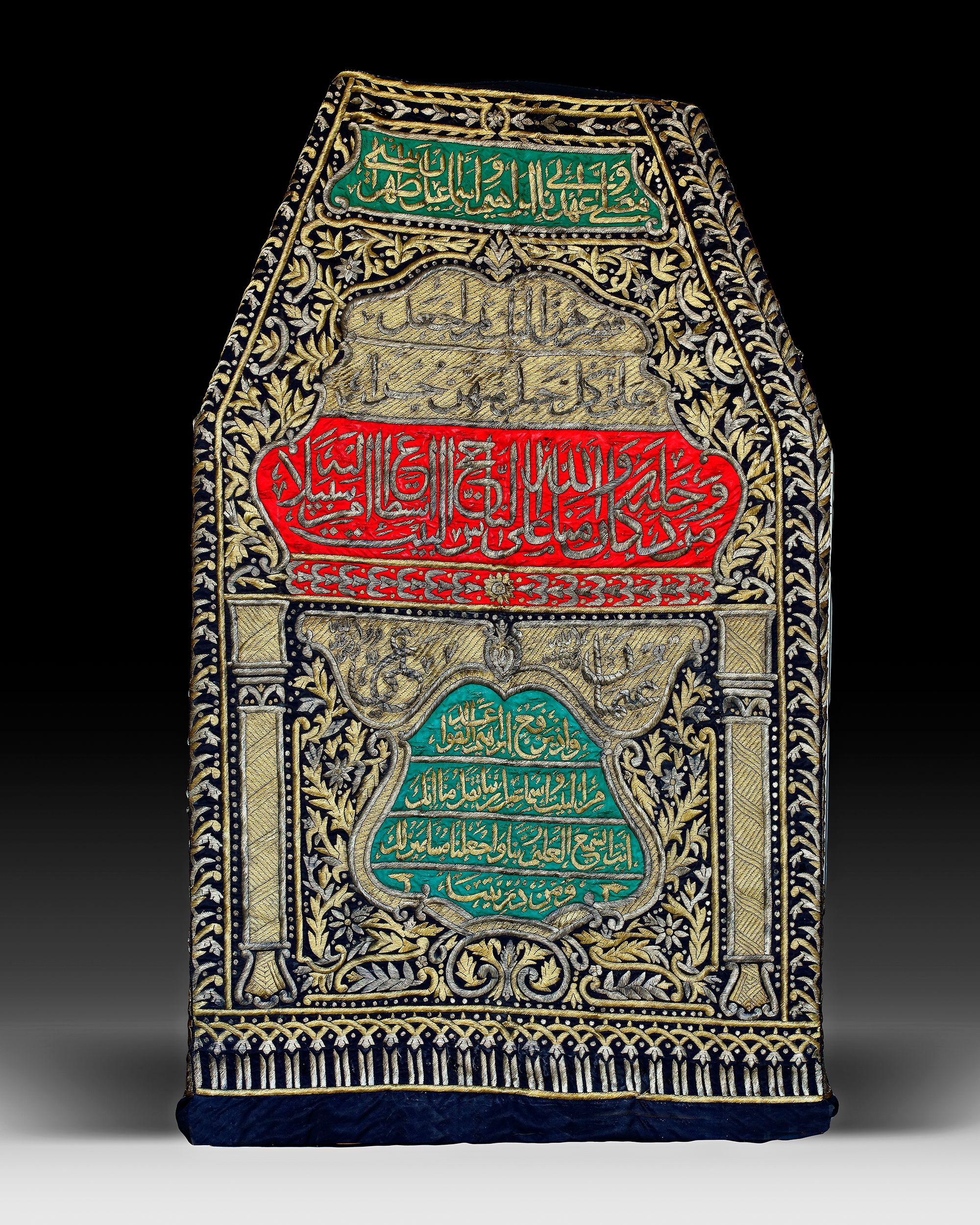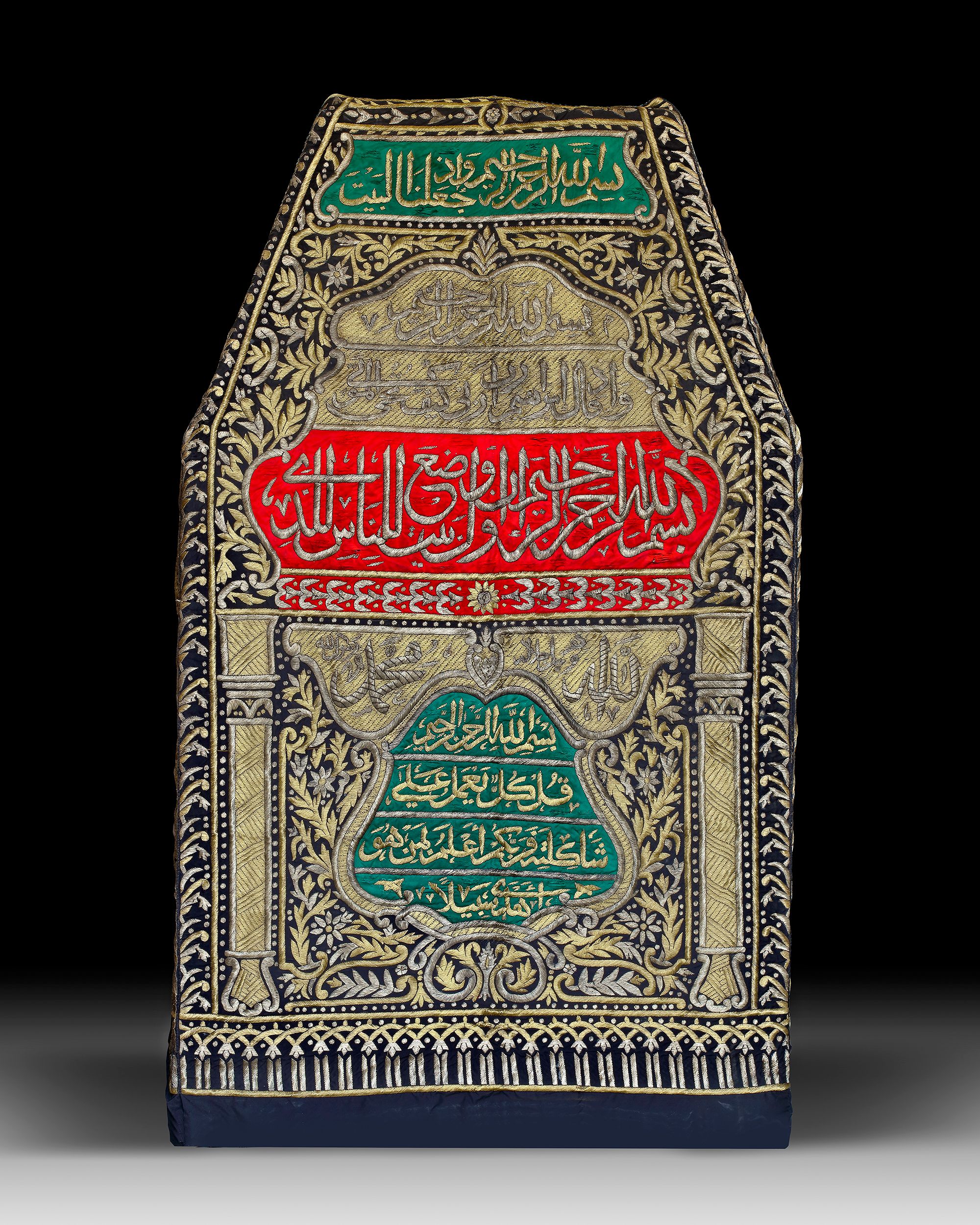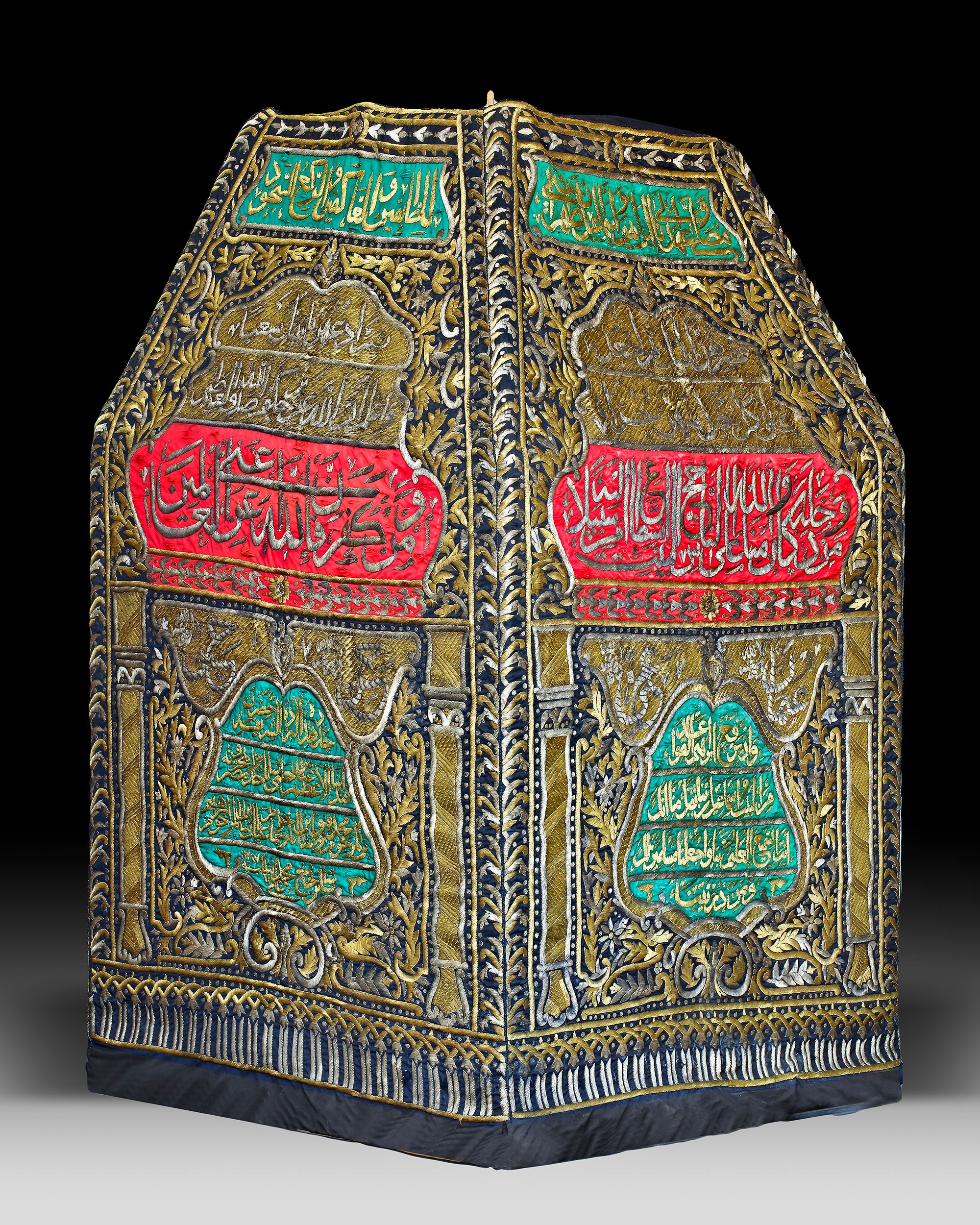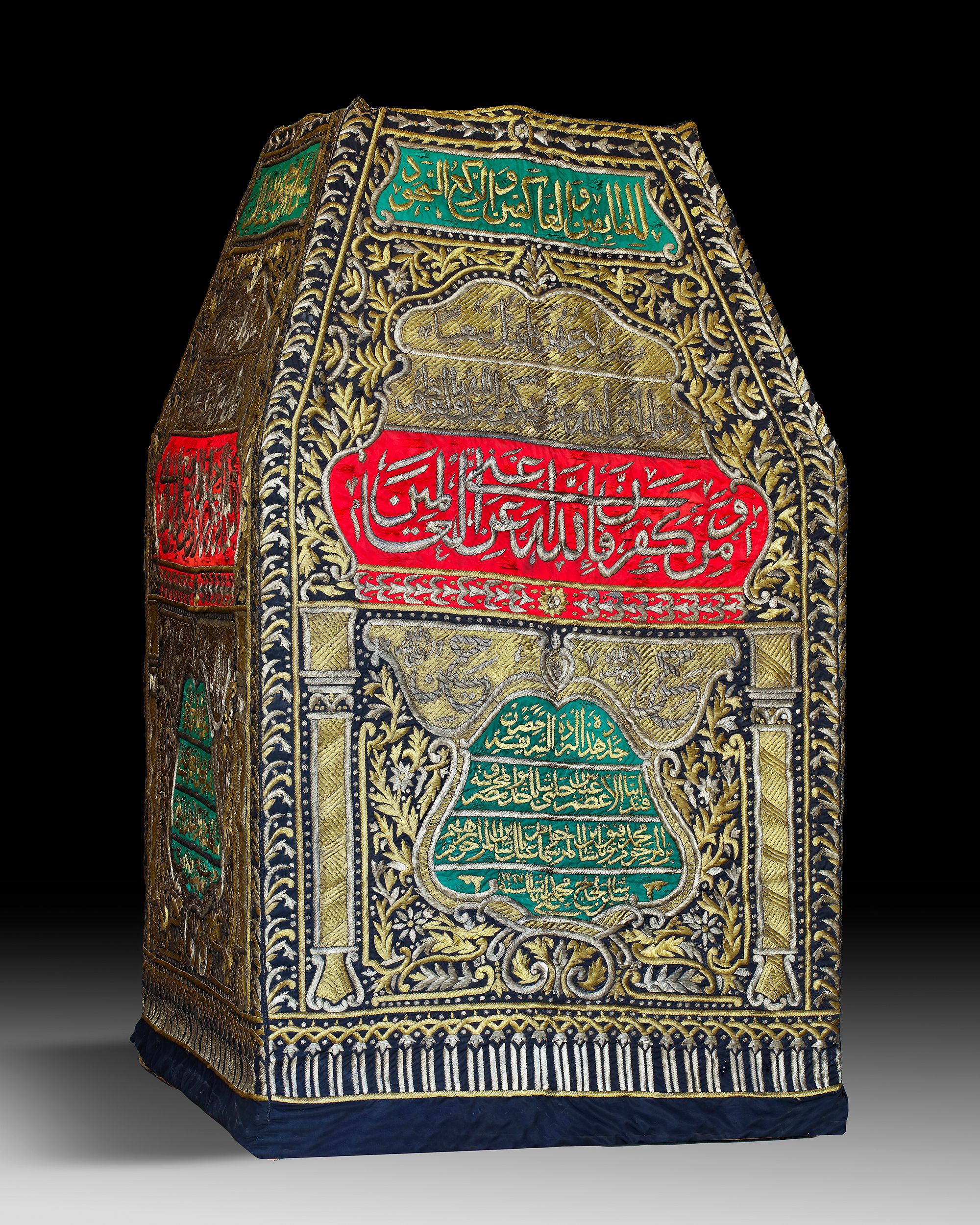 The lower cubic section surmounted by canopy in the form of a pyramid, of red, green and black silk profusely embroidered with silver and gilt-silver thread to each side. The black silk ground applied in silver-thread with several calligraphic panels of elegant naskh inscriptions against a dense floral ground, columns in the lower section. The border with a band of interlocking palmette motifs.