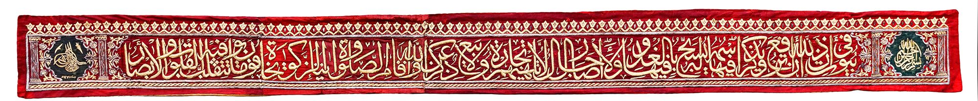 A metal thread calligraphic band for the tomb of the prophet (Hujrat Al-Qabr Al-Nabawi Al-Sharif) in Medina, of elongated rectangular form, the red ground embroidered with silver and silver-gilt metal threads, with a calligraphic frieze bordered by minor bands of scrolls and chain pattern, at the left the large silver tughra of Abdulmejid I between two columns, at the right a large inscription in thuluth script of the Basmallah, flanked by floral sprays. Inscriptions: v. 36-v.37 from surah al-Nur Tughra of the sultan Abdulmejid I and dated 1271AH/ 1854AD 45 by 550 cm.