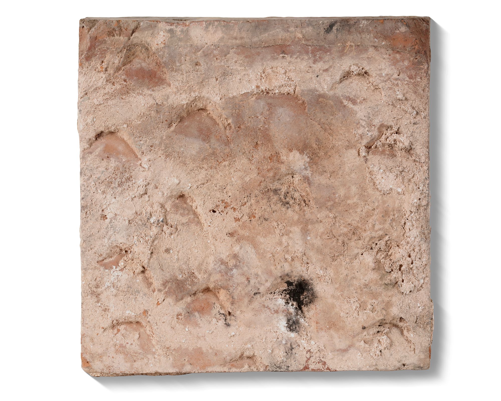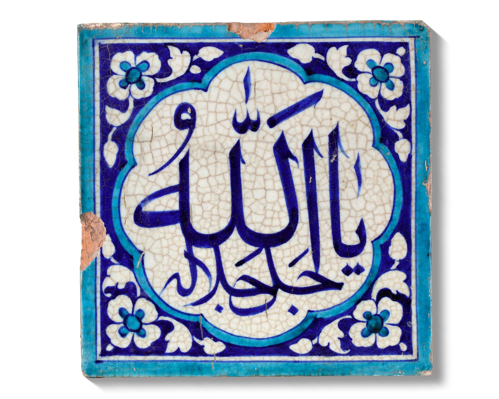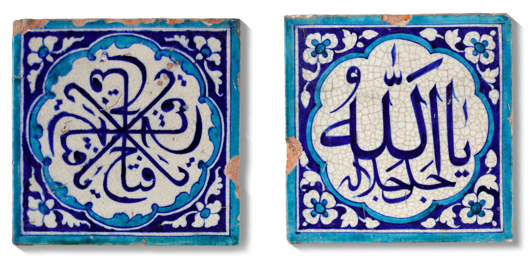 Each of square form, decorated in cobalt blue and turquoise on a white ground with a flower head enclosing inscriptions with smaller flower sprigs in the corners.