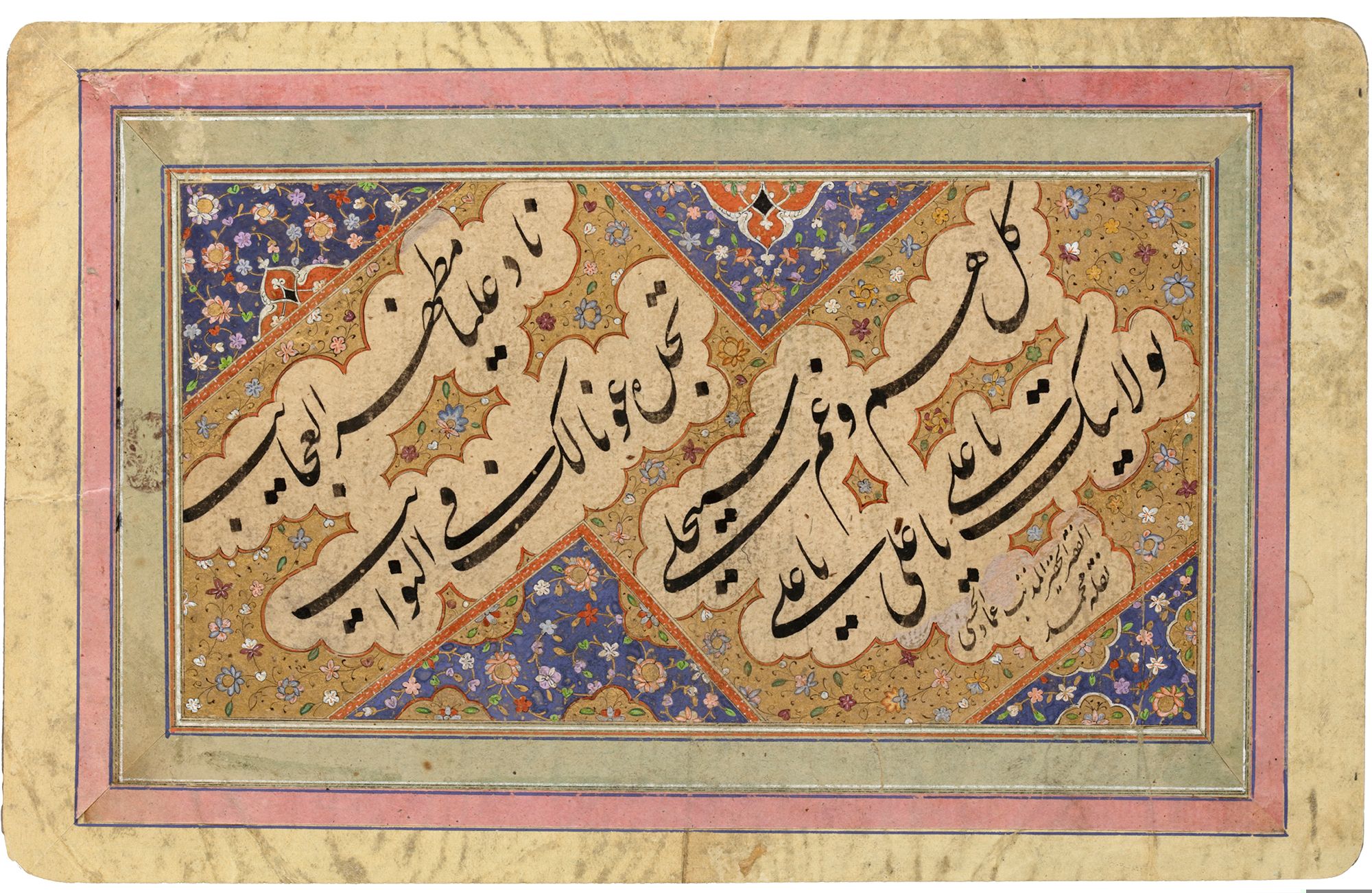 Gouache colour heightened with gold on paper, consisting of four lines of strong Nasta'liq script ( Nada Ali) within cloud bands, set against a gilt ground of scrolling flowers and foliage, signed in the corner with '' copied by Muhammed after Imad al-Husayni'', ruled with a blue margin decorated with gilt flower scrolls, glued on cardboard.