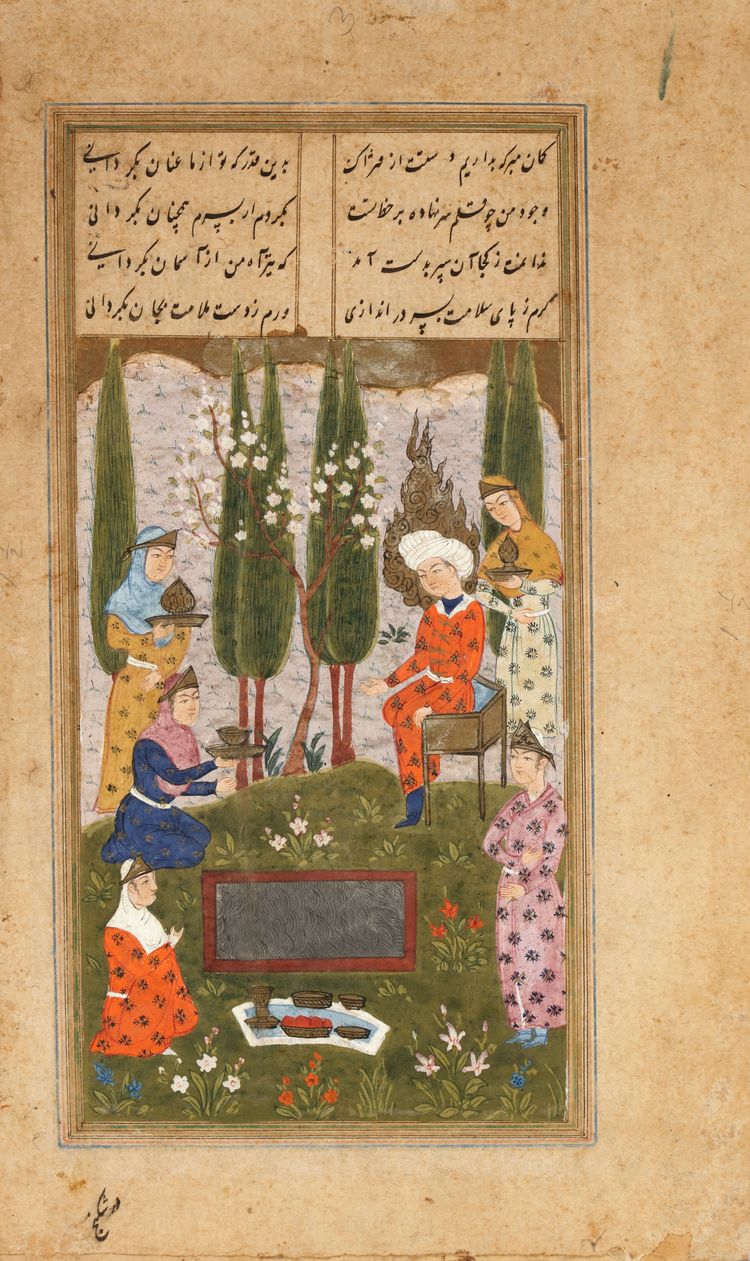 Gouache and gold on paper, four lines of text written in nasta'liq script in black ink in four columns, depicting a prophet seated in a landscape with attendants, inner margins ruled in blue and gold.