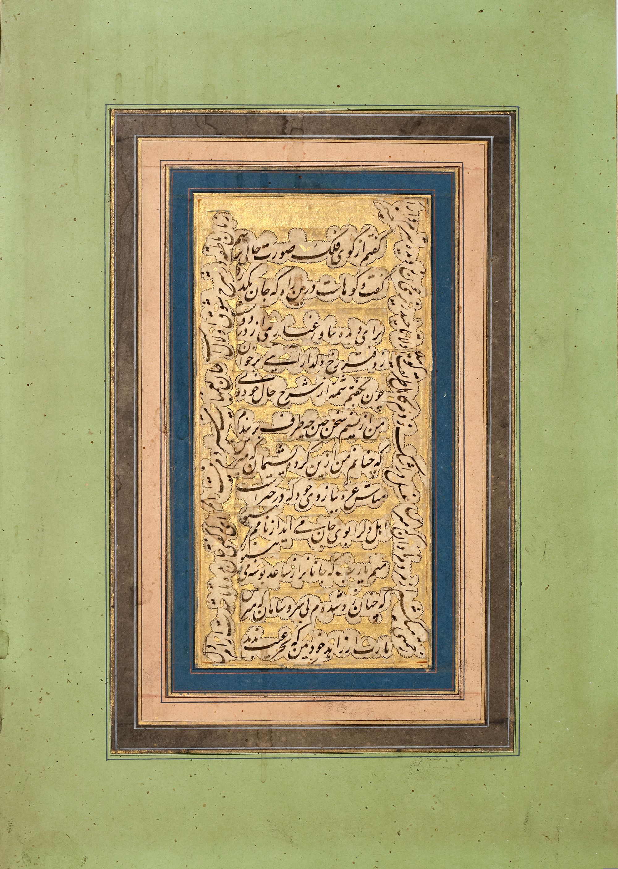 Persian manuscript on paper, 12 lines of text in nasta'liq script in black written horizontally and 2 lines written vertically in black ink within cloud bands against a gold ground, ruled in gold and polychrome borders, laid down on an album page.