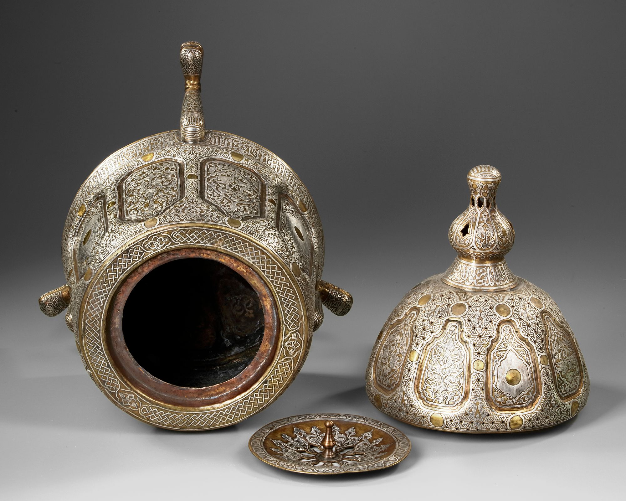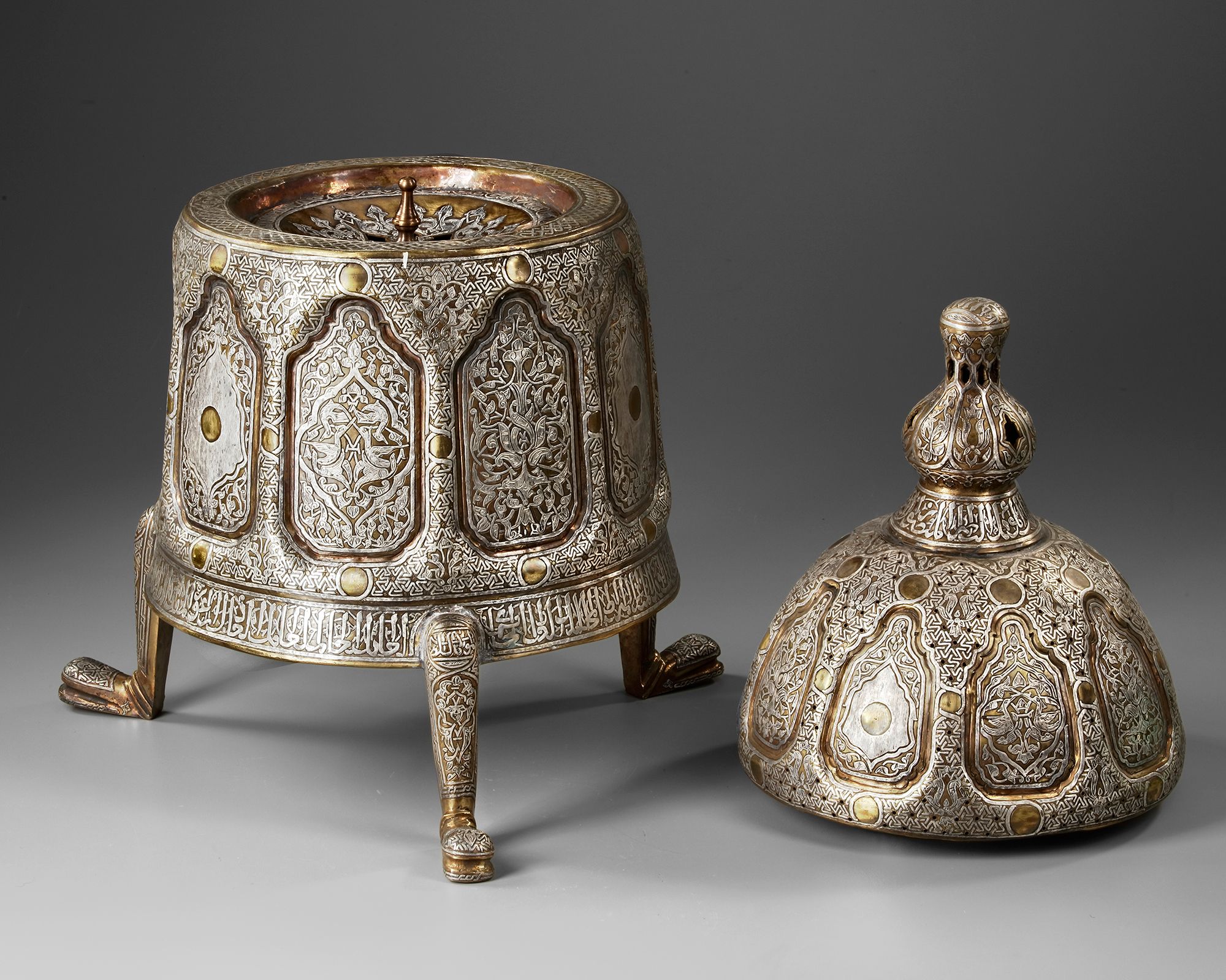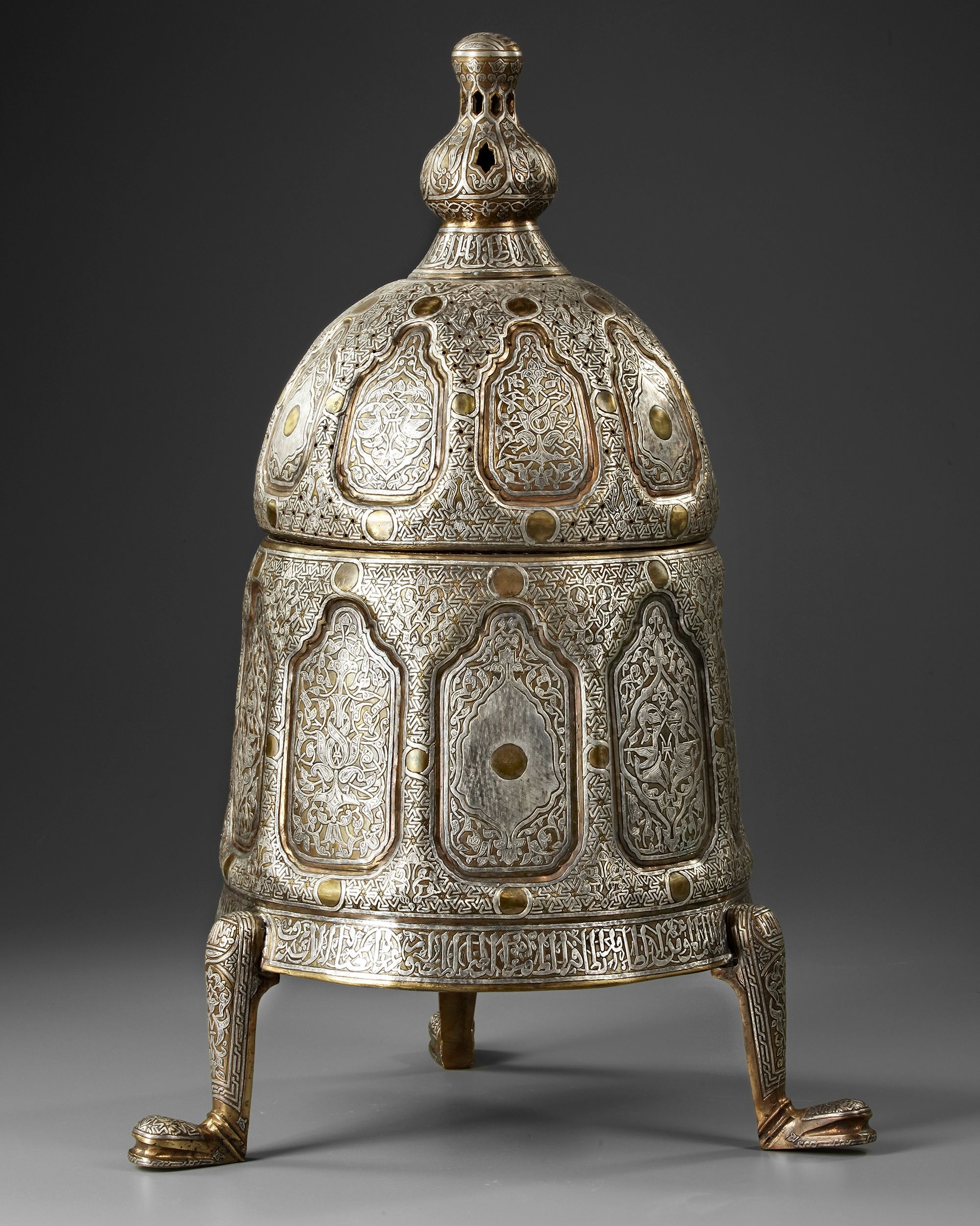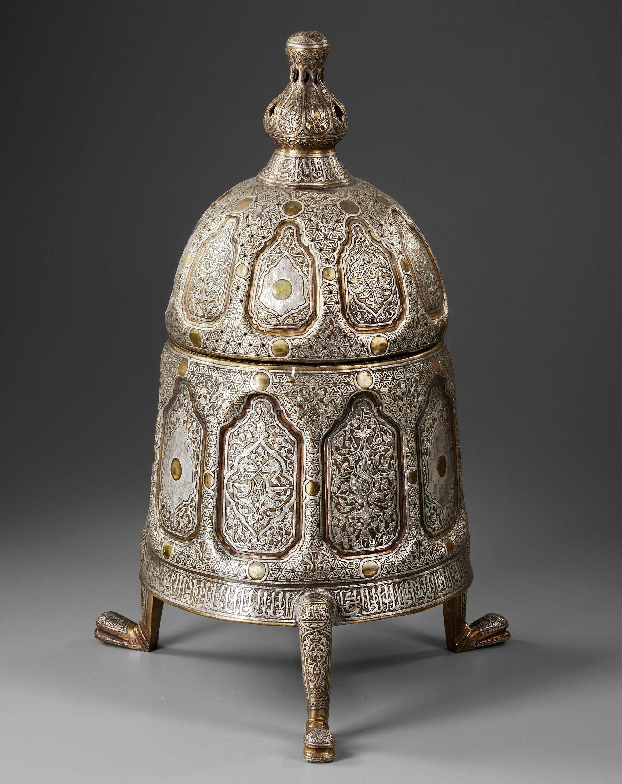 A brass incense burner of a wide tubular body richly decorated with silver inlays, resting on three feet with stylised floral and vegetal motifs. The pierced domed lid with a knob shaped as a flower bud is engraved with interlocking patterns and calligraphic cartouches. Inside there is an open-work holder with a central star motif to place the incense on.