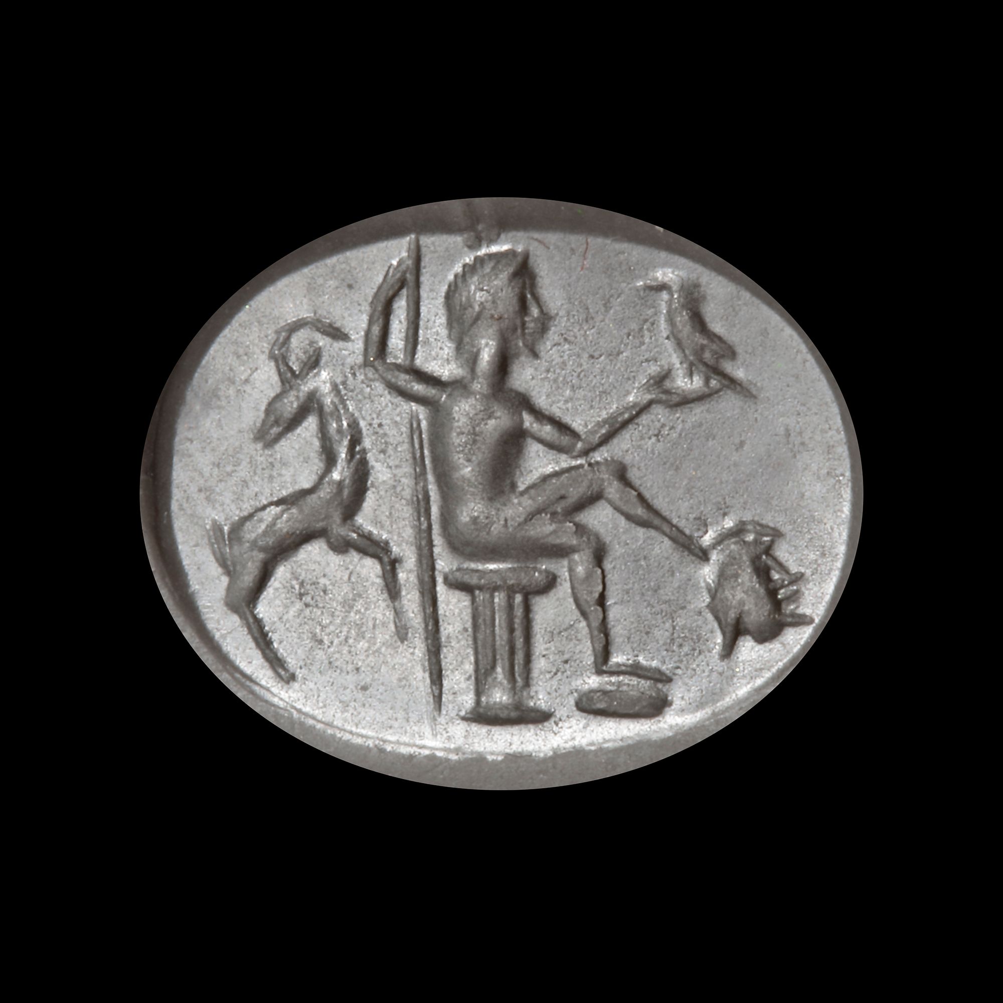 A Roman carnelian intaglio showing Jupiter seated holding an eagle, his foot resting on a head. Behind him stands a goat.