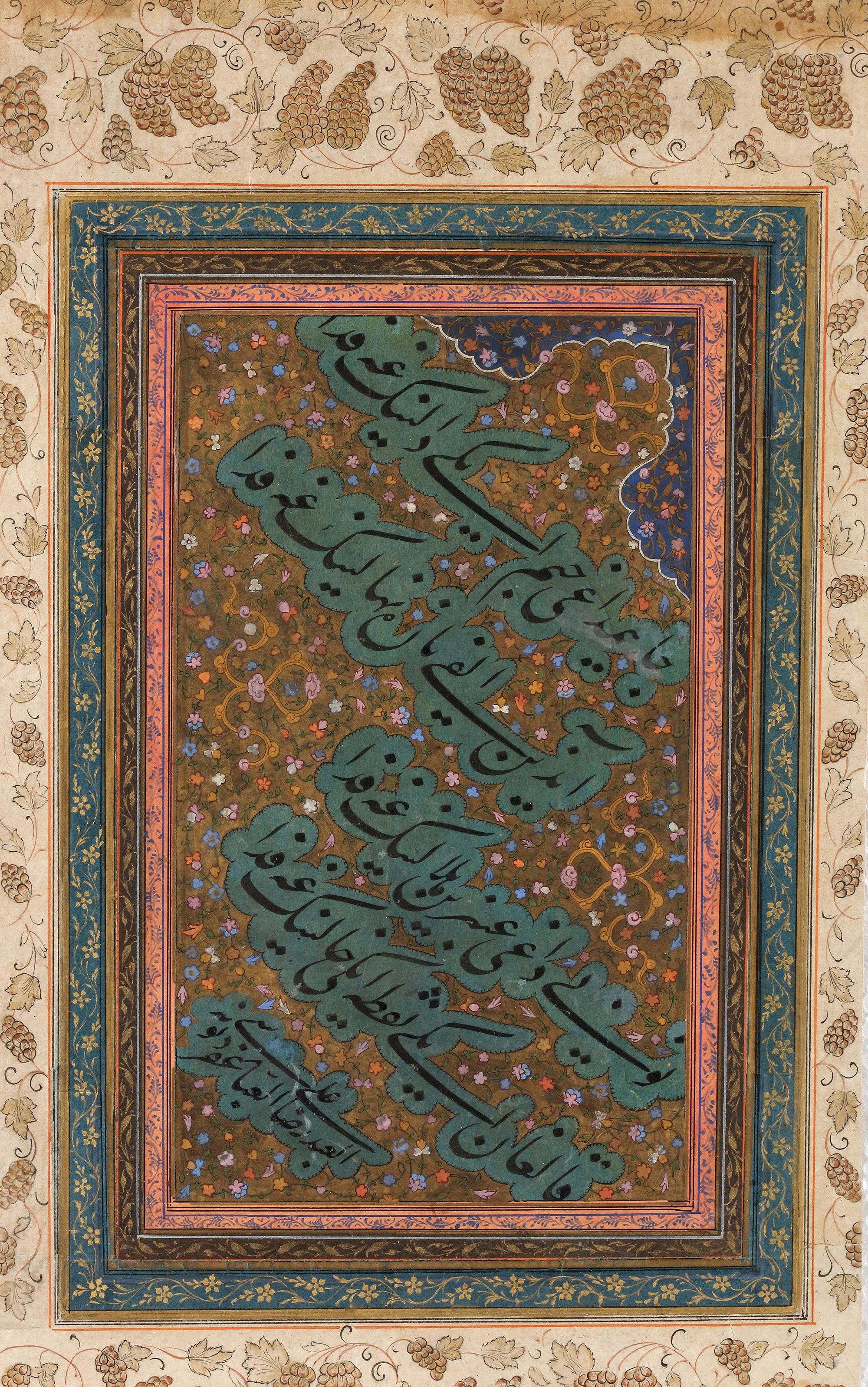 Persian manuscript on paper, 4 lines of text in large nasta'liq script in black ink within cloud bands against a finely-illuminated ground of interlacing polychrome flowers, signature in lower corner piece, laid down on an album page bordered in red, brown and deep green illuminated borders, with outer margins filled with large fruiting stems.