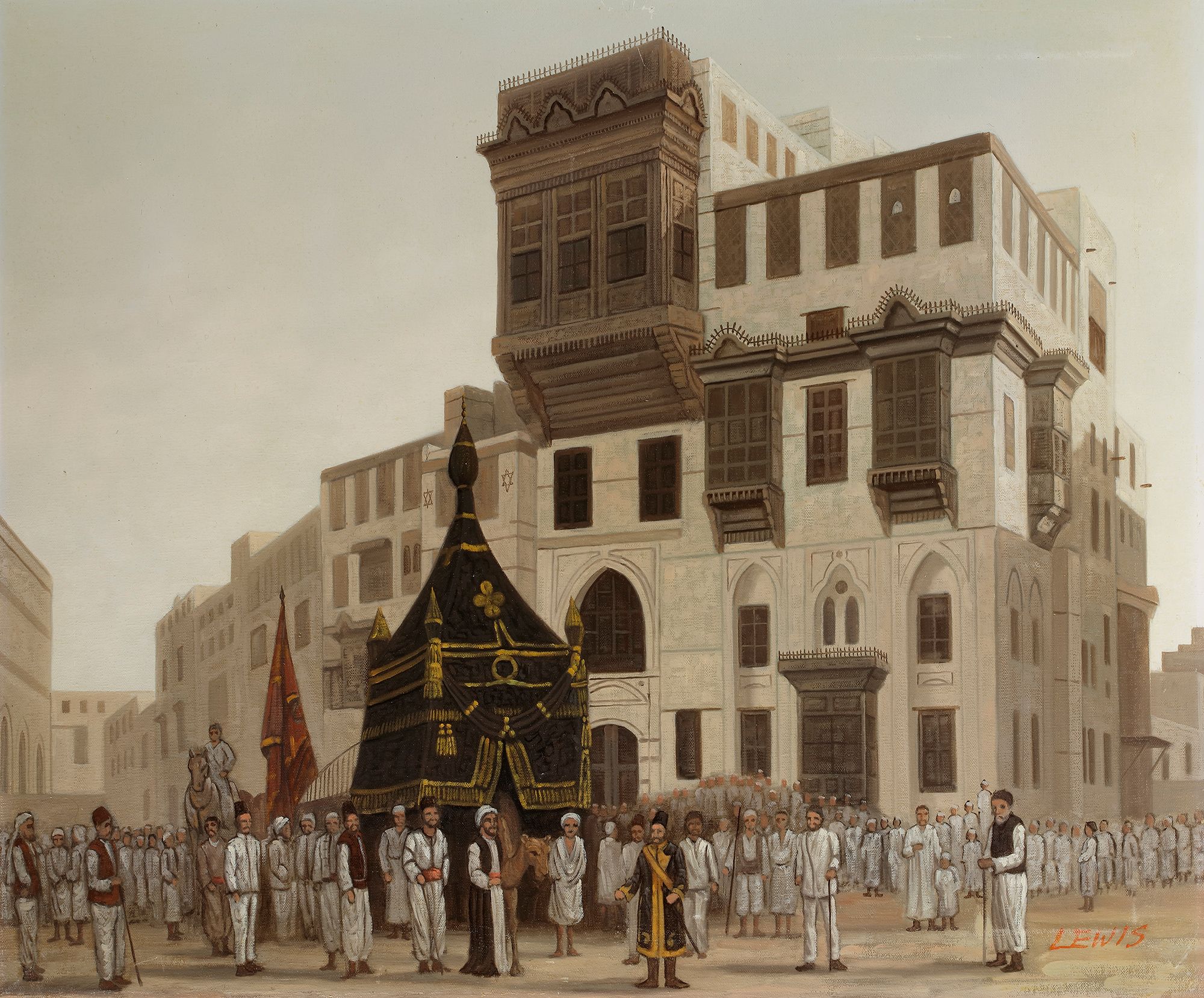 Oil on canvas depicting a scene of the Mahmal in Egypt before the journey to Mecca. Signed in the lower corner, Lewis