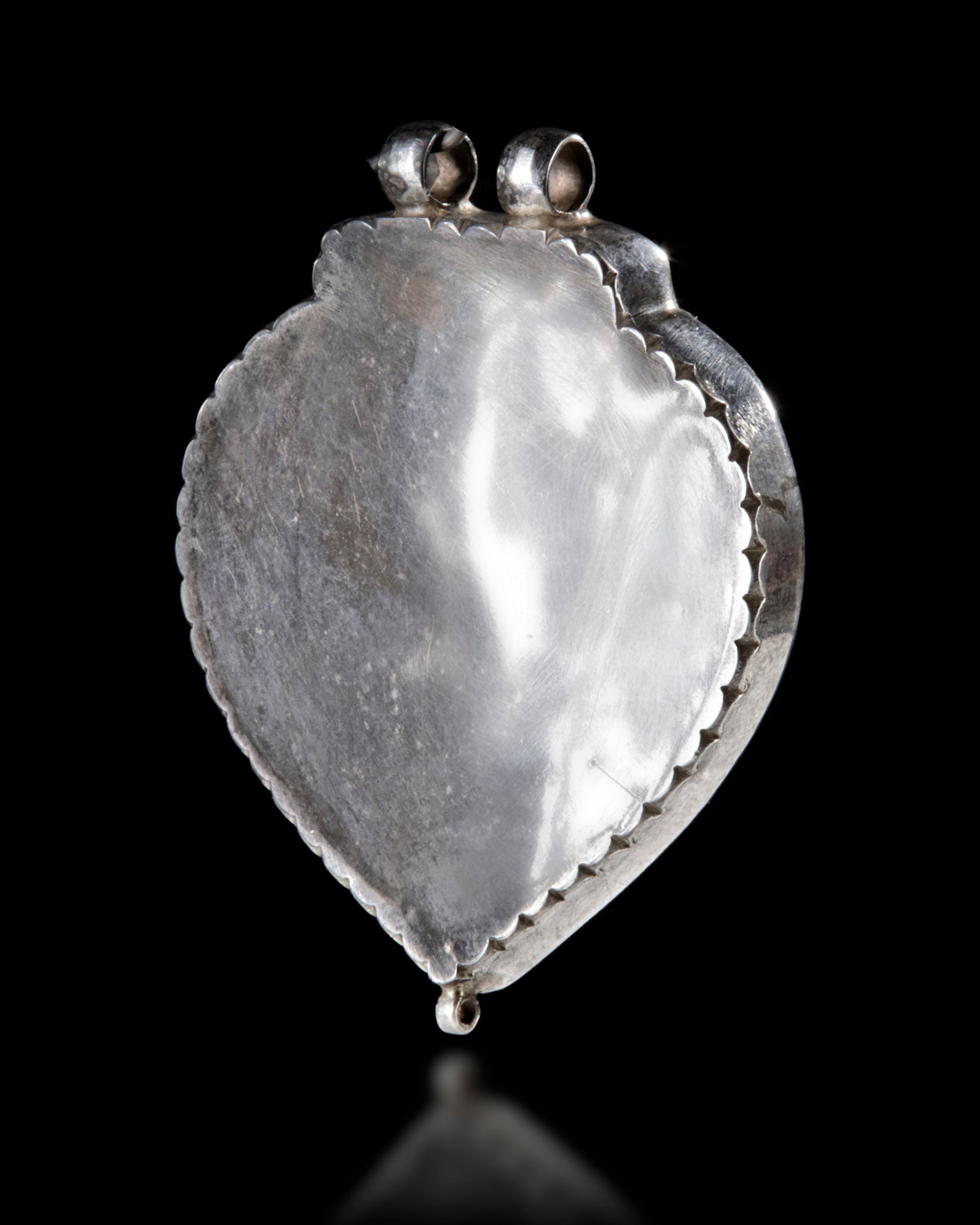 Of drop shape, the jade surface carved with 7ll. of extremely elegant nasta'liq with occasional floral flourishes, the final line dated, silver mounted.