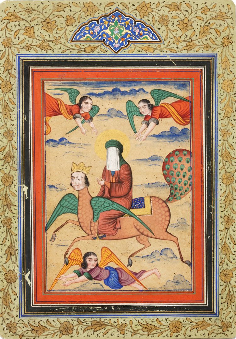 Gouache colours heightened with gold on paper, depicting the Miraculous Night Journey of the Prophet Muhammad, with the veiled Prophet Muhammad riding his steed Buraq in a halo of flame, surrounded by angels against a turbulent night sky, ruled with polychrome borders. The margins decorated with gilt floral eafy scrolls.