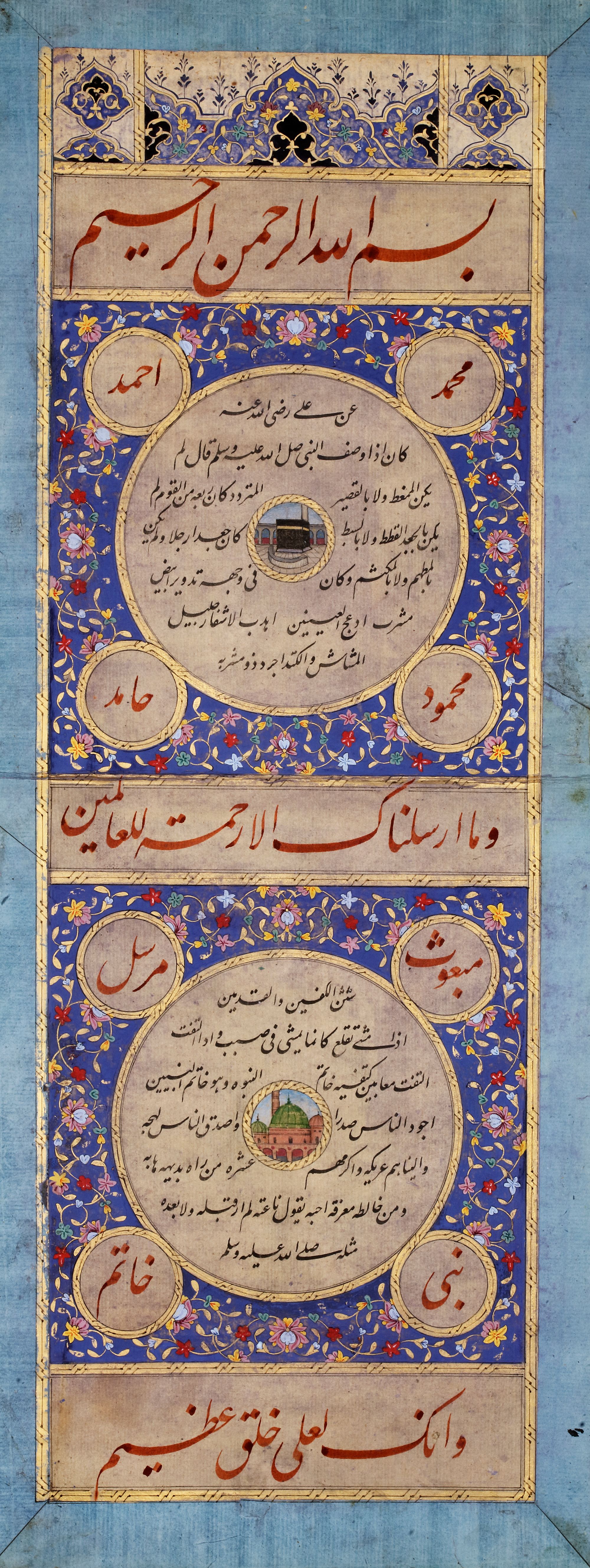 Single leaf, text panel at the top with the blessing in a single line, two large circular text-blocks with 7 lines in black ink, each with 4 circular devices extending outwards from this with attributed names of the prophet. with gilt and polychrome floral decoration on a blue ground.