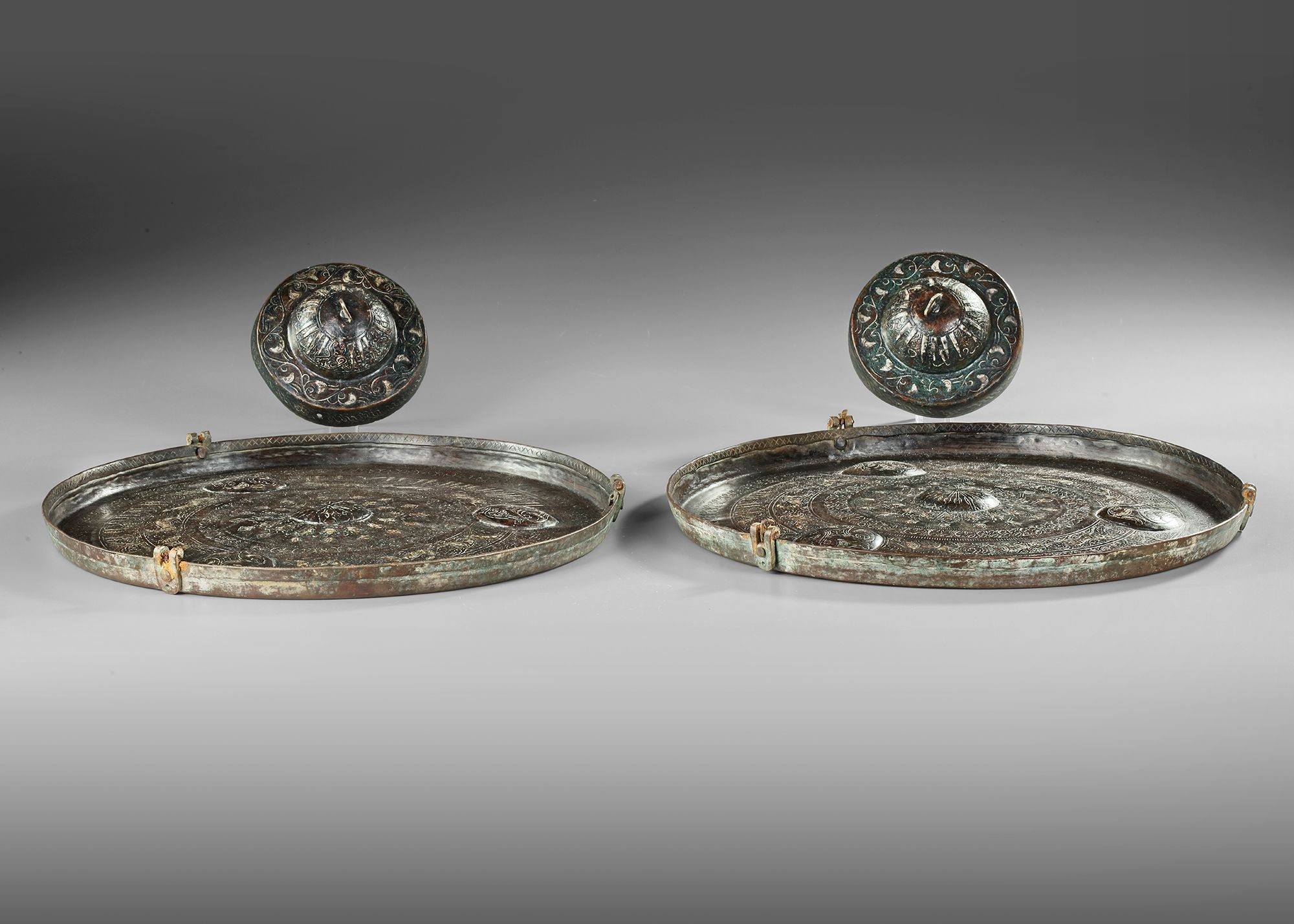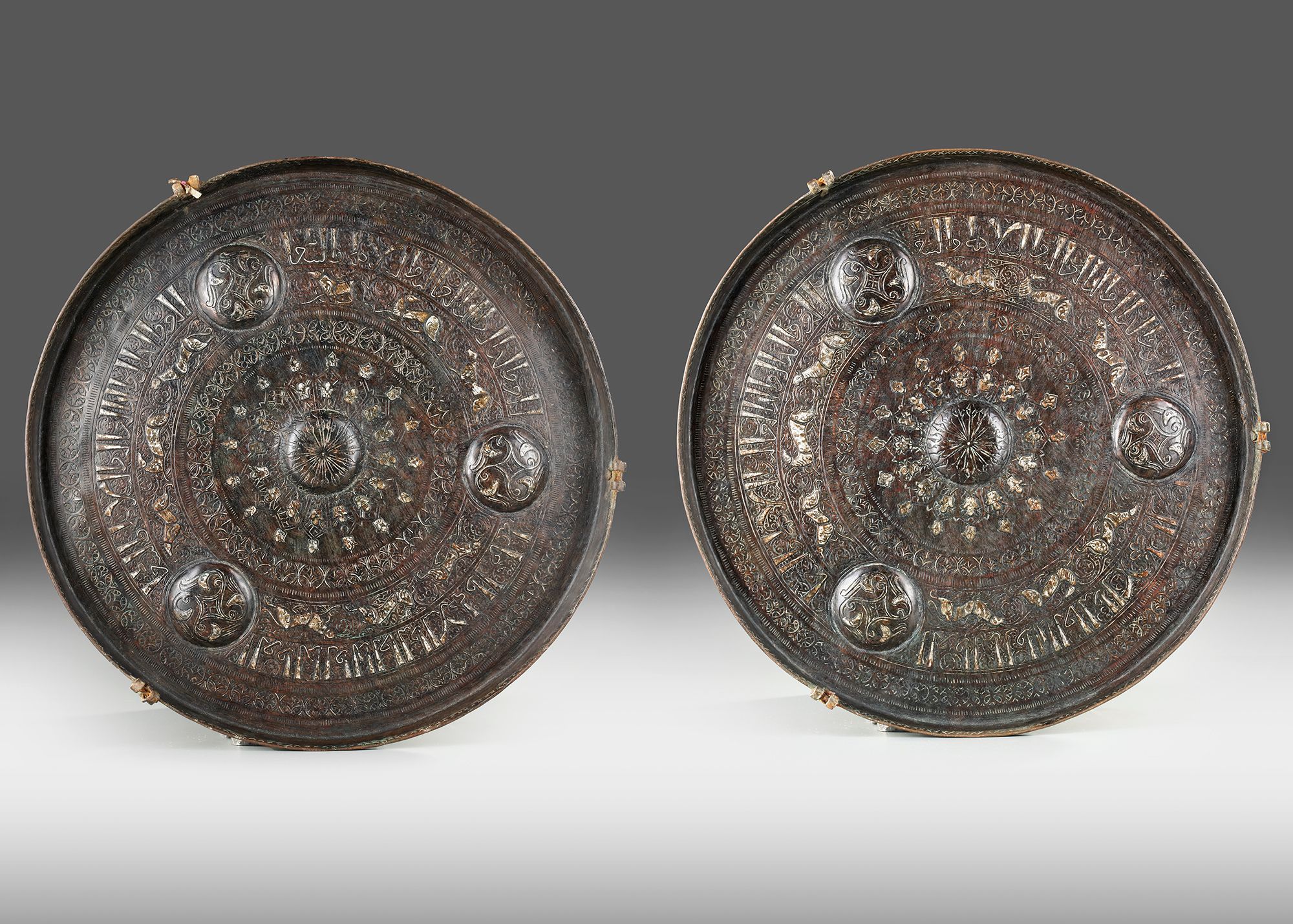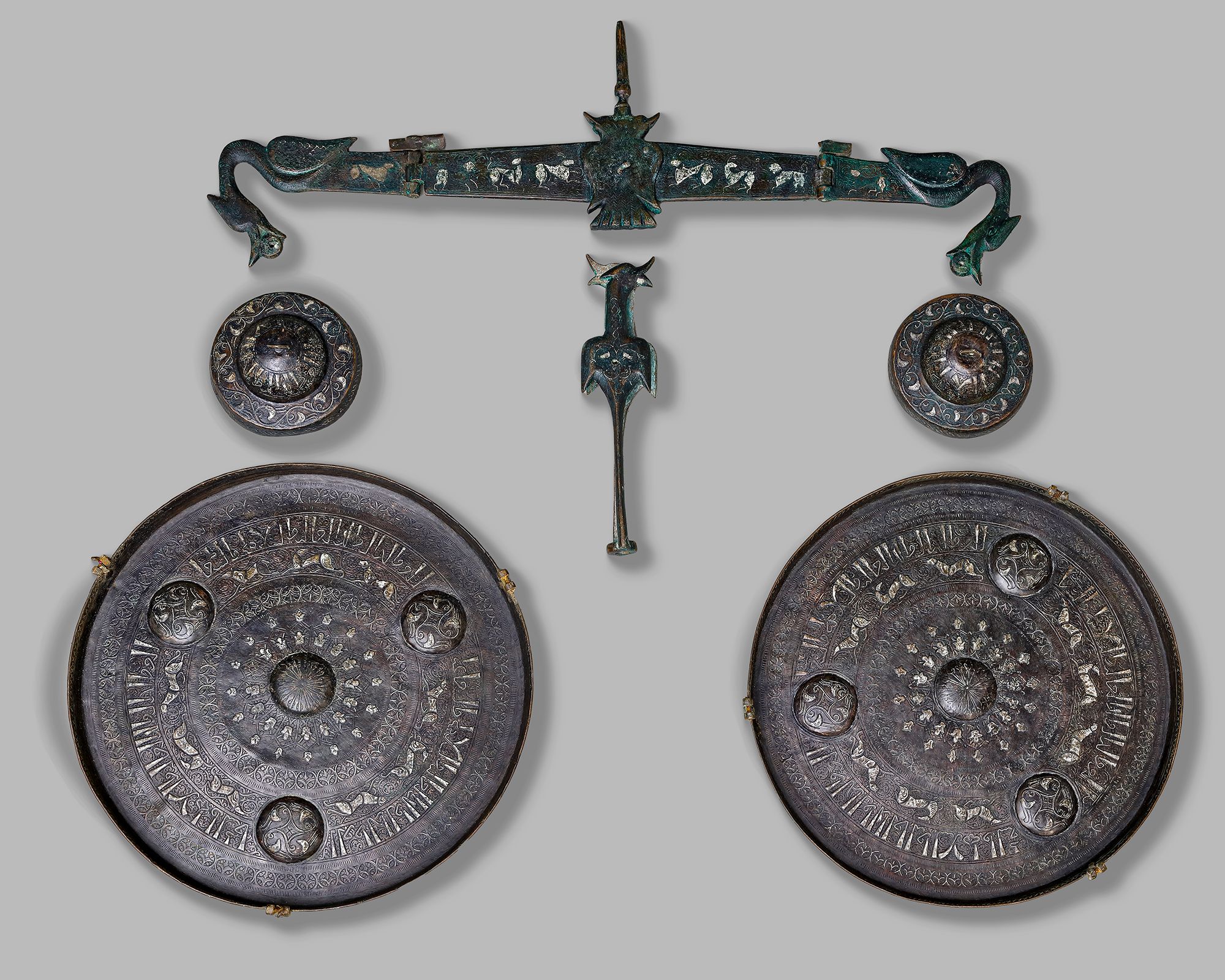 A highly important pair of balance scales from Khorasan in bronze with silver inlays. The ensemble consists of : two circular weighing pans with shallow edges, two domed bosses with suspension loops and three piercings for the chains, the balance bar which is hinged for storage with a central bracket to connect to the supporting strut for attaching the balance on a support.