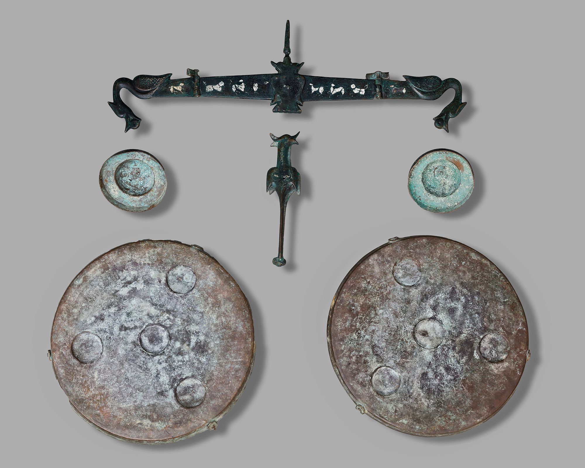 Dimensions : Pans 37 x 2 cm. : bosses. 12.4 x 6.4 cm : balance bar : 69.3 x 23 cm : support bracket : 26.2 x 6 cm material. : Bronze with silver inlays.