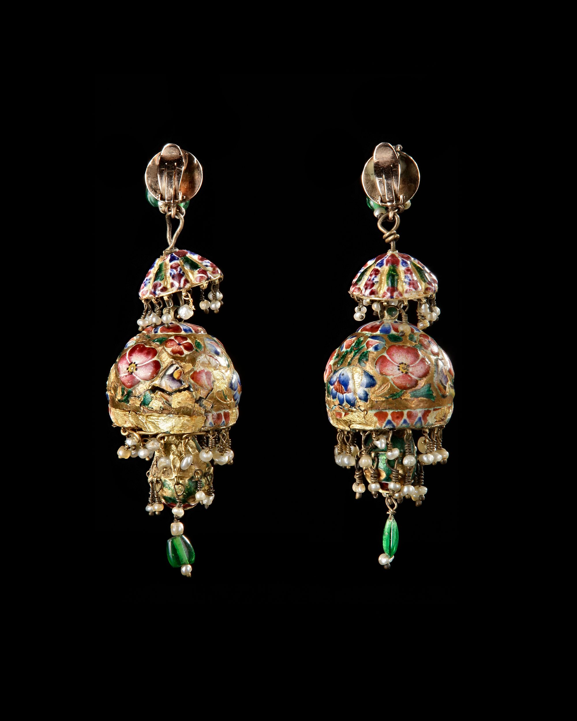 Lot 140A PAIR OF QAJAR GOLD AND ENAMELLED PENDANT EARRINGS, PERSIA, 19TH CENTURY