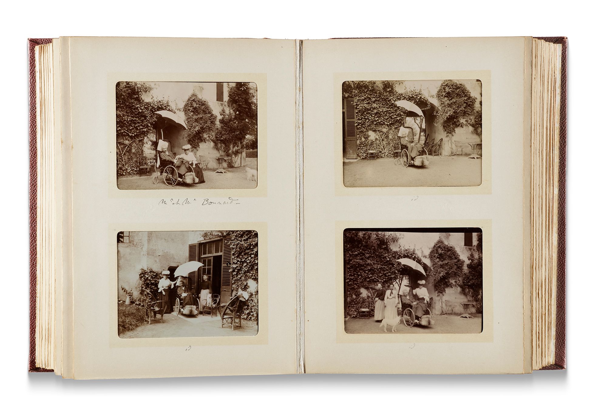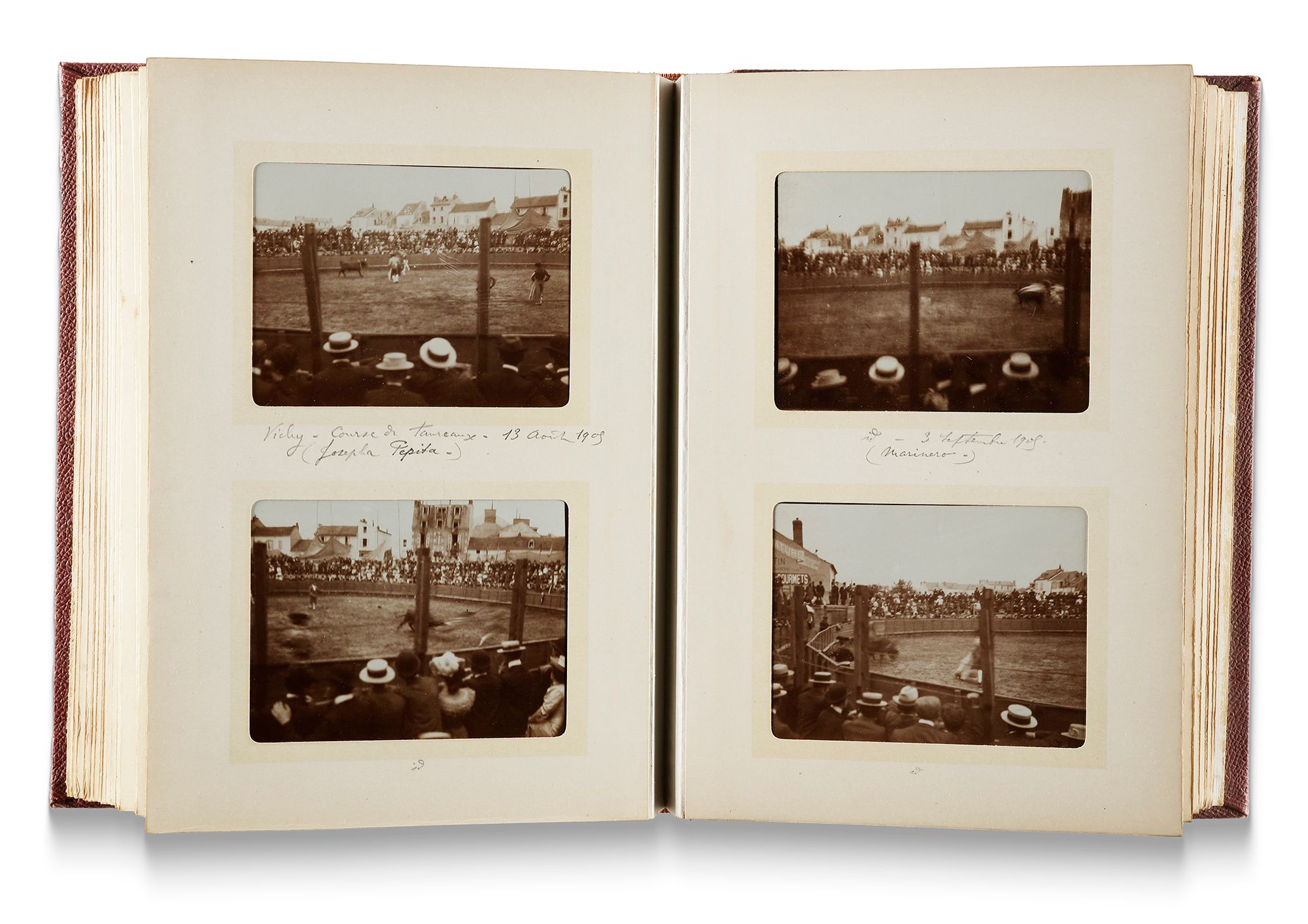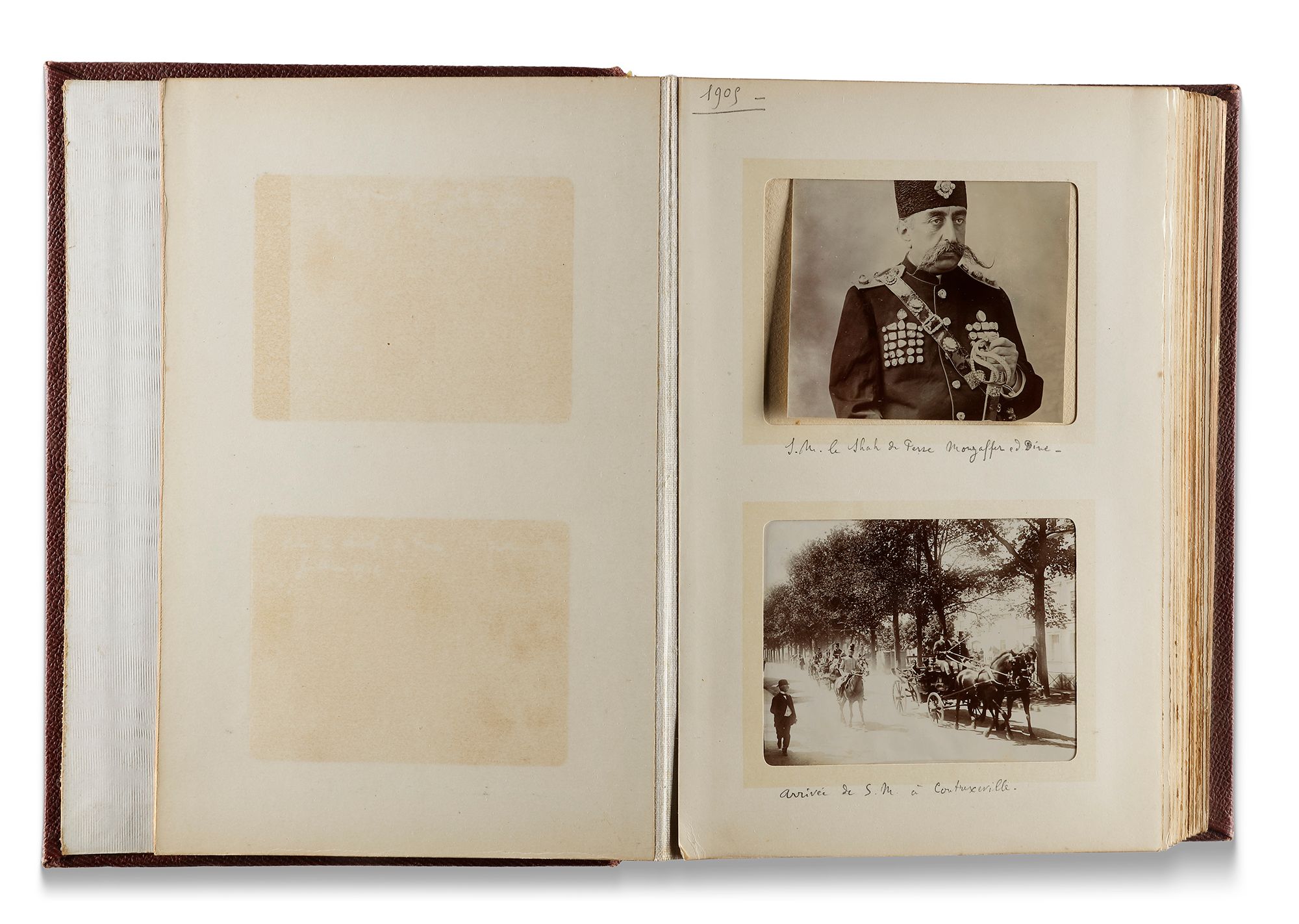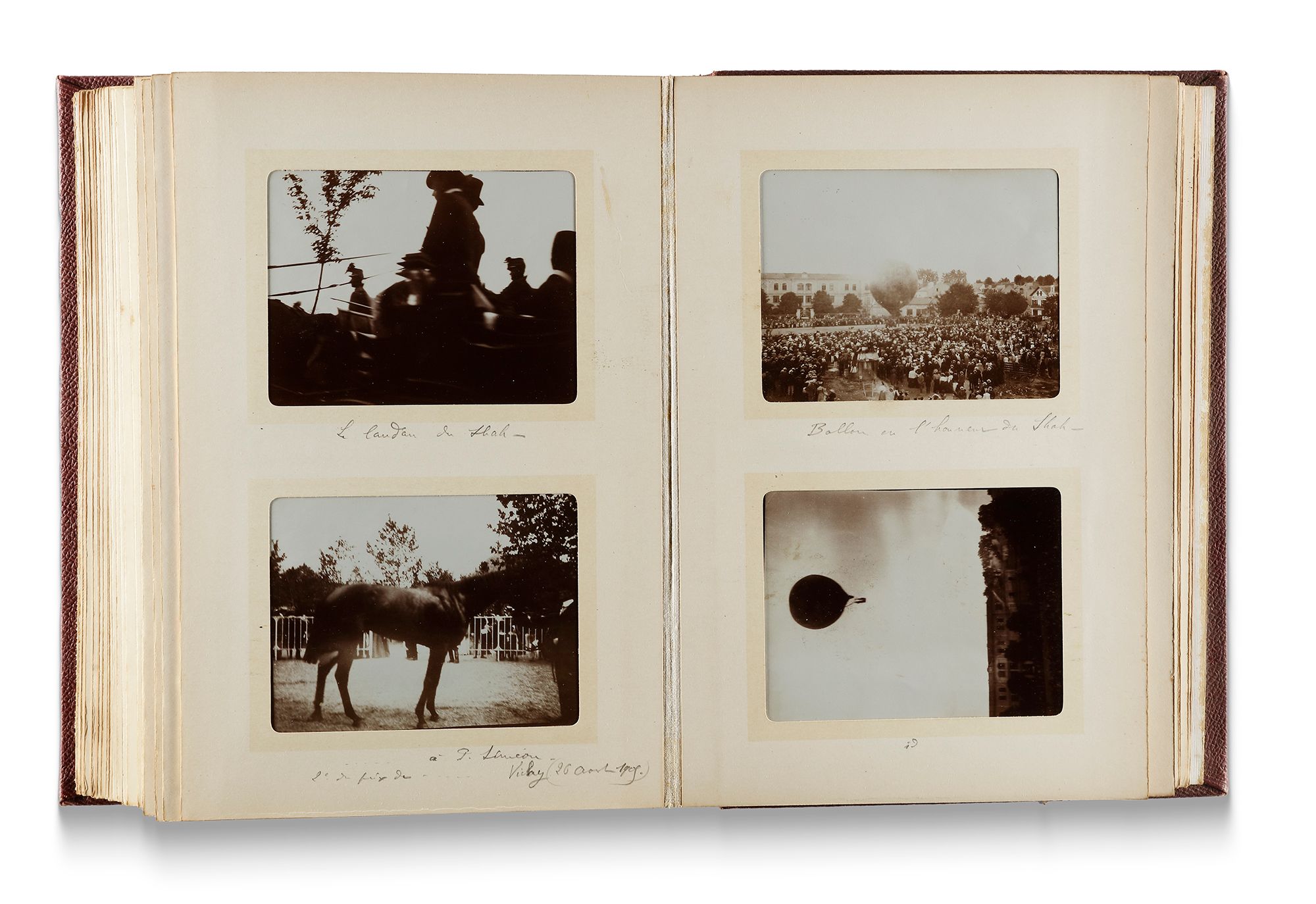 Photographic album including view of Crontexéville, Vichy, equestrian photos, visit of the Shah of Persia Mozaffareddine. This photographic album shows moments from the visit of Mozaffareddine Shah, the Shah of Persia, to France. It also contains a picture of the Shah using a hot air balloon during his journey. 90 photos
