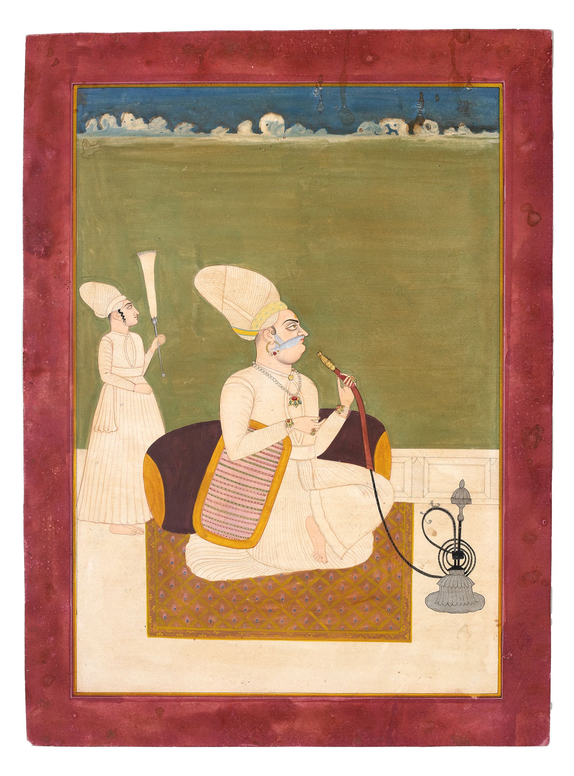 Gouache heightened with gold and silver on paper, a ruler, seated on a terrace, smoking a hooka, an attendant waving a morchal above him, applied red surround with orange and white rules.
