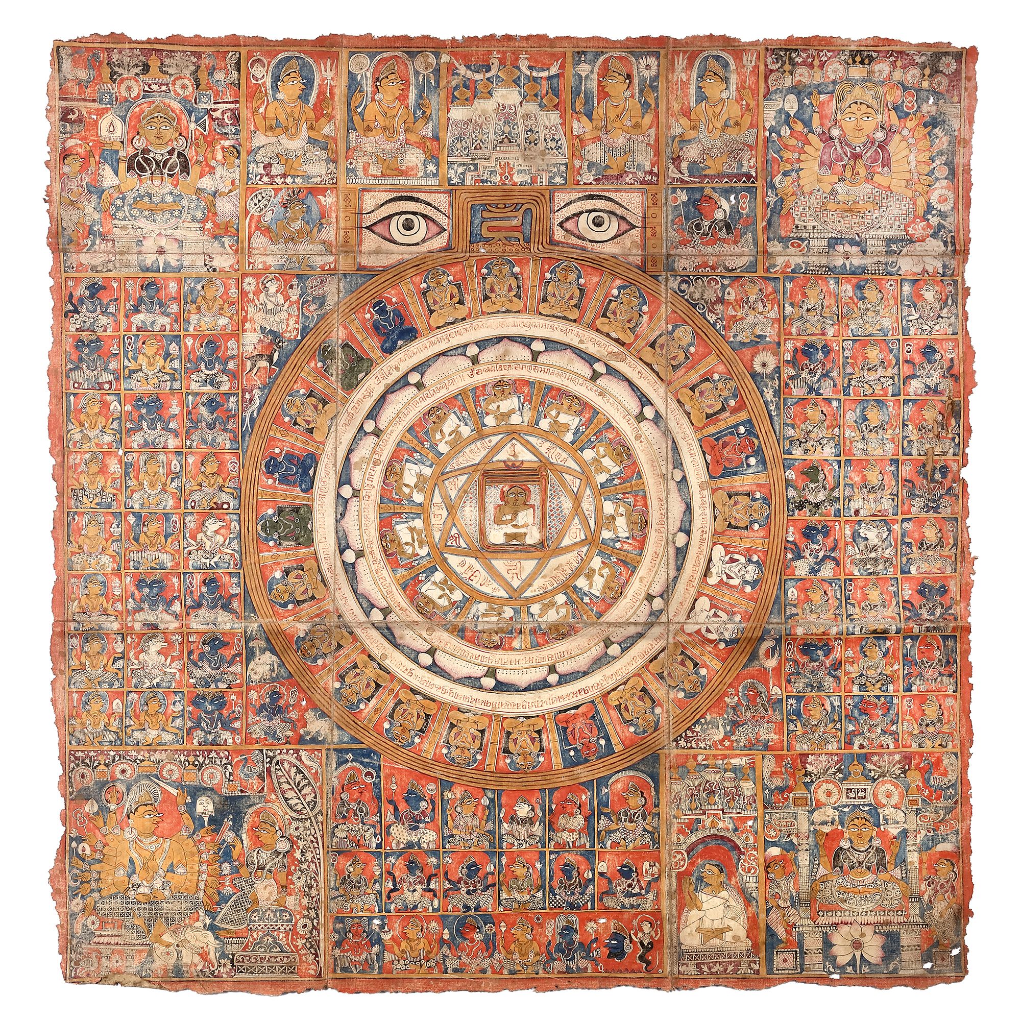 The present textile painting represents a central Jina within a lotus form mandala and Om-Hrim yantra, is the combined seed syllable of the universe. The borders comprise various Jain deities and images. Compare the work to another Jain mandala, depicting Parsvanatha, sold at Christie's New York 17 September 1999, lot 56 for $36,800 and more recently a similar textile depicting life stories of Parsvanatha, sold at Christie's New York, 27 September 2023, lot 527 for $18,900 and 20th March 2024 for $ 44,100